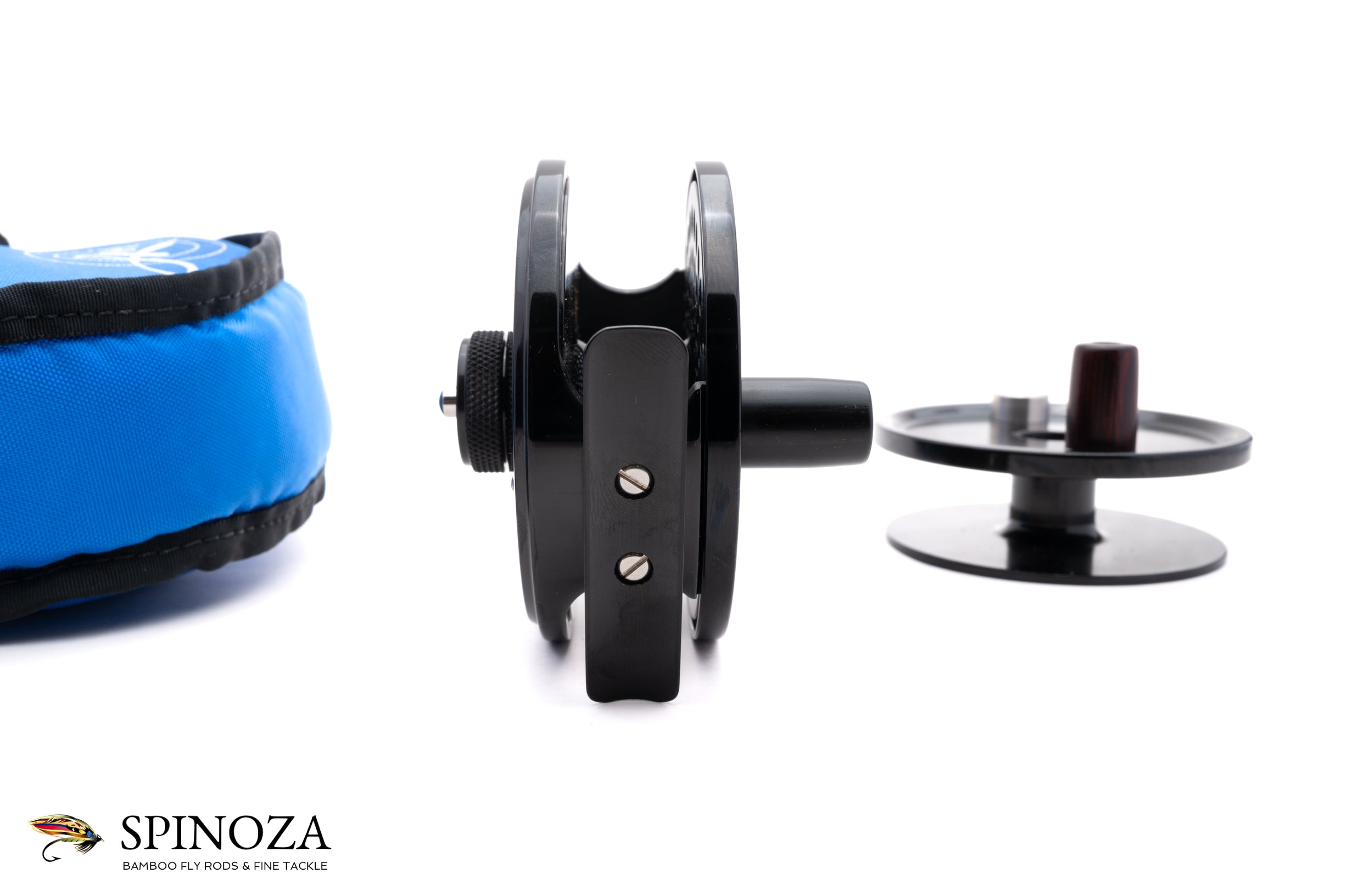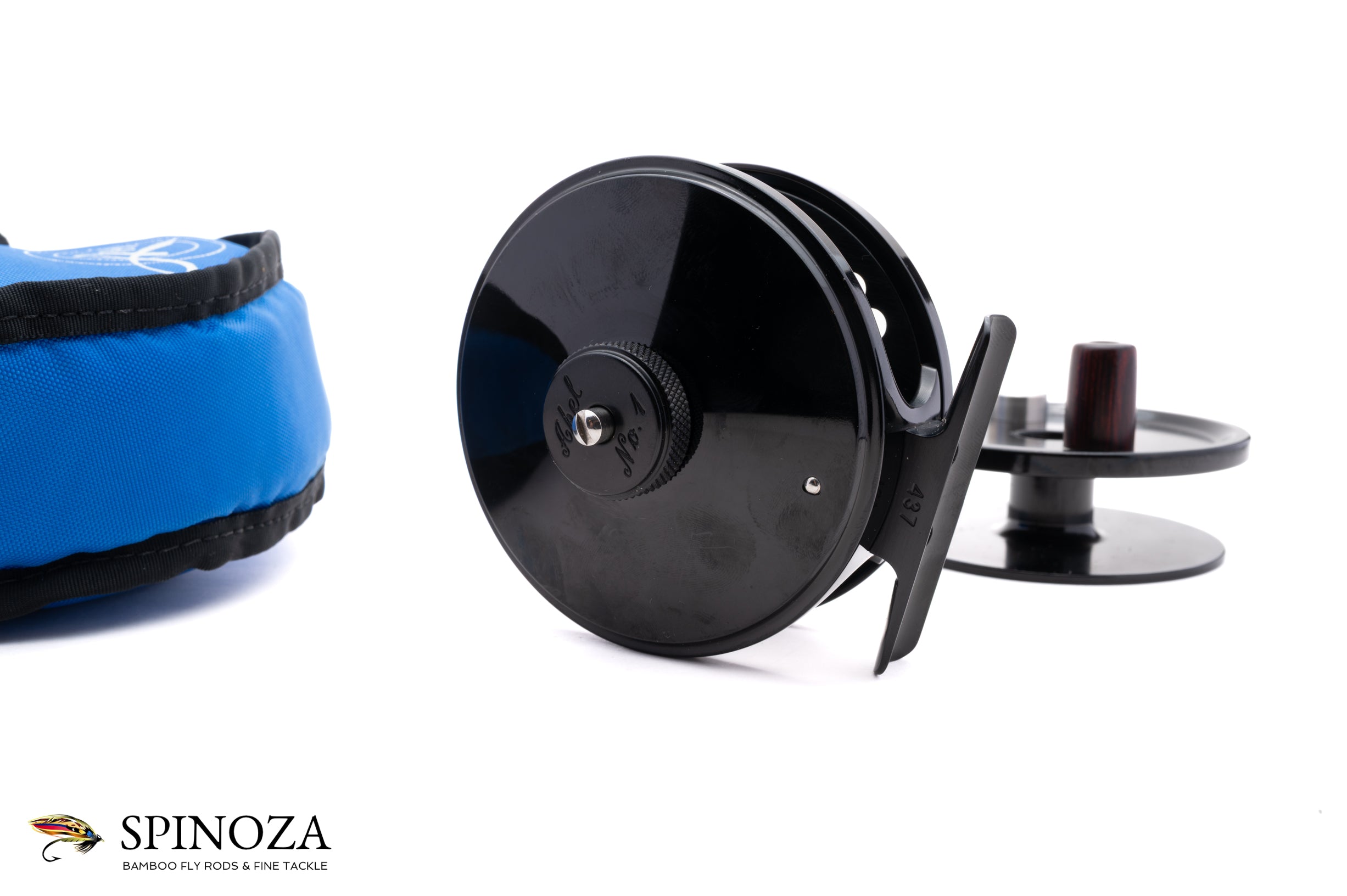 A nice Abel number one fly reel with a spare spool, 3 1/4" diameter and set up for RHW. The reel and spool are mint and unfished. Black anodized frame and spool. The spool currently on the reel is ported, while the spare spool is not. The reel weighs 6.7 ounces on my scale. The drag is adjusted via a dial on the backplate and is very strong at the heaviest settings. Serial number 437. Very well machined reel, as you would expect from Abel. The reel packs into an Abel blue Cordura pouch (no accompanying pouch for the spare spool).
