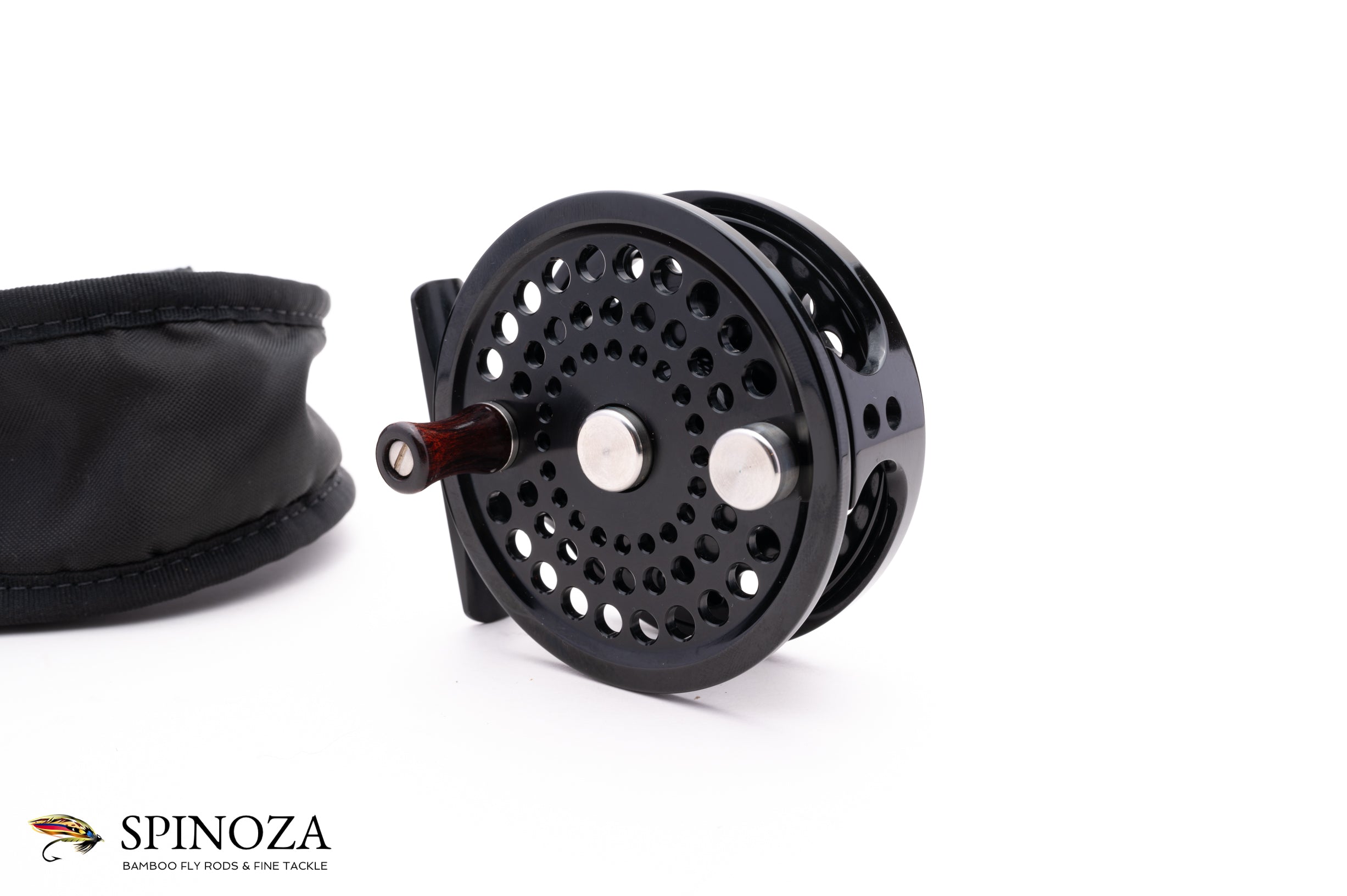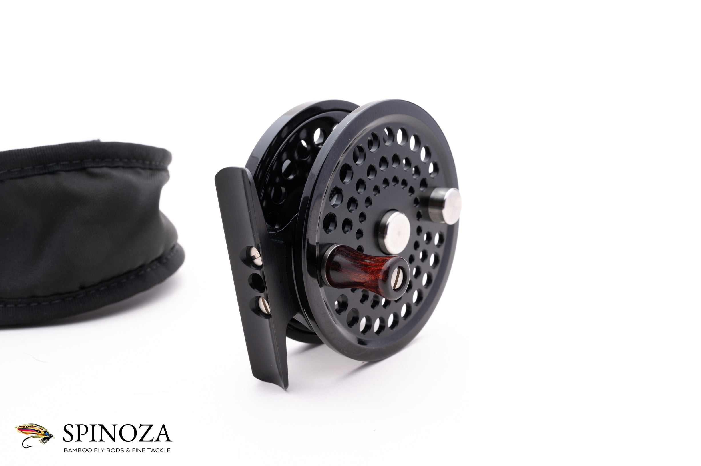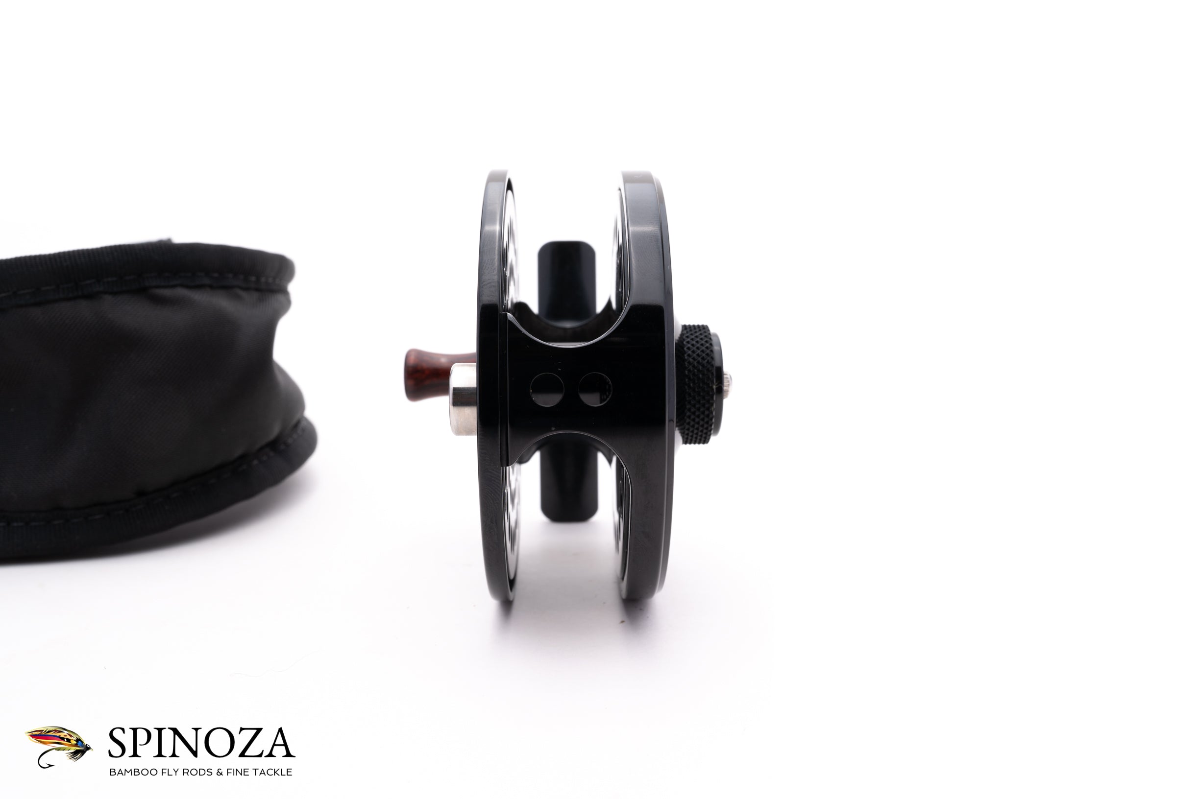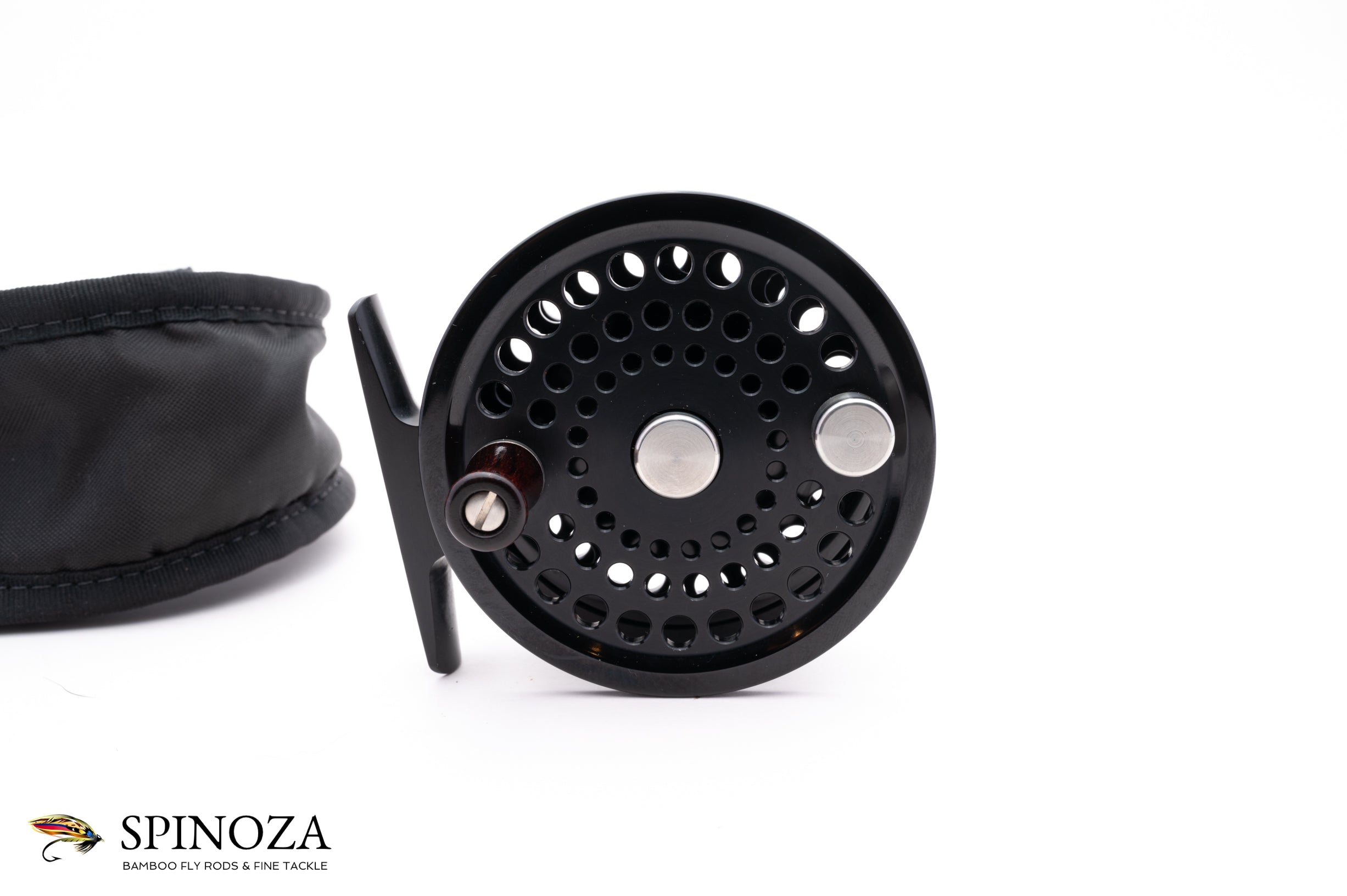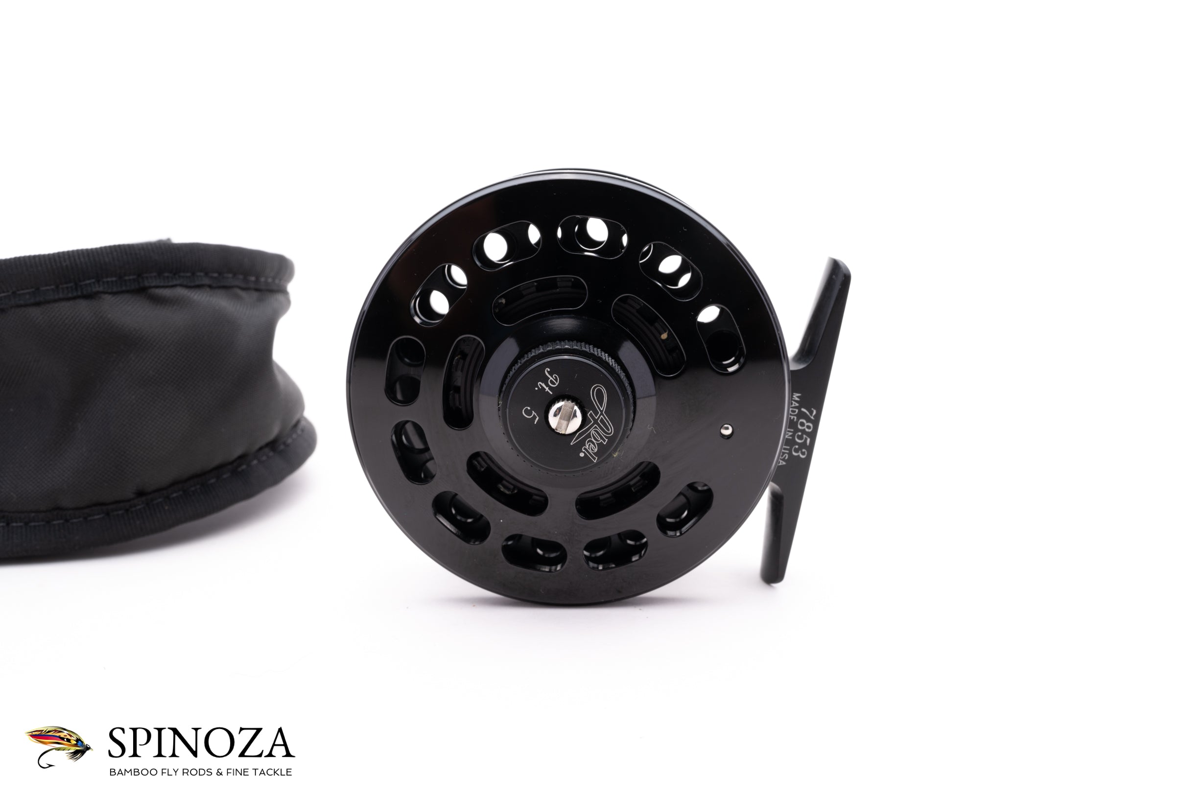 An Abel Pt 5 fly reel, 3" diameter and set up for LHW. Serial #7853. Mint condition. Glossy black anodizing throughout. The reel packs into the original pouch.