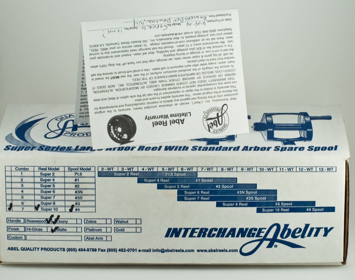 For sale here is an Abel Super 10 large arbor fly reel in unused condition and a spare #4 spool. Rosewood handle option and high-gloss anodized finish. Comes with the original pouches, cardboard box, and warranty card.
