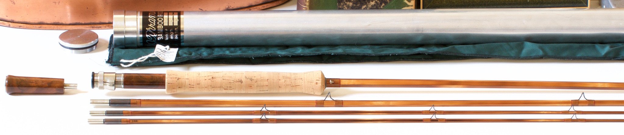 For sale here is a hollow-built A.J. Thramer bamboo rod. 8'6 3/2 for an 8 weight line. Model 8683 from his Signature Series lineup. Removable handle extension. Medium fast action with a slightly fuller working action than his Dry Fly rods. Darkly flamed cane. Up-locking reel seat over a wood spacer. Apricot silks tipped with red. Oxidized guides, tip tops, and ferrules. The ferrules are 19/64 and 13/64 and the fit is excellent. This rod is 100% original with no repairs or damage. All sections are of equal length. The rod weighs 5 3/4 oz. Excellent plus condition with original bag, hang tag, and labeled tube. A very nice one hander for steelhead or salmon!