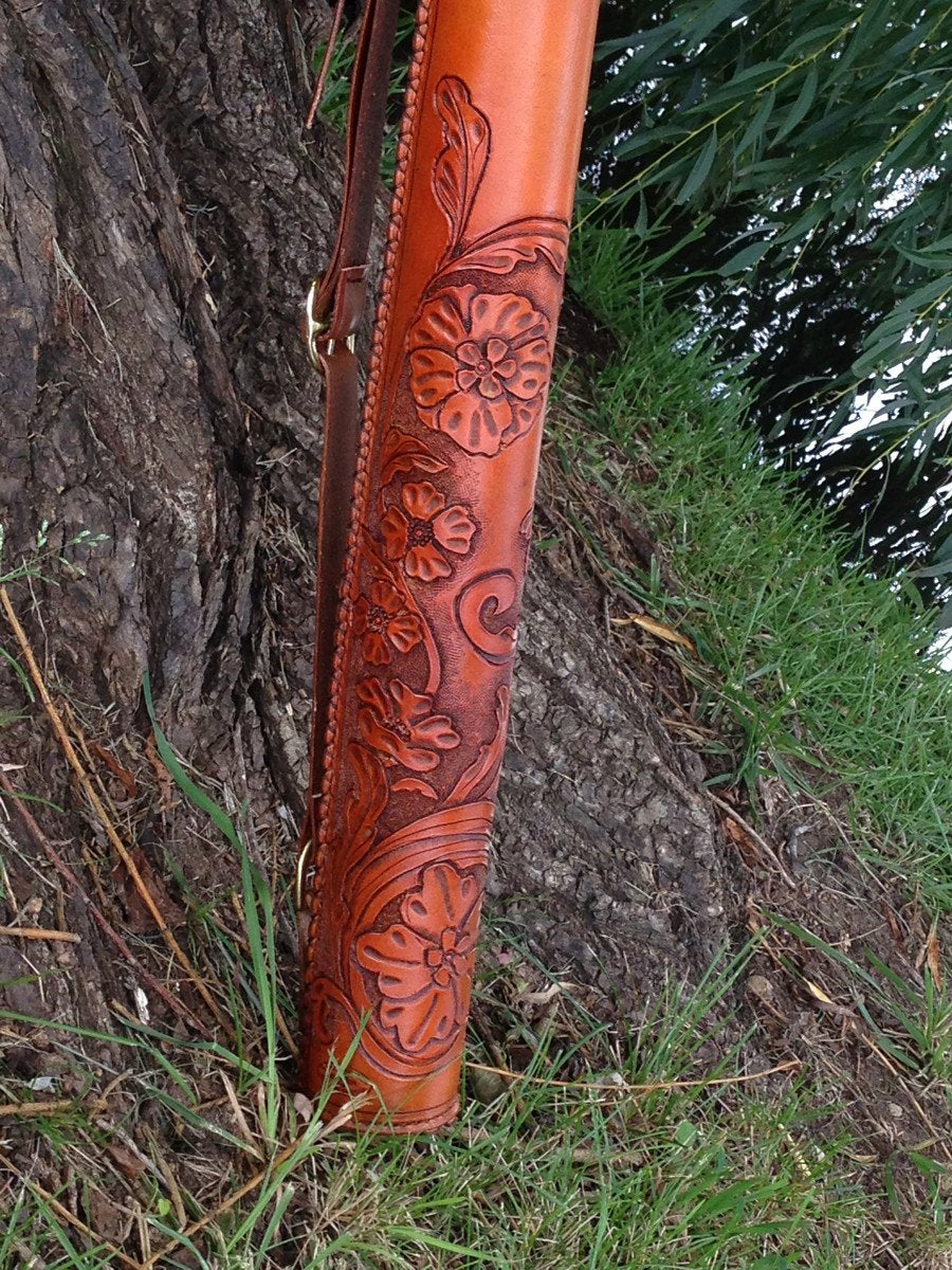For sale here is an exquisitely-crafted leather rod and reel combination "backpack-style" case by leather artist, Annie Margarita. This 39 inch long rod case was constructed to fit up to a 9 foot, three piece rod and is properly padded for protection. The reel case is lined with thick shearling and is large enough to accommodate anything from a 2 7/8" diameter reel up to a 3 5/8" reel, and wide enough to accept a wide drum reel within this range as well. The reel case detaches from the rod case via a leather strap with buckles. The external shoulder strap on the rod case is adjustable.