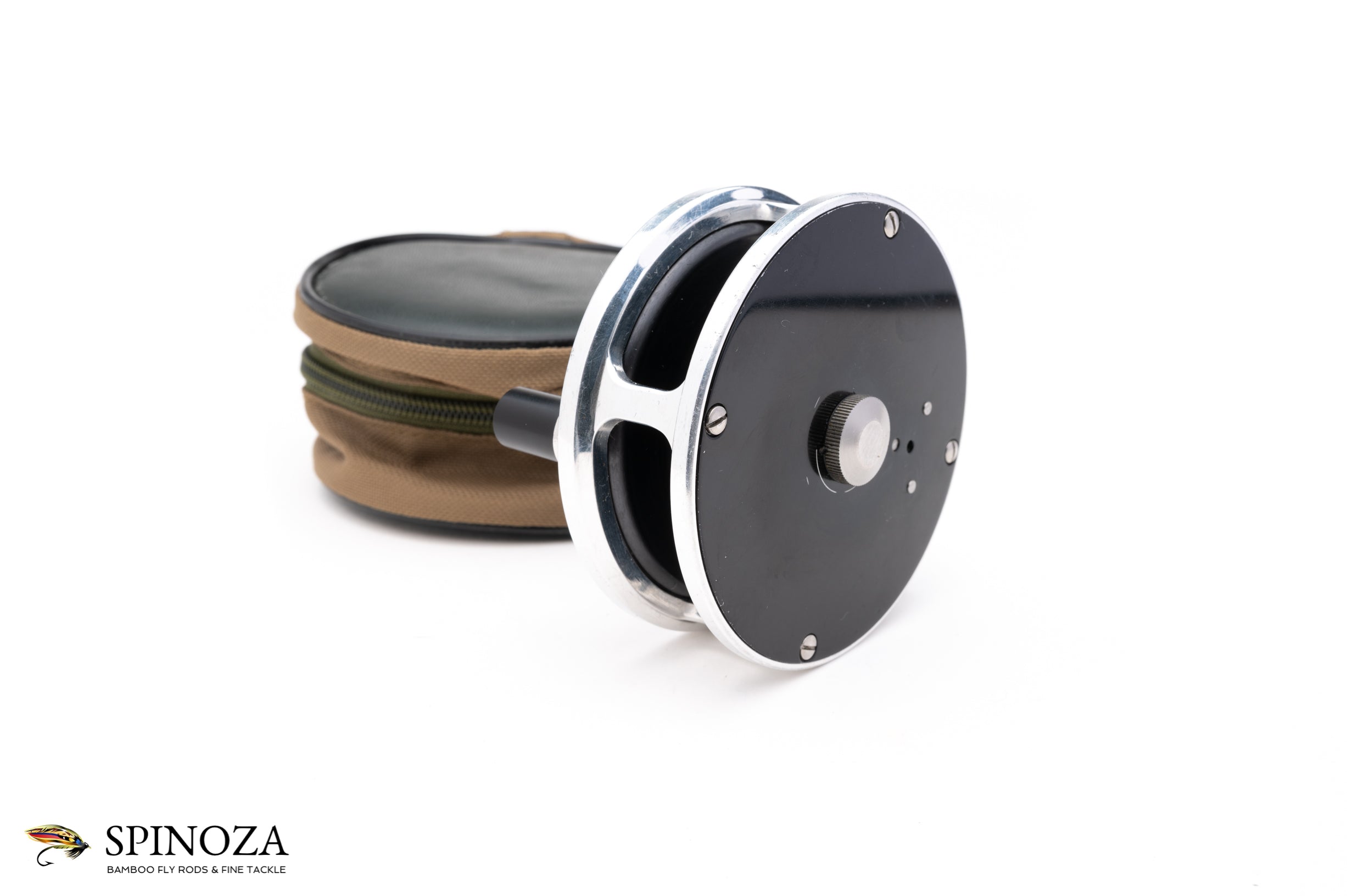 A Bill Ballan fly reel, 3 1/4" in diameter. Feels like a relatively neutral bias. Black sideplates and spool, with silver frame, foot, and s-handle and oil port cover. Used condition with minor wear overall to the frame and sideplates. Comes in a non-original cordura zippered case.