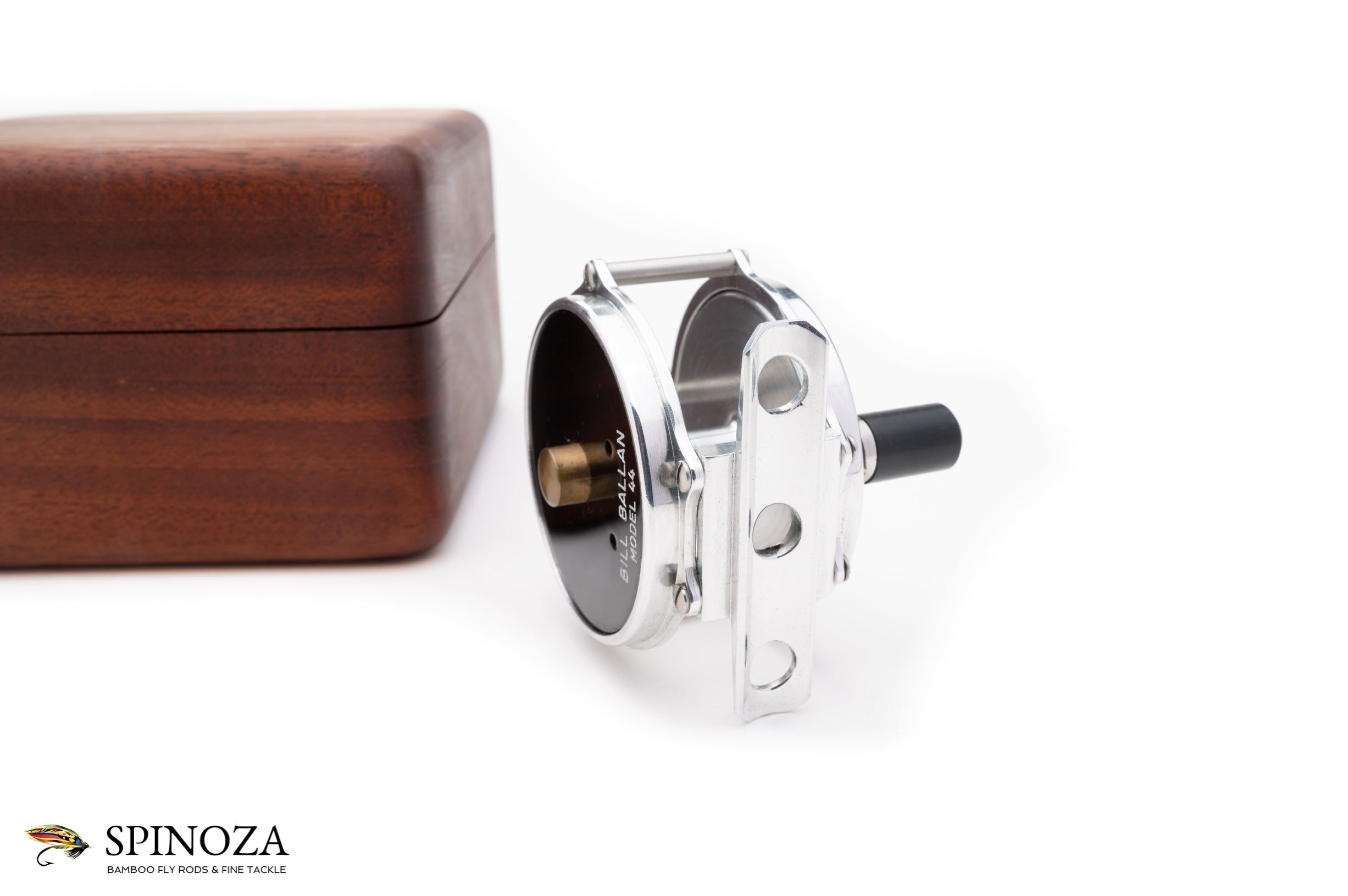 A Bill Ballan model 44 fly reel, his homage to the early Leonard raised pillar classic. 2 1/4" diameter  with a 3/4" spool width. Excellent used condition, with some mounting marks on the foot and some very minor smudging on the rims being the only sign of use. Very clean throughout. Fixed check and set up for RHW. Would work nicely for lines up to a DT3. Silver frame, spool, and foot, with black sideplates. "Bill Ballan" and "Model 44" etched into the face plate. Comes in a handsome, heavy walnut presentation box.