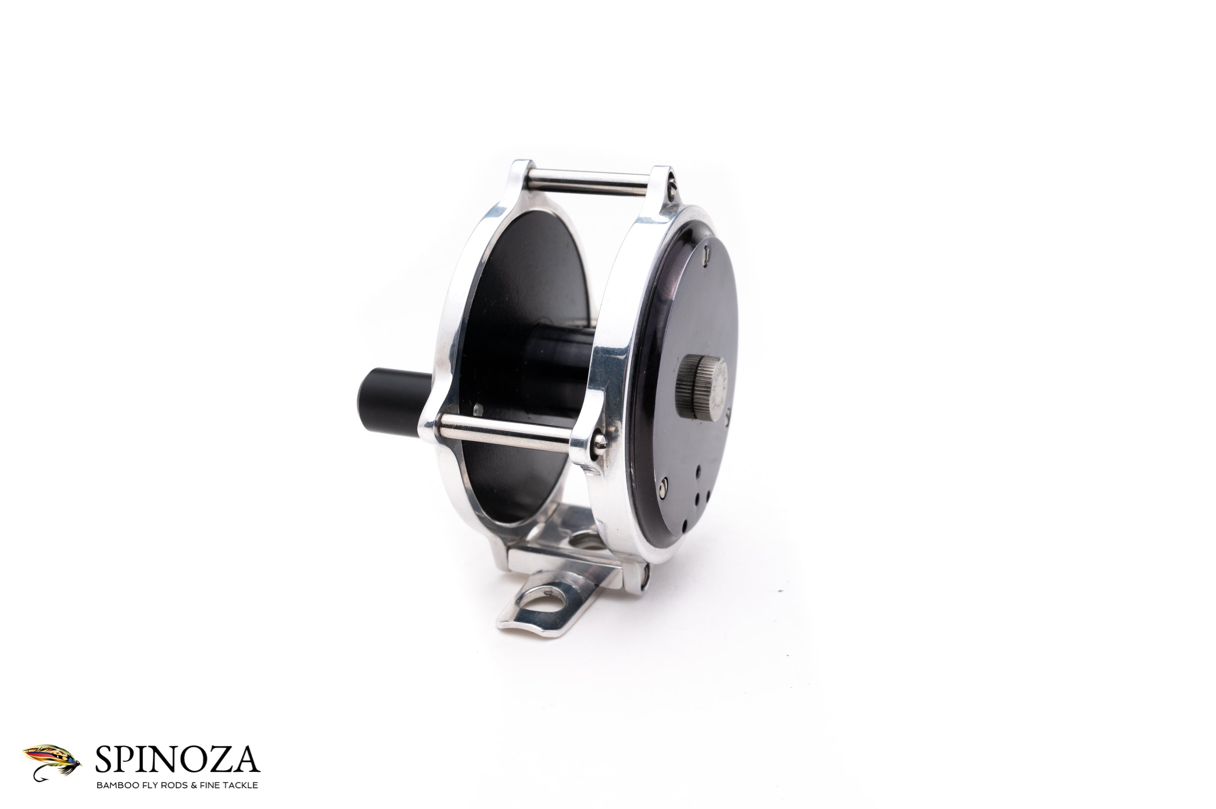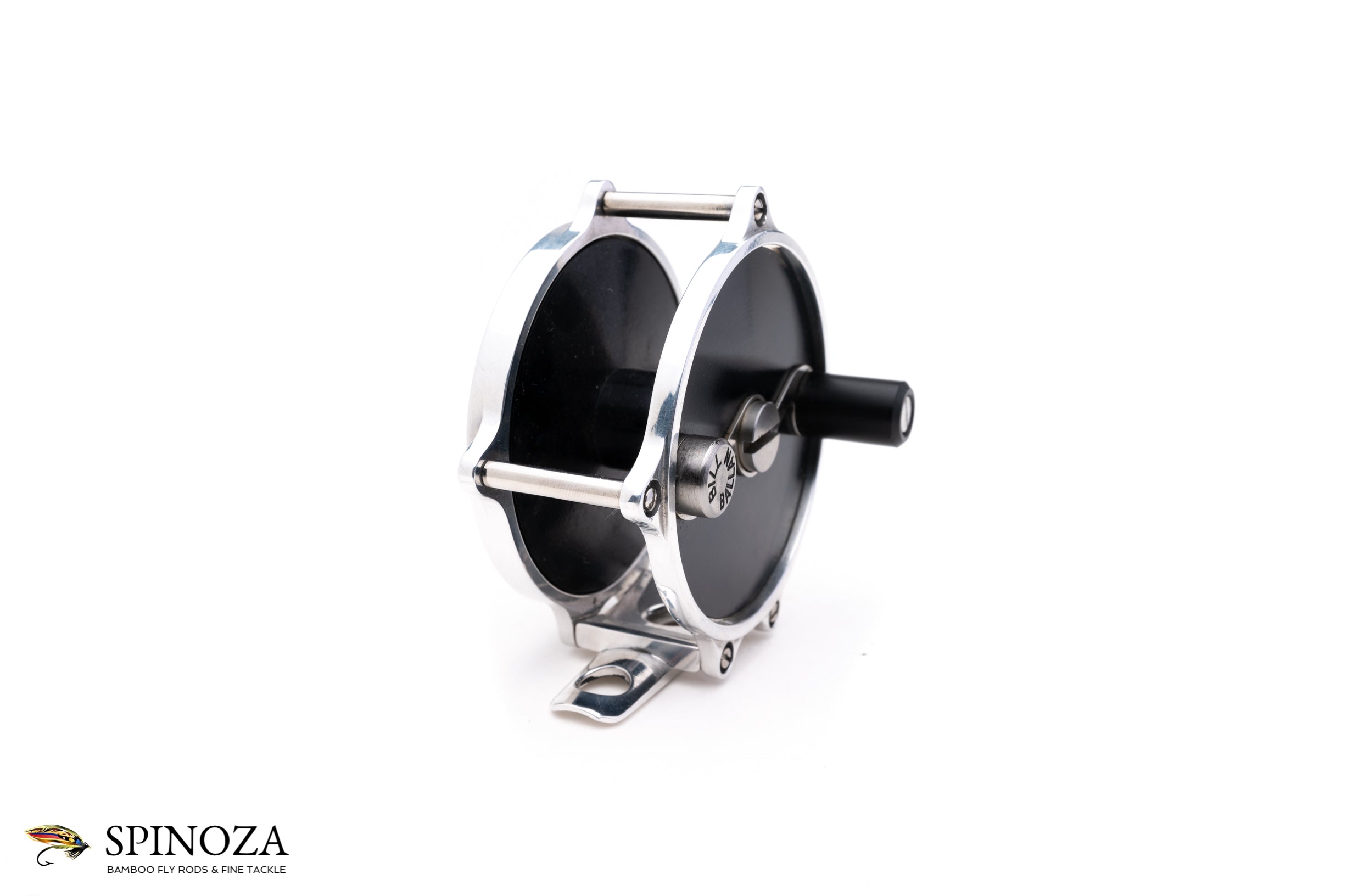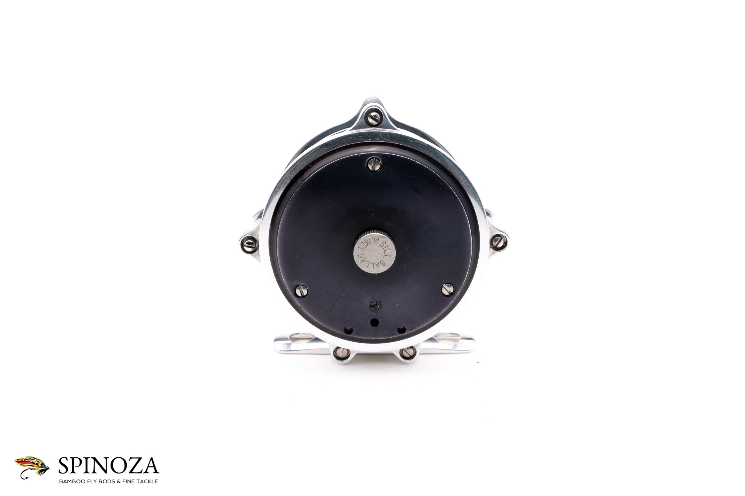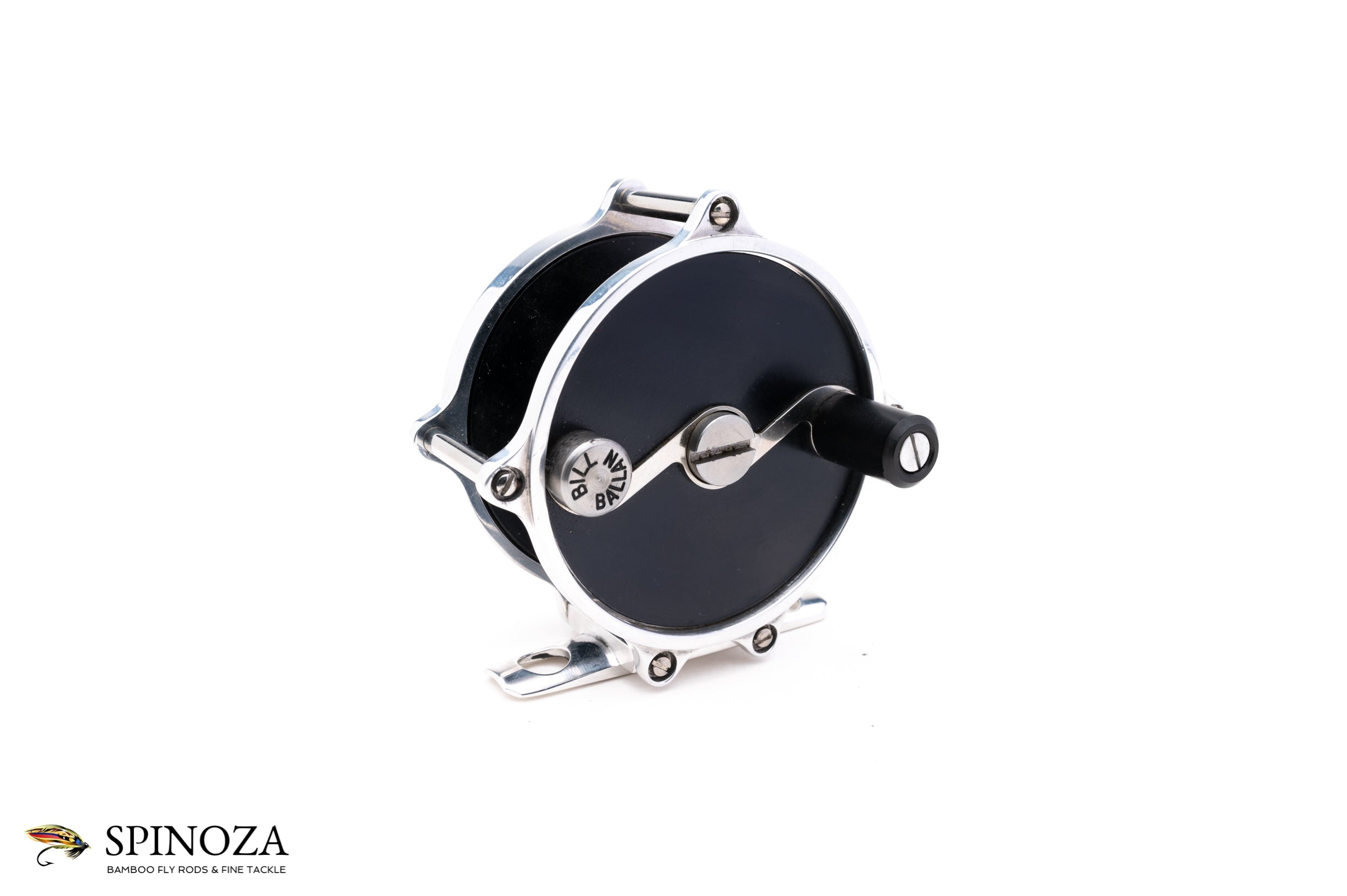A small Bill Ballan raised pillar trout reel, 2 5/8" in diameter. Neutral bias that allows for reeling in either direction with a satisfying click, though with perhaps a slight favor to RHW. Black side plates with a silver frame and foot with a silver spool and crank handle fixed on the spool. "Bill Ballan" engraved into the counterbalance. Near mint condition, as I can find a few very minor marks from use but I doubt this reel has seen much action at all. Should work nicely with a #3. No pouch.