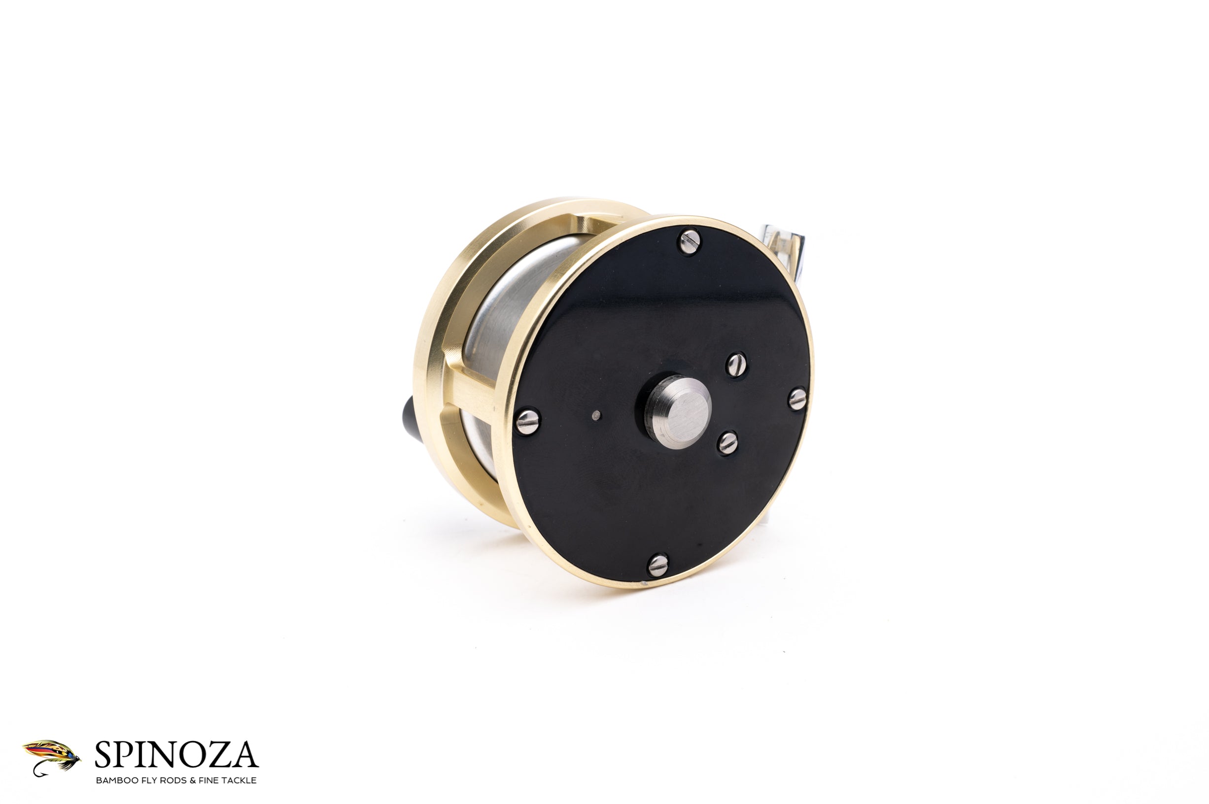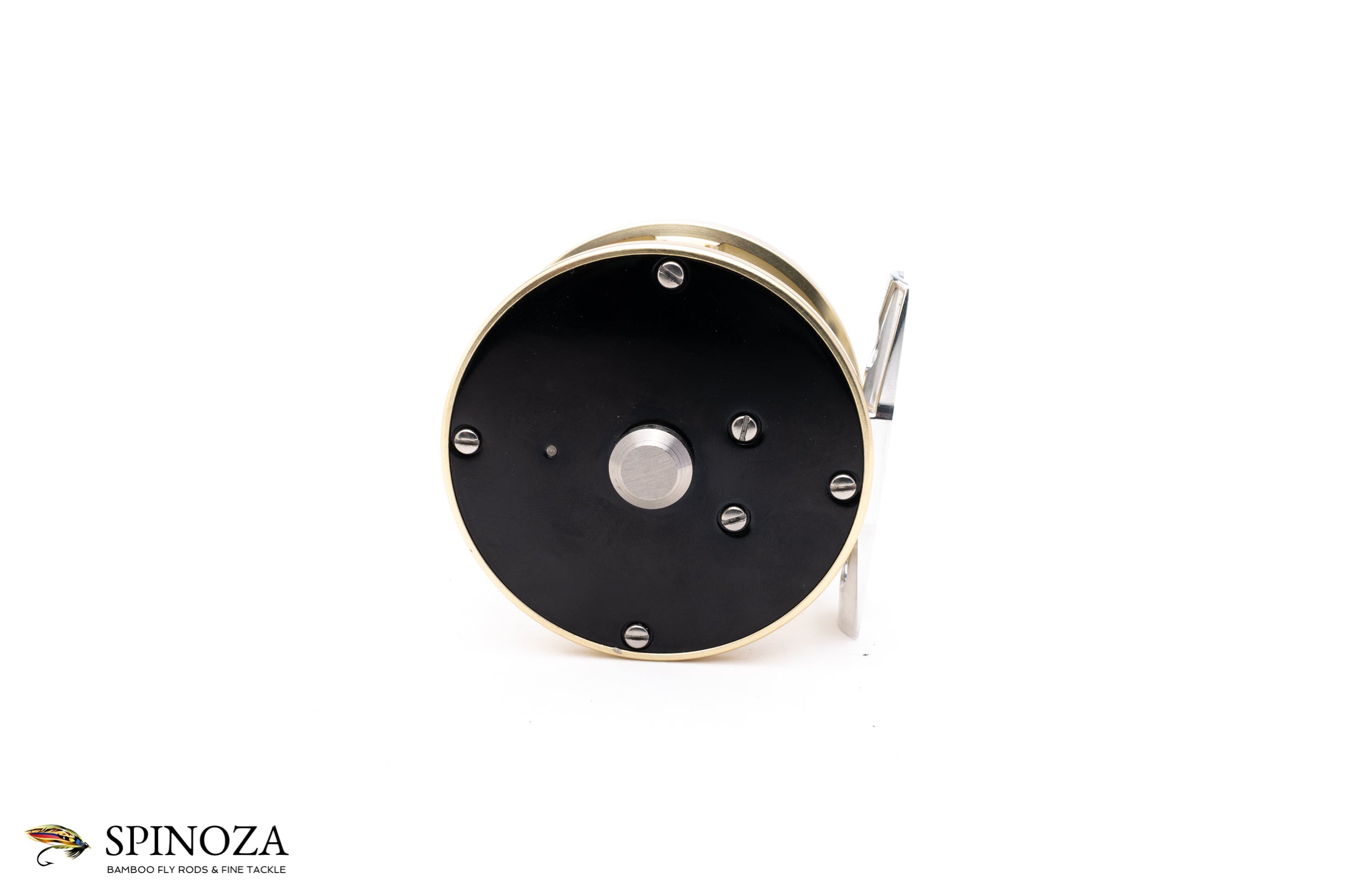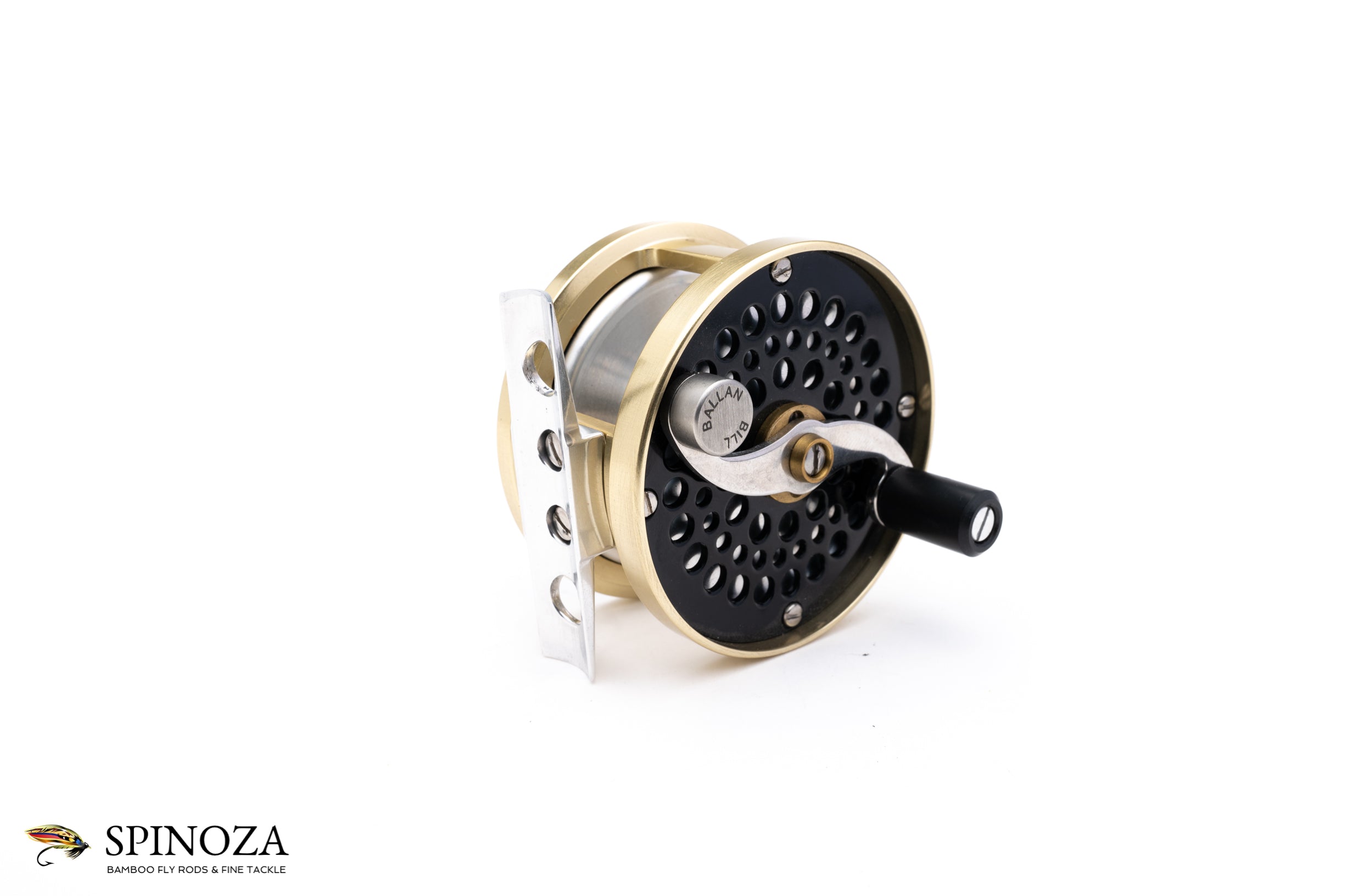 A nice little Bill Ballan Trout real, with a fairly neutral bias but probably favors RHW. 2 5/8” diameter with an approximately 1” spool width. Near mint condition with the only signs of use being some very modest mounting marks on the foot. Black side plates with a light gold frame and a matte silver spool and a bright polished foot. “Bill Ballan” stamped into the counterbalance. Should work nicely with a #3 or #4. No bag.