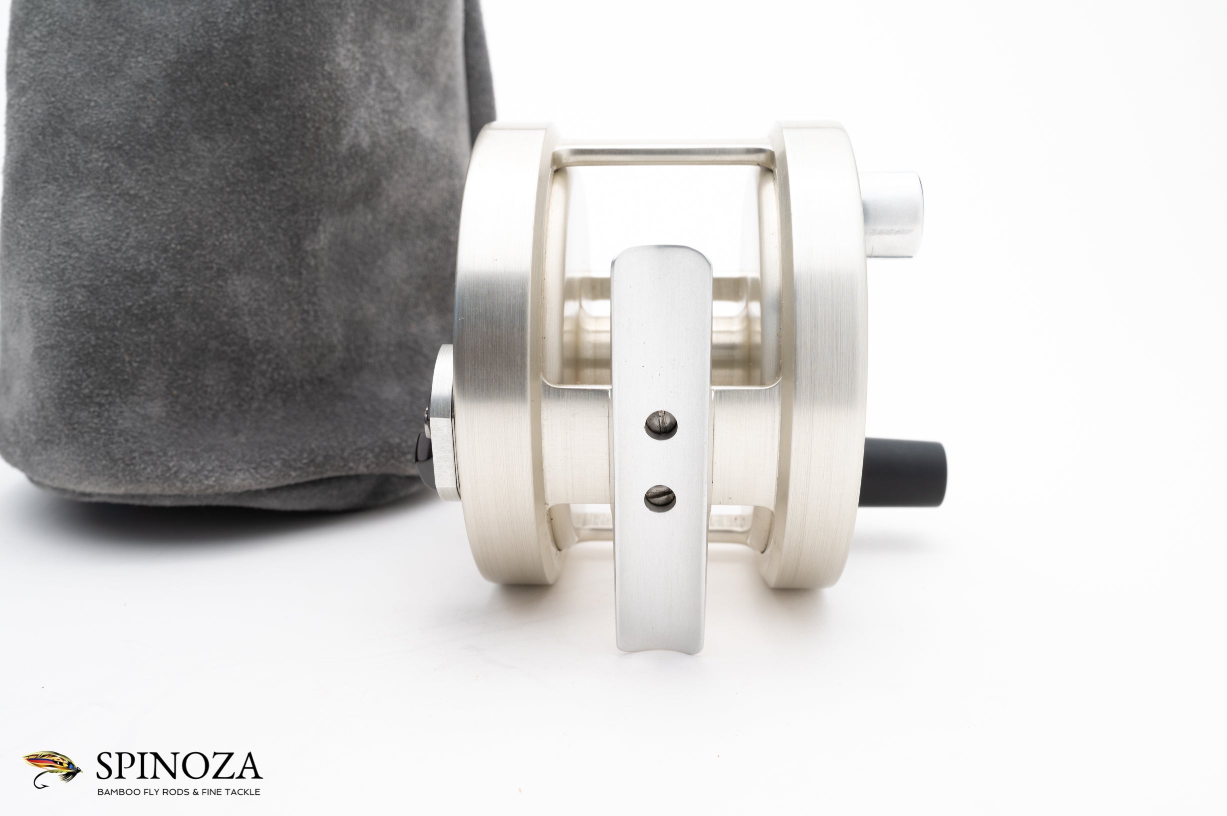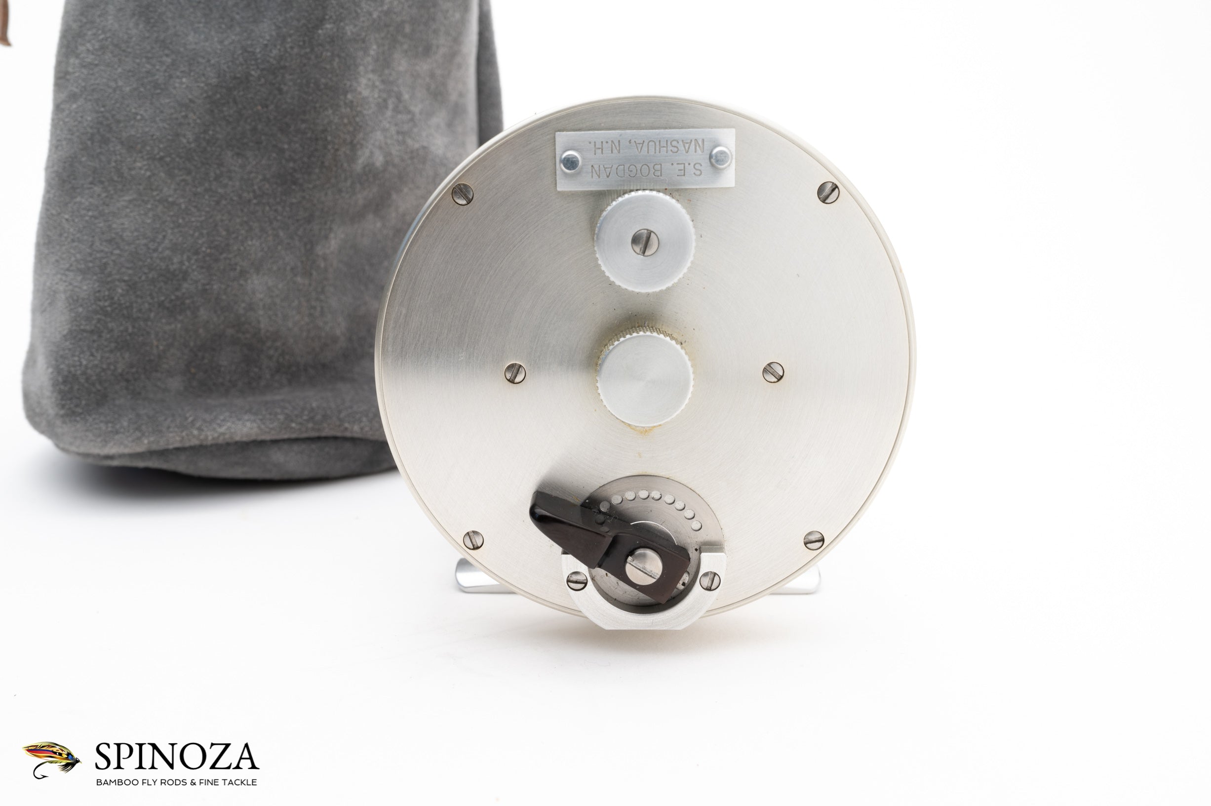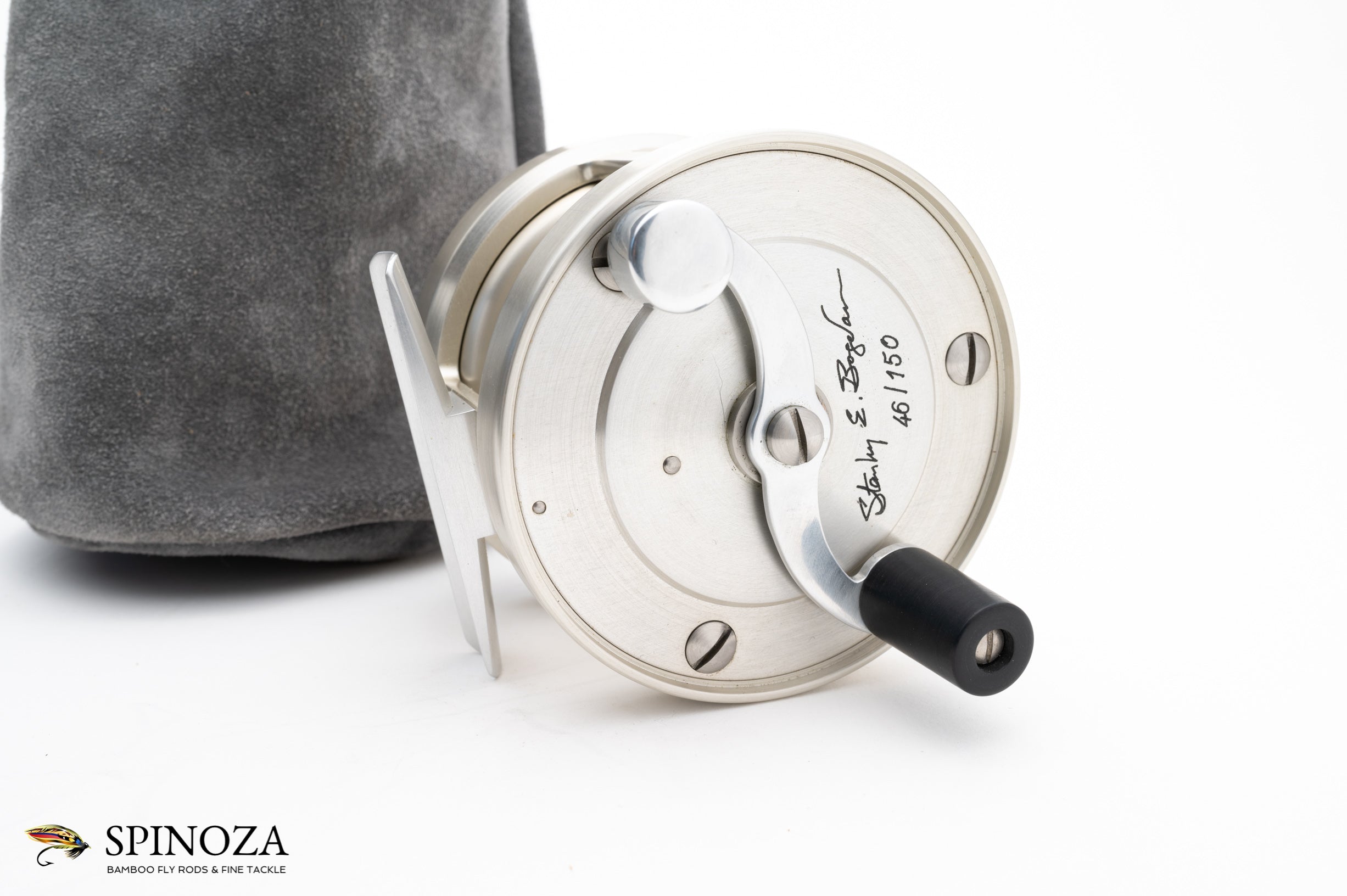 A superb Bogdan Signature Series Model 0 salmon reel, set up for RHW. Numbered #46/150 this reel was part of a limited series developed in the late 1990's, usually found with a model 0 such as this one combined with a model 150 together in a walnut case. Mint, unused condition. Clear anodized throughout, the sole exception being the drag adjuster knob and the small Bogdan signature and "46 / 150" on the crankplate befitting the reels in this series. Comes in a gray suede bag which, though not original to this series, appears a genuine Bogdan bag. If you've always wanted an examples of one of the Bogdan signature series reels this is your chance!