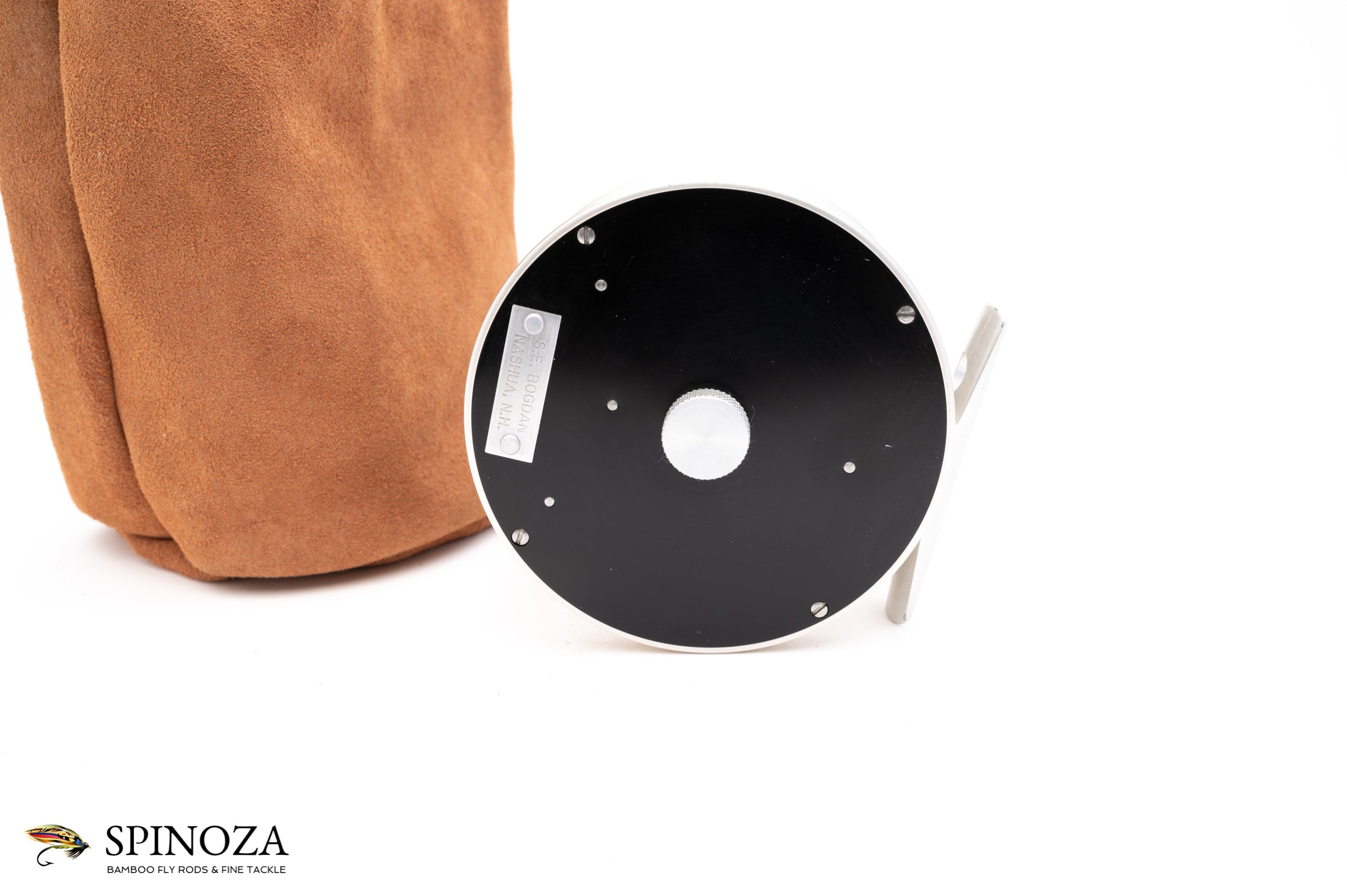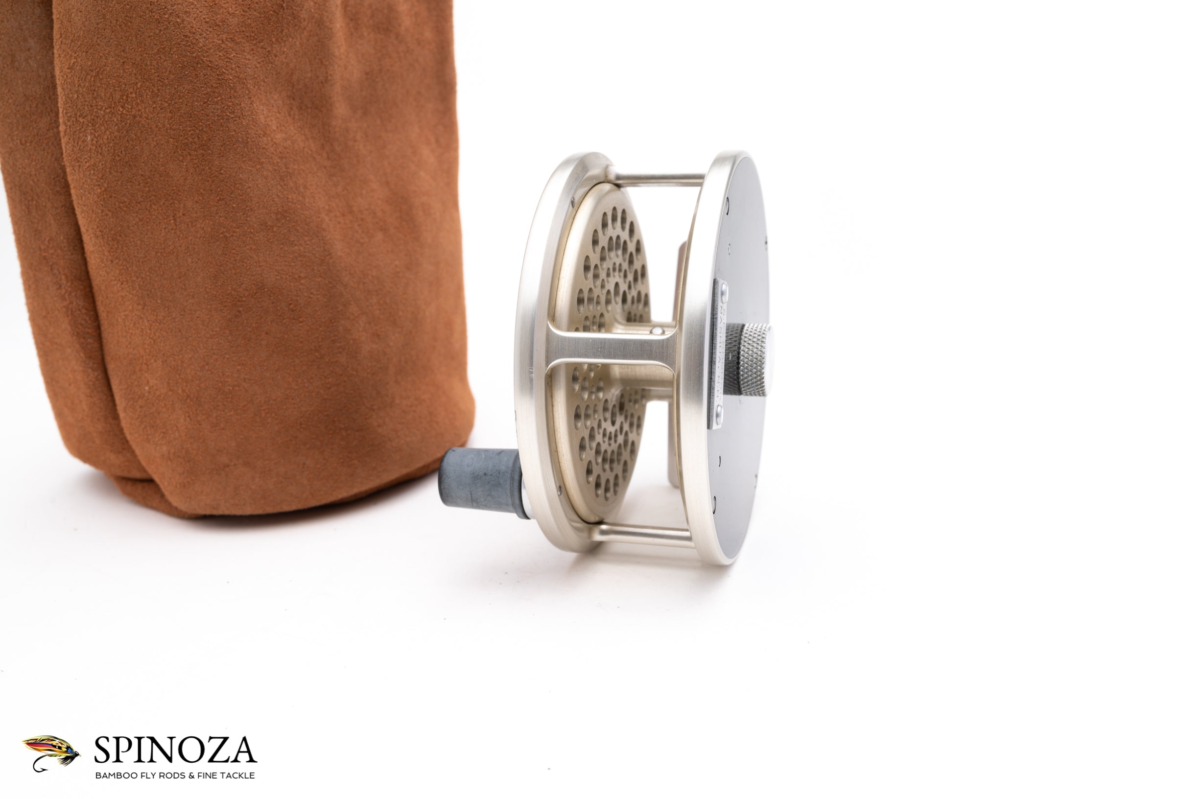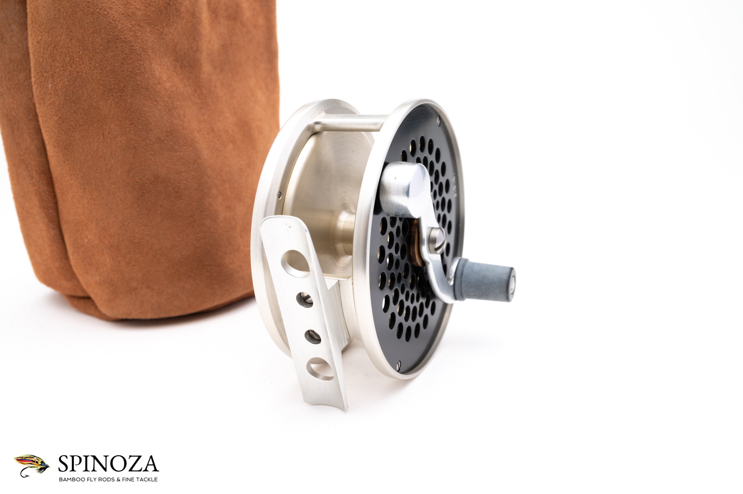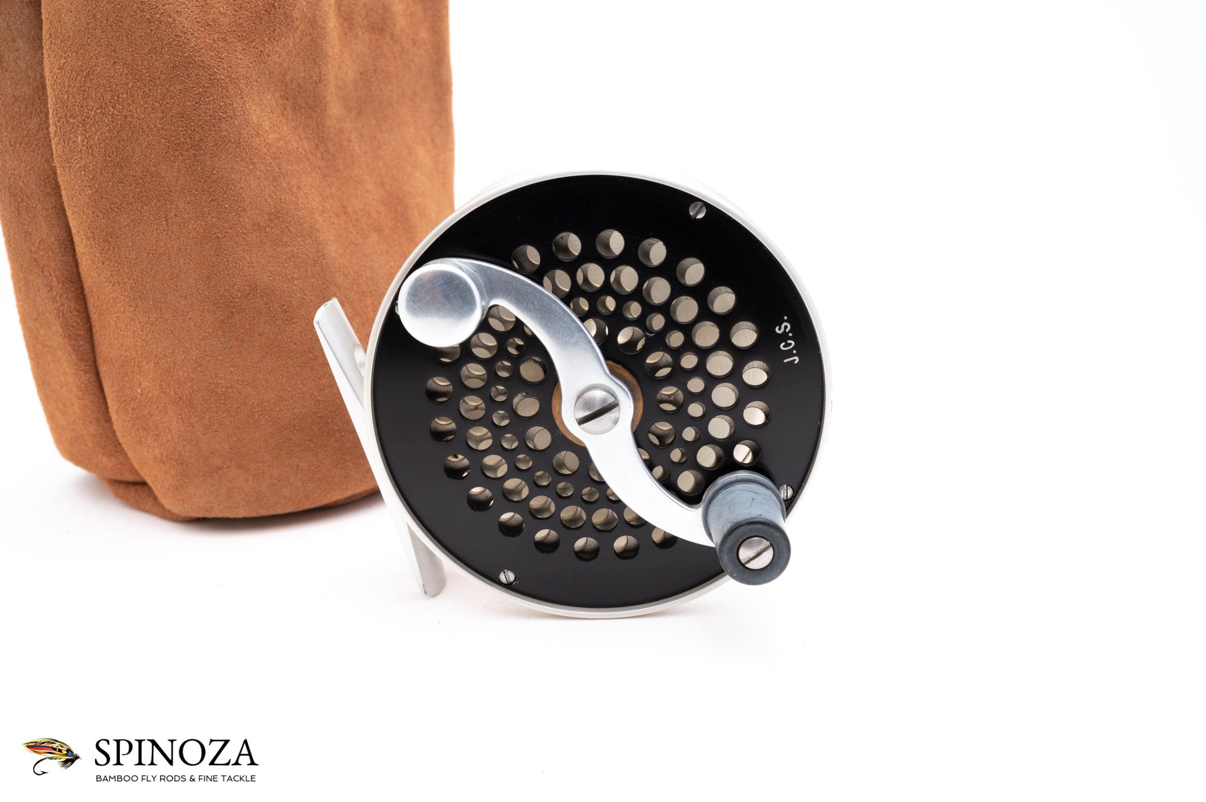 A superb Bogdan Large Trout Reel, set up for RHW. 3 1/4" diameter with a 31/32" spool width. Weighs 5.5 ounces and designed to hold a #7 line and 50 yards of backing. Fixed drag with a moderate inbound click and louder outbound. Near mint condition, with just a one tiny mark on the rim, one tiny mark on the faceplate, and a few tiny mounting marks on the foot being the only hints of use that I could find. Very clean overall and I'd be surprised if it was fished more than just a few times. Silver frame, spool, foot, serpentine handle, oil port and Bogdan nameplate. Black sideplates with the initials "J.C.S" professionally engraved in small letters on the winding sideplate. Both the plate and the spool on the handle side are ventilated. Comes in an original suede reel bag.