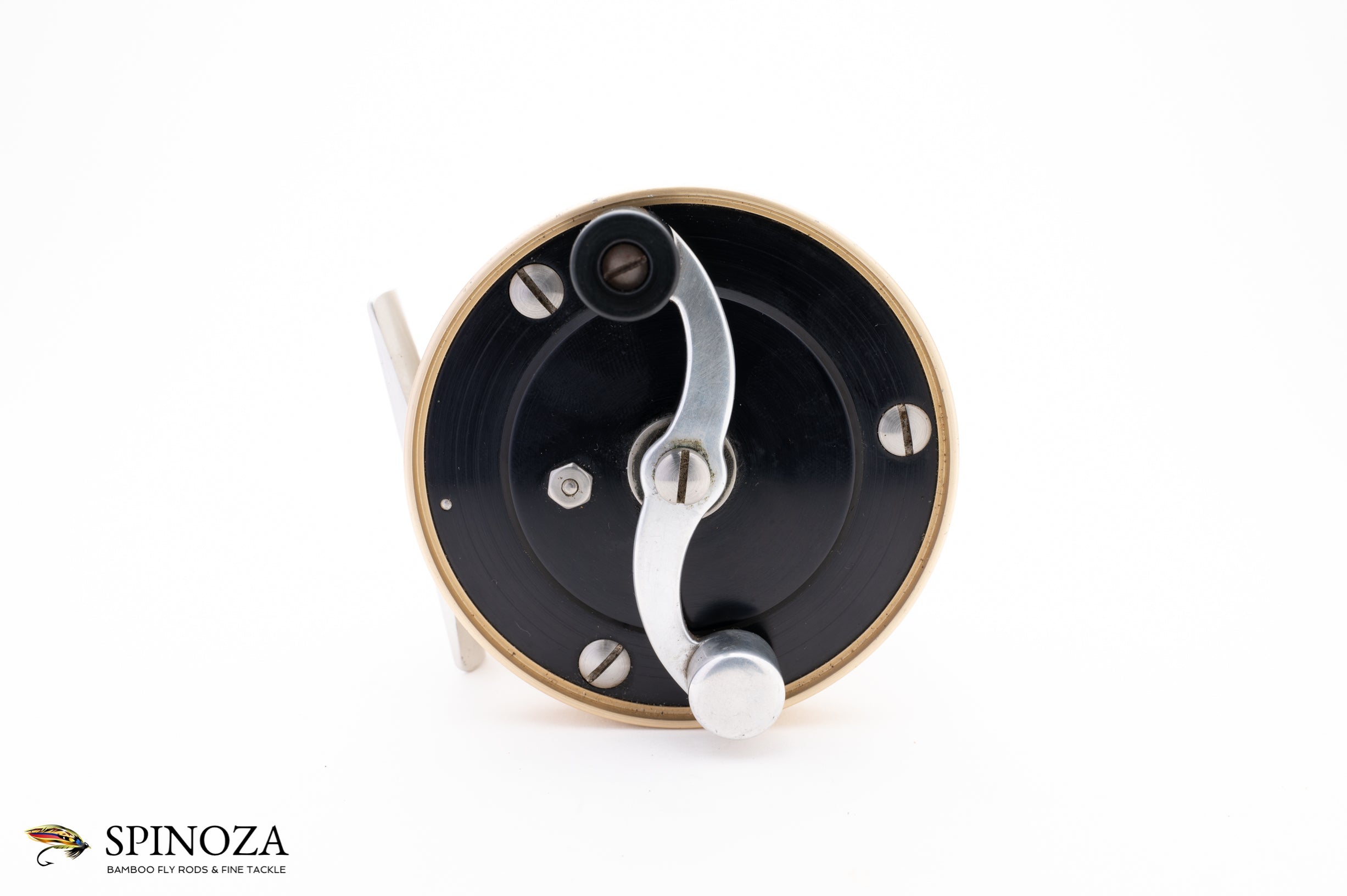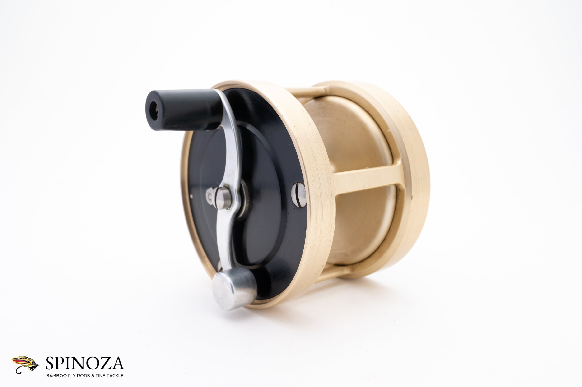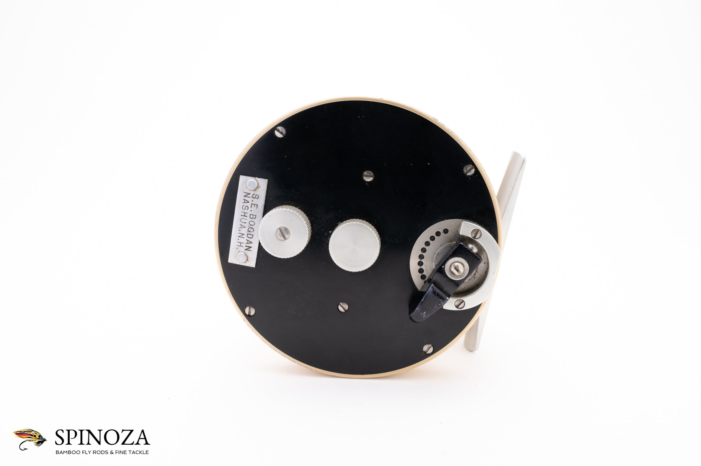 A nice Bogdan Model 0 fly reel, set up for desirable LHW. The single-handed workhorse reel in the Bogdan lineup this reel is 3 1/4" in diameter with a 1 3/8" spool width, designed to hold a #9 line with 150 yards of backing. Pale gold frame with black sideplates and drag adjuster, with a silver foot, serpentine handle, oil port cover, and poacher's knob. Excellent used condition overall with just the faintest hint of rim rash in a few small areas. The sideplates are nice and clean and the reel is in perfect mechanical condition. The takeapart screws are nice and clean. The reel appears to have had the multiplier screw replaced at some point, evidenced by the hexagonal nut on the crankside plate. 2:1 multiplier retrieve with the revered Bogdan double pad brake system. "0" stamped on the side of the foot. Comes in a nylon Eddie Bauer bag.