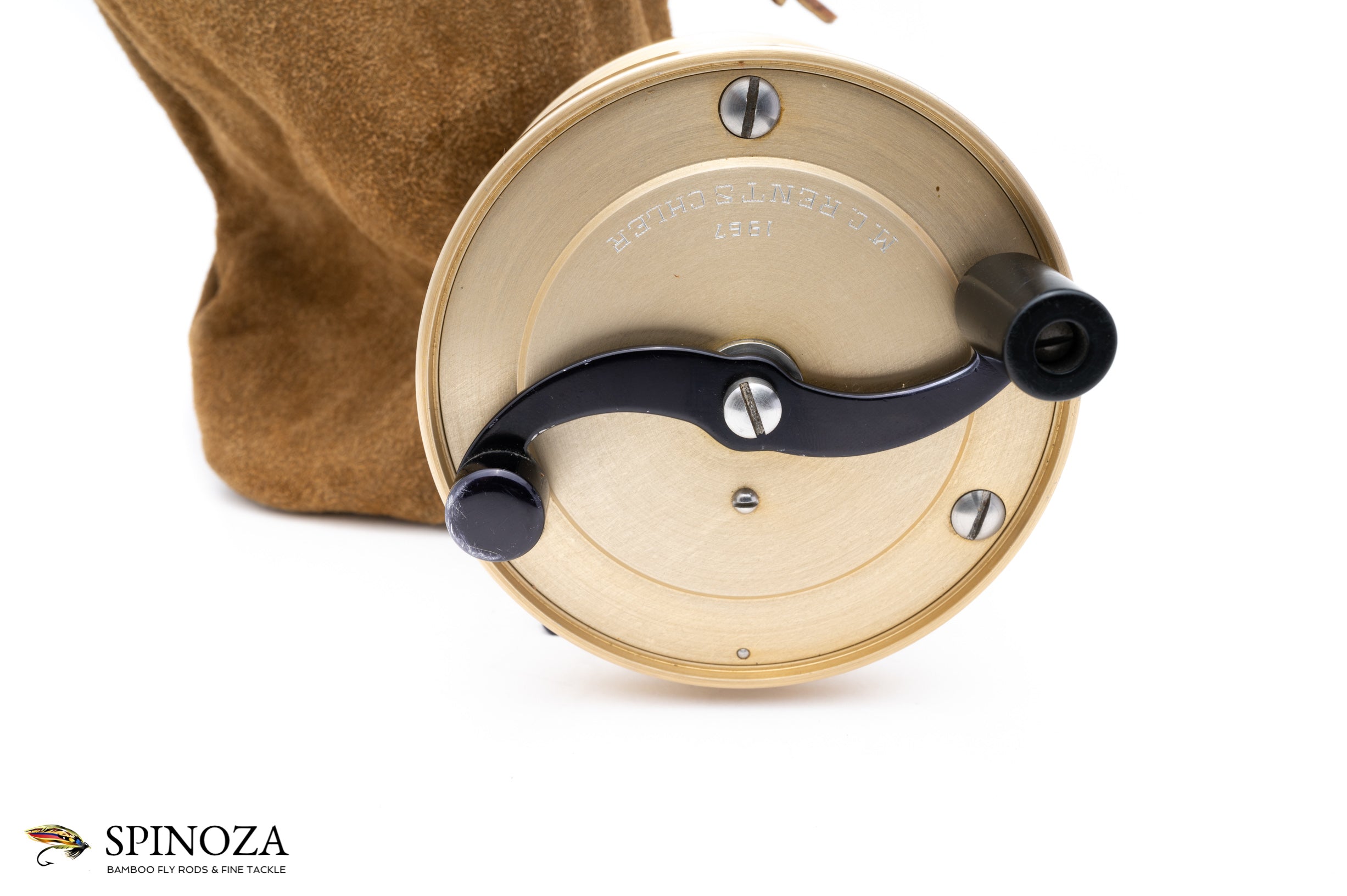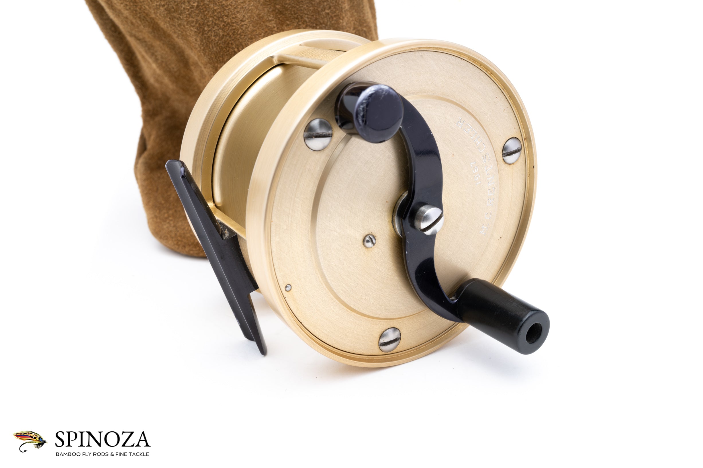 A nice Bogdan model 300M fly reel, 3 3/4" diameter with a 1 5/8" spool width, set up for RHW. Weighs 15 ounces and designed to hold a #12 line with 225 yards of 20# backing. Pale gold frame, spool, and sideplates with black foot, crank handle, drag adjuster, oil port cover, and poacher's knob. Silver Bogdan nameplate. The brake pads are the later delrin rather than the earlier micarta. Excellent plus condition with a small amount of very mild rash to the rim at the usual "resting place" on the reel where it touches the ground or bottom of a boat. The rest of the rims and frame are pristine, in fantastic shape. The foot has some mounting marks from where it has been secured to the reel seat, and there is some mild brassing to the drag adjuster and counterbalance. "M.C. Rentschler" lightly but professionally engraved on the crank plate along with the date "1967". I believe that Mary Rentschler was the first woman to be a member of the Moisie Salmon Club, a nice bit of provenance here. The reel comes in the original Bogdan suede bag. A nice model here perfect for larger two-handed rods.
