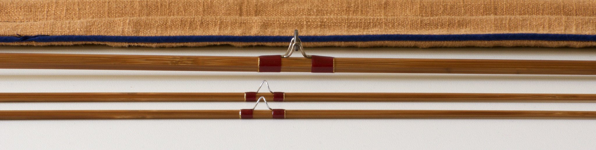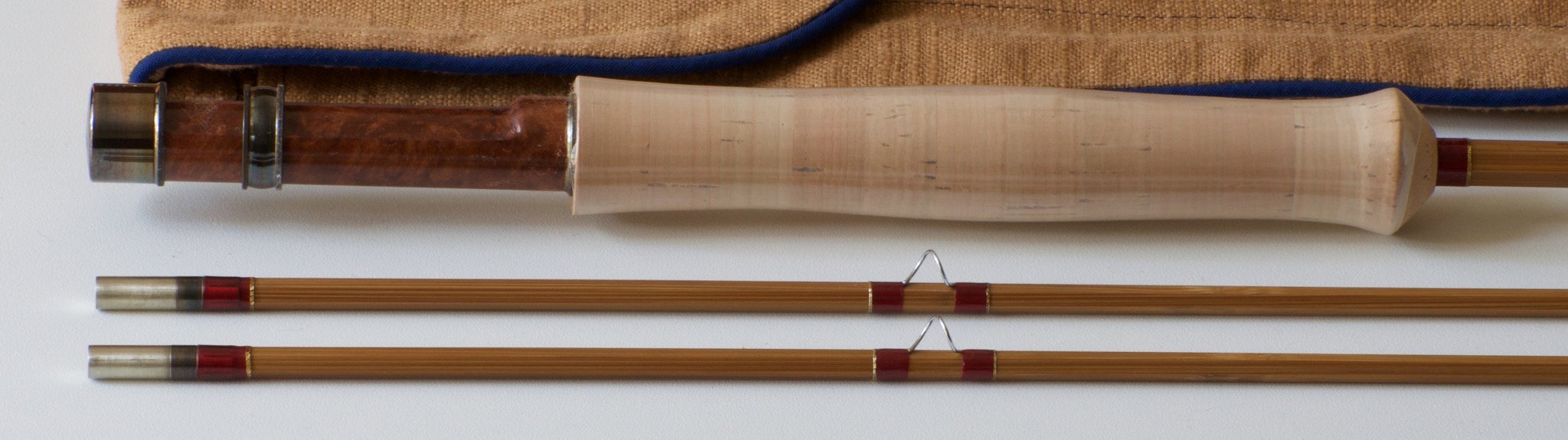 For sale here is a hollow-built bamboo rod by Cris Carpenter. 8 feet in length, weighing in at 3 5/8 ounces. Like new condition with plastic still on the grip. Two sections made with two tips for a three weight line. Medium flamed, deep red silks with gold decorative edges, oxidized hardware, cap and ring reel seat over a stunning wood spacer. Oil finish. 13/64 ferrules. Medium to medium fast action with plenty of reserve power. Comes with original bag and labeled tube. A wonderful rod unmatched at this price point in my opinion!