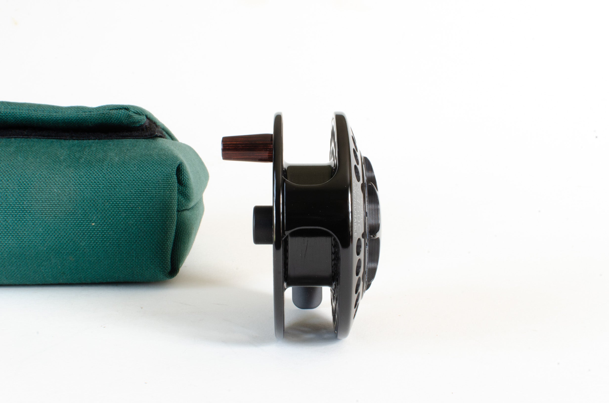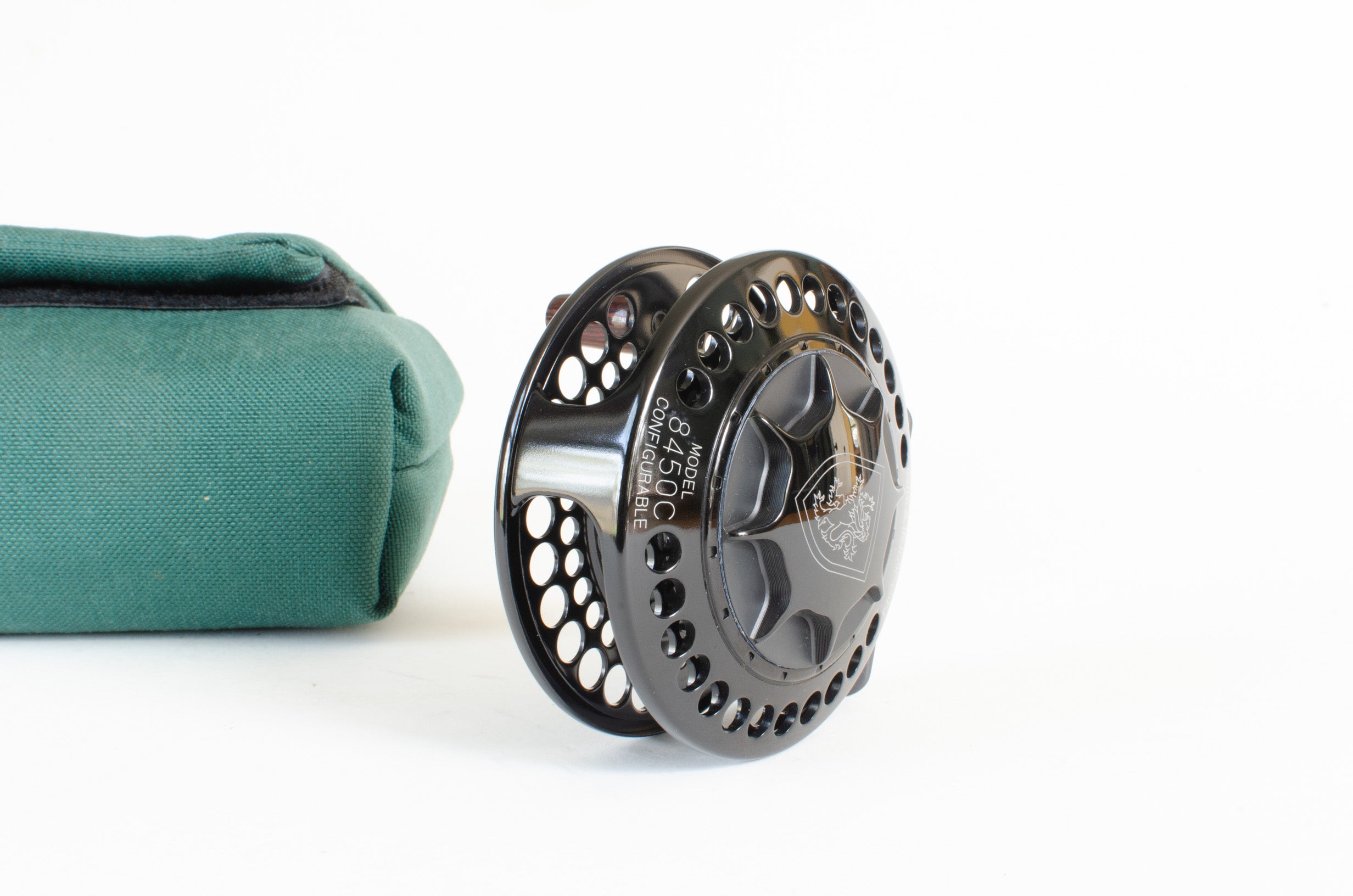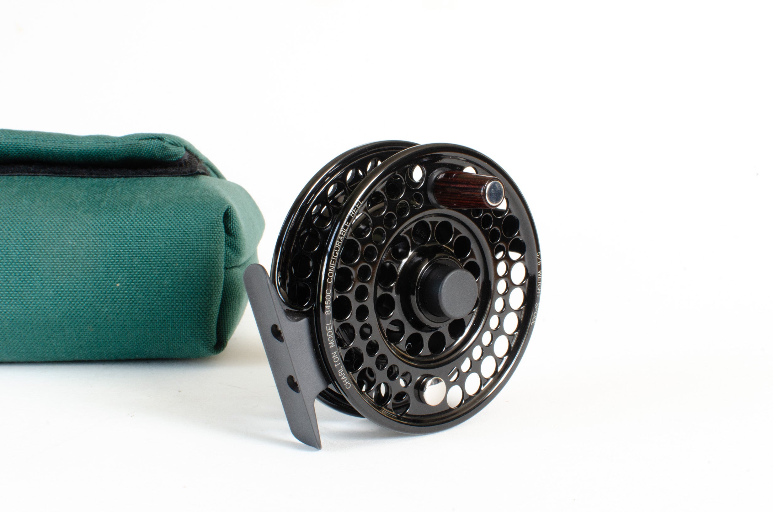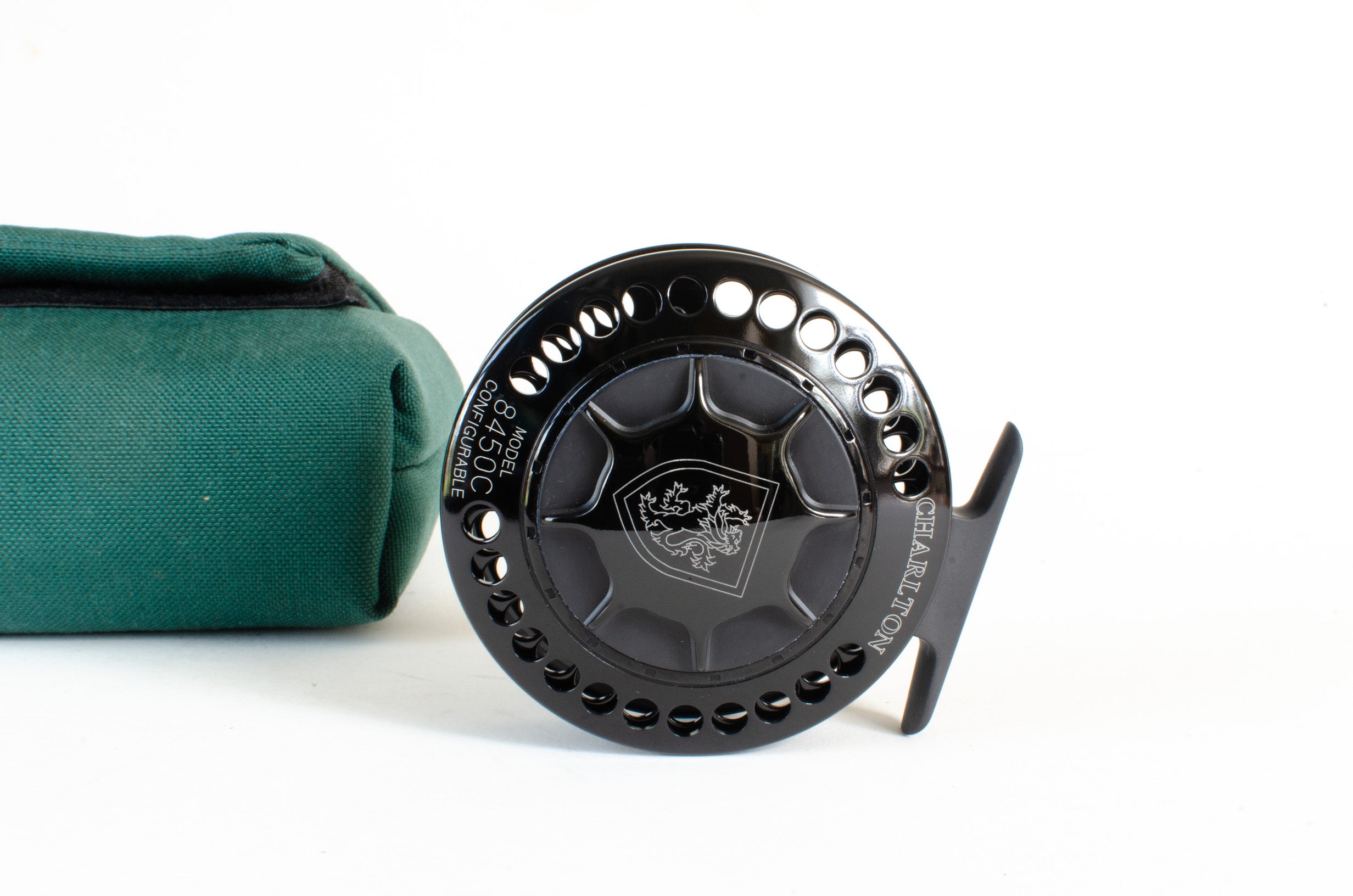An excellent Charlton 8450C fly reel with a #5/6 spool. 3 1/2" in diameter and set up for LHW. Mint condition. The spool width is approximately 3/4". Weighs 5.8 ounces on my scale. A nice large arbor spool, and of course the spools can be easily swapped for different sizes if desired. Carbon fiber sealed disc drag designed to handle larger species. Glossy black anodized finish with a matte finished reel foot. Comes packed in a green cordura pouch with the original box and warrantee card.