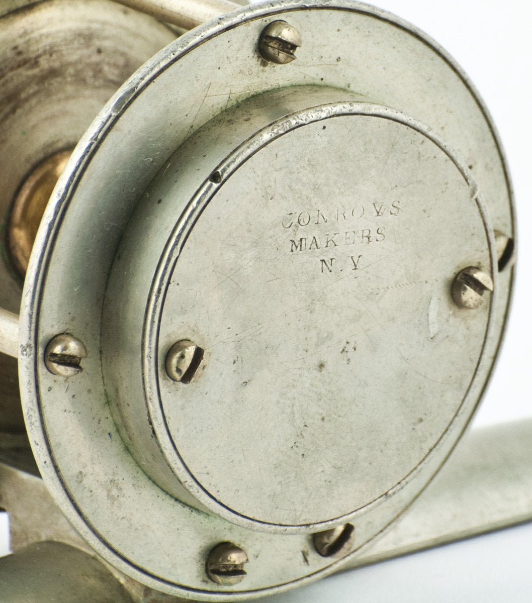 For sale here is a Conroy German Silver Trout Reel. Stamped "Conroys Makers N.Y." Raised Click Box. Rarely seen 2" diameter. Pronounced offset foot that is entirely full length and unmolested. Thick half crank fitted with a bulbous bone grasp. The screw heads are in terrific condition and the reel has a strong sounding click. These reels rarely surface on the market so don't miss this chance to add a very nice example of a very historic and very high quality early American fly reel to your collection.