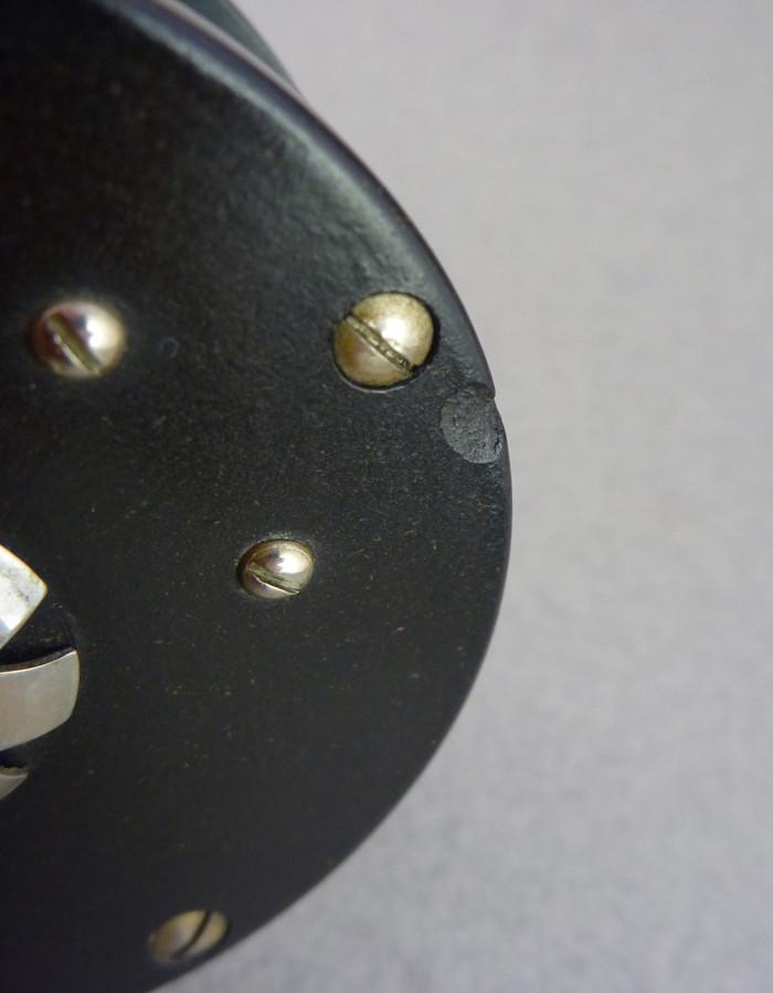 For sale here is a Cozzone 80 yd fly reel. This is the model with rubber bands, instead of nickel silver bands like most of the Cozzones you see. Cozzone logo is nice and clear. With the exception of the following issues, the reel is is great condition. First, there is a crack by the reel seat pillar that extends through two of the screws on the back plate. Second, there is a chunk of rubber missing on one of the rims as shown in the last photo. Great clicker - super tight fishing reel! On/off click switch works fine. The back plate also has a removable knurled bearing cap, which rests upon a Julius Vom Hofe-style spider washer.