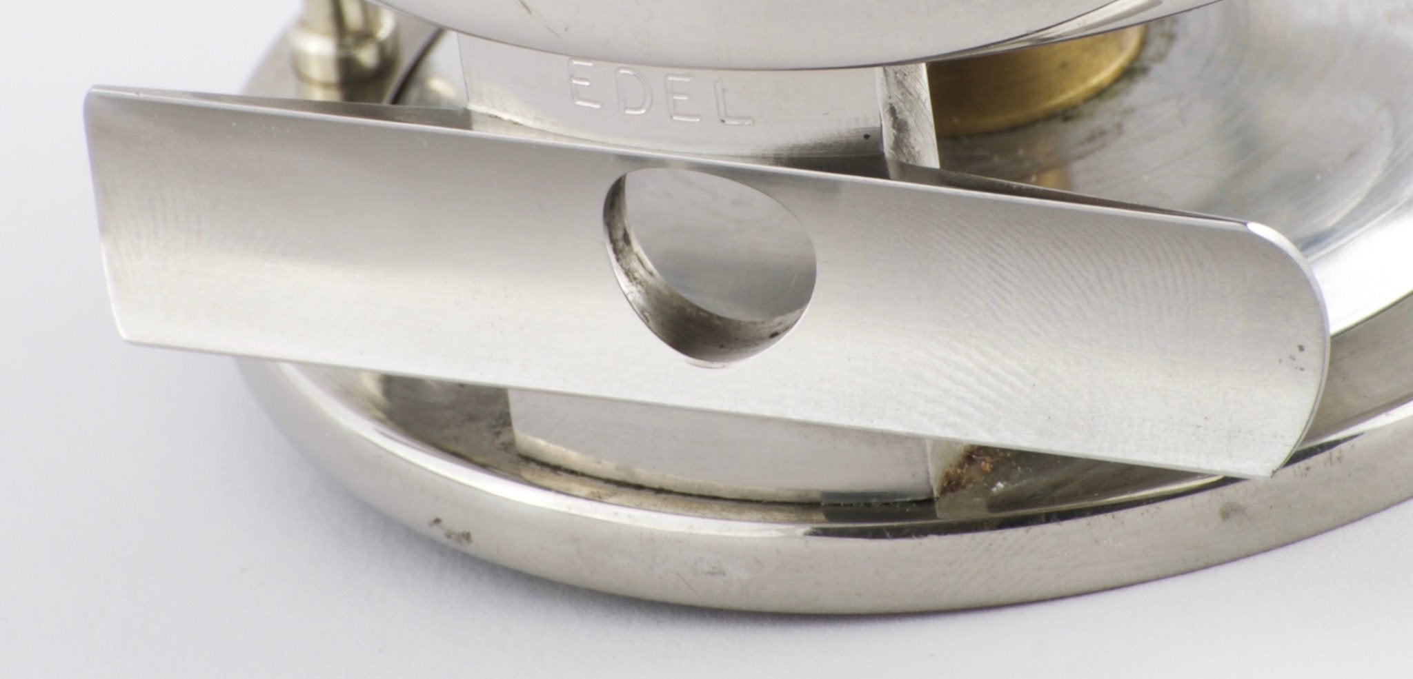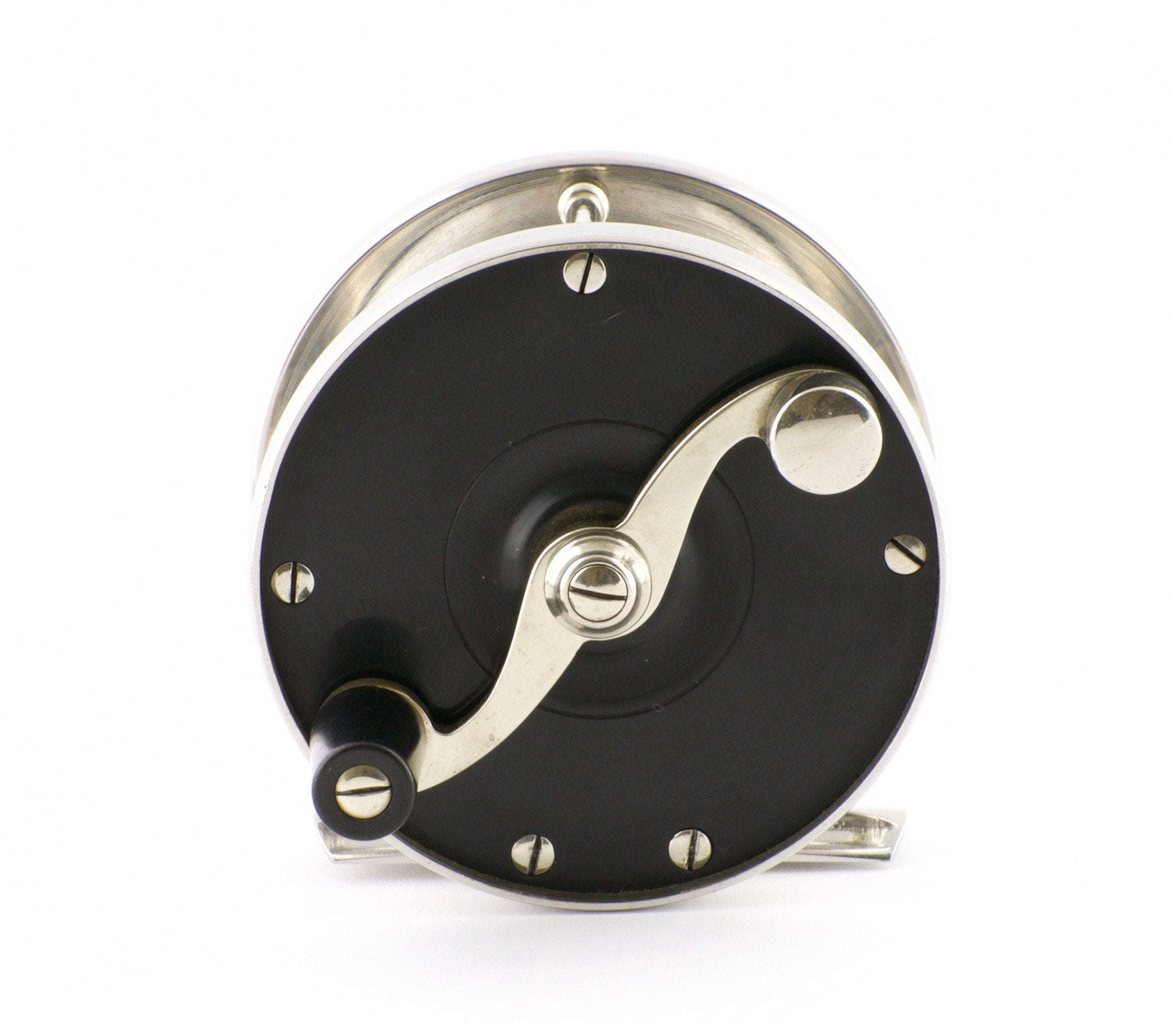 For sale here is a David Edel fly reel, his rendition of Edward Vom Hofe's Peerless reel. Excellent plus overall condition. Fixed check. The reel is 3" diameter, a 15/16" wide spool, and weighs 8 1/4 oz. Capacity is DT5 plus approximately 60 yds of backing. It also includes a click switch on the winding plate that enables silent drag operation. Nickel copper rims, nickel silver screws, counterbalance, pillars. Stainless steel foot. Aluminum spool. High-quality ebonite side plates. The reel is set up for left hand retrieve. Comes with a custom A.E. Nelson reel case. Mr. Nelson is best known for his custom leathered creels, and was commissioned by Edel to make these high quality cases to accompany his reels.