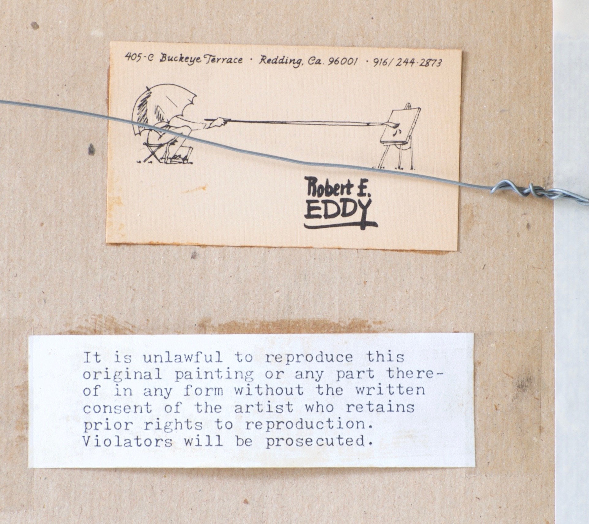 As an avid fly fisherman, his paintings of rivers and the fish they were famous for, became a focus for many years and were presented at flyfishing conclaves, one being in Yellowstone in 1981 where Jimmy and Rosalyn Carter acquired one of his paintings. Eddy was very well known in Santa Cruz, California, his final place of residence.