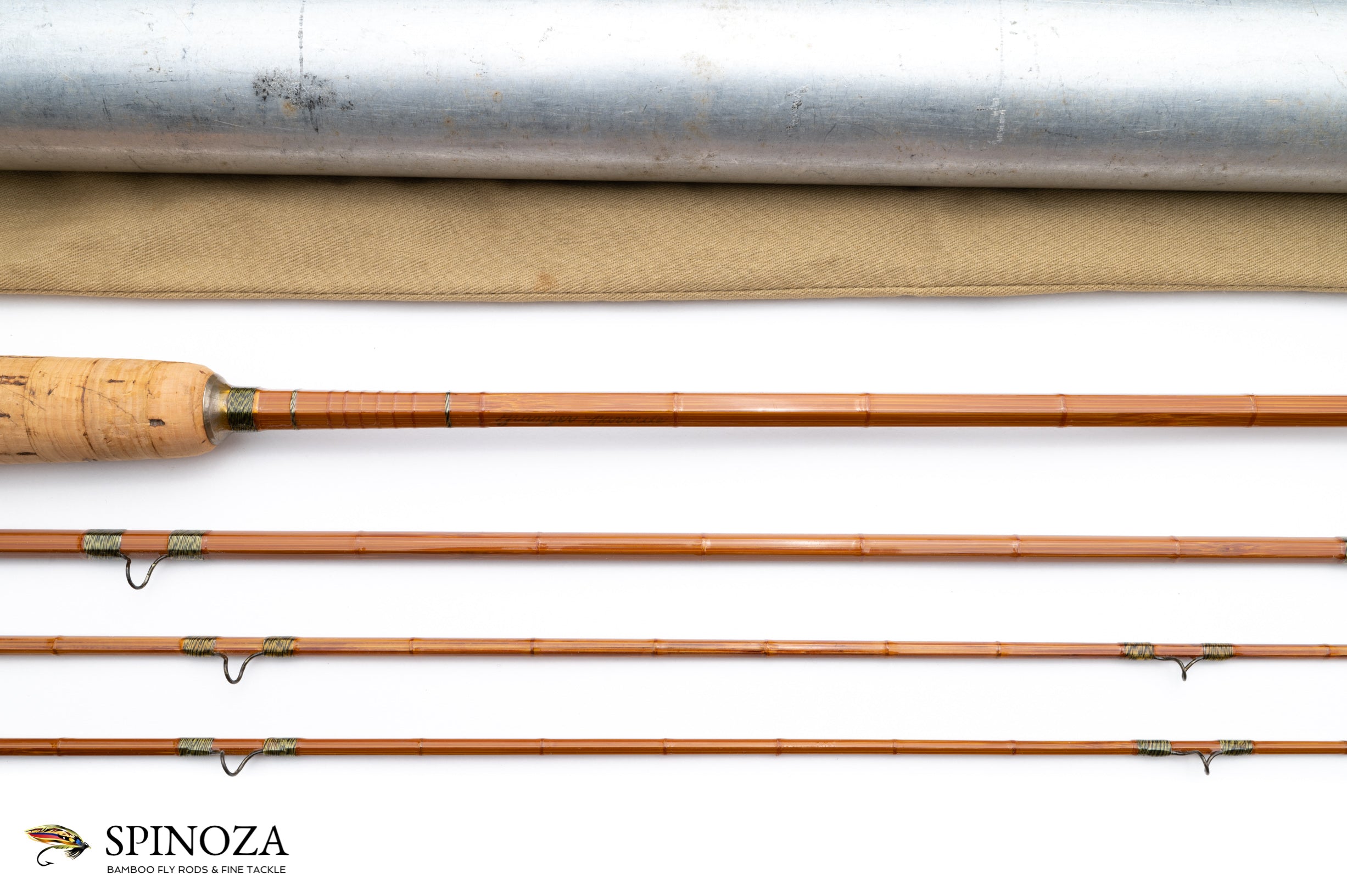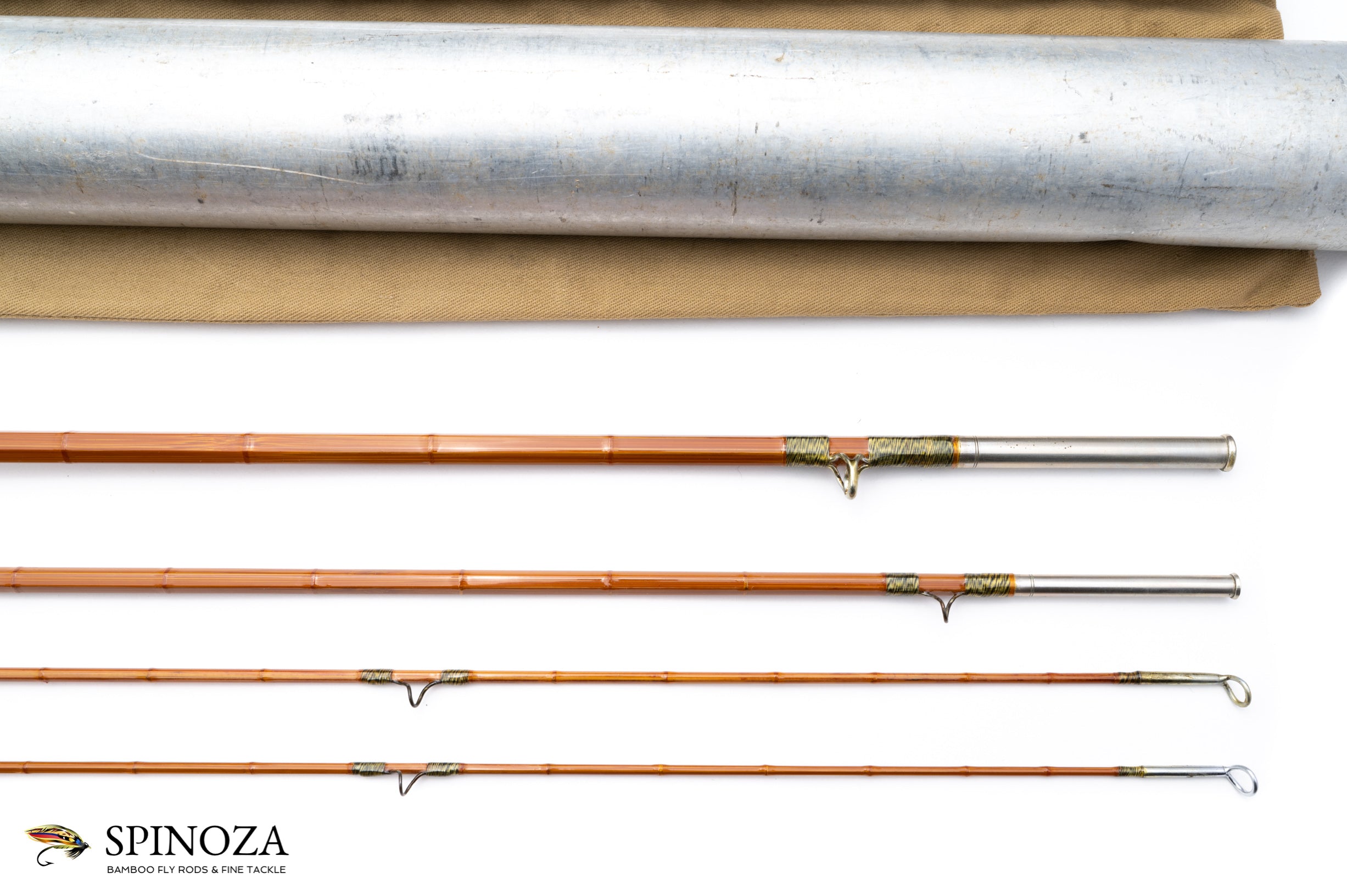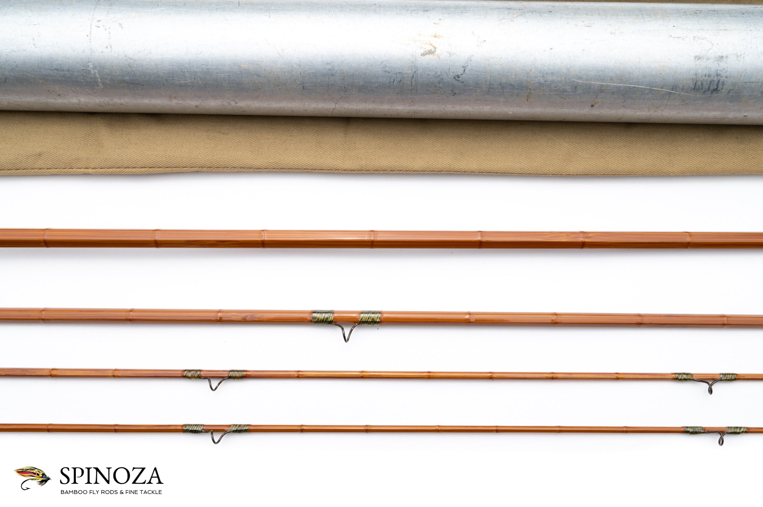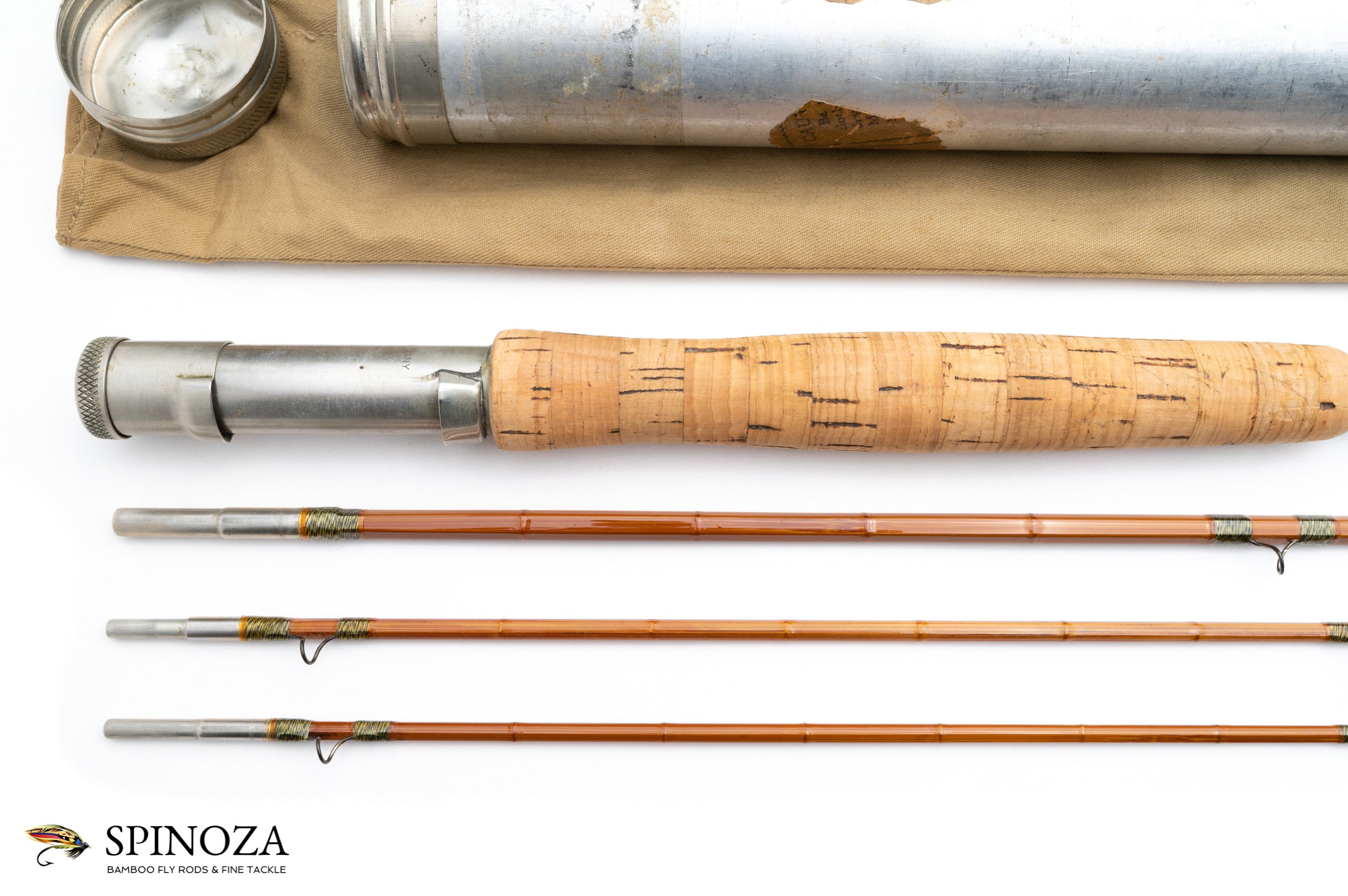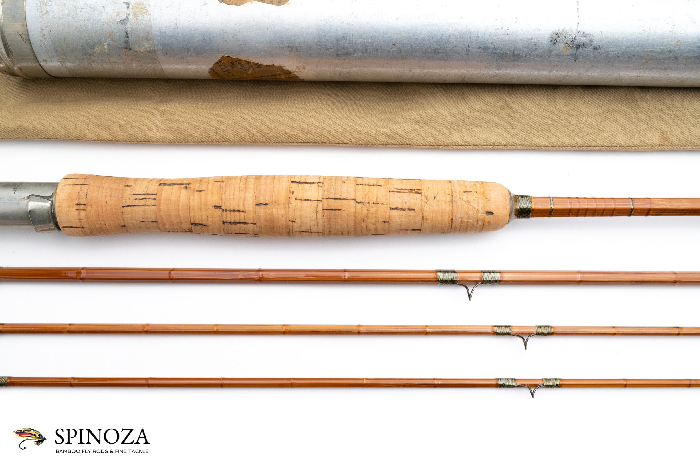 A Goodwin Granger Favorite fly rod, 7'6", 3-piece, 2-tips, with one of them replaced. Refinished condition. Pleasant medium fast action for a #4. Steam and ammonia tempered cane with a dark three-up node pattern. Very decent refinish job with original jasper threads and original guides, the latter with a small bit of wear. The grip is western style profile that is 6 1/2" long. It has been cleaned with some minor ridging as a consequence. The "Granger Favorite" stamp is fairly faint. The reel seat is the uplocking all-nickel silver screwlock with the opposed pocket cap. 2 patent dates stamped on the reel seat as well as "Made by, Goodwin Granger Company, Denver". One tip is a replacement and glued with resorcinol glue. The rod packs in the original bag and tube.