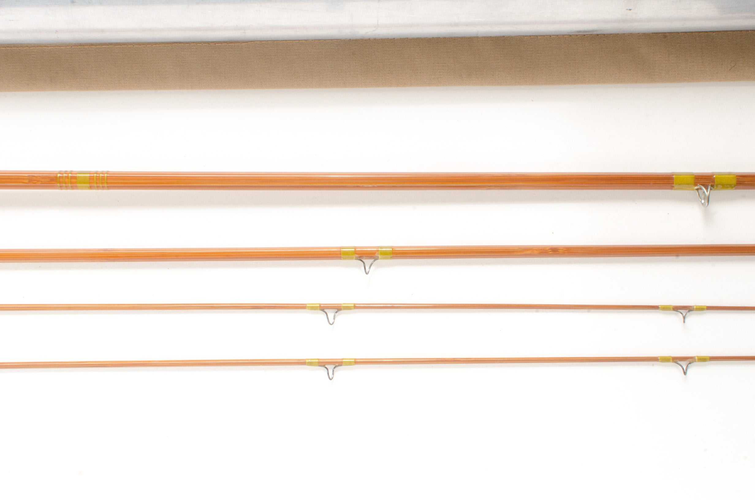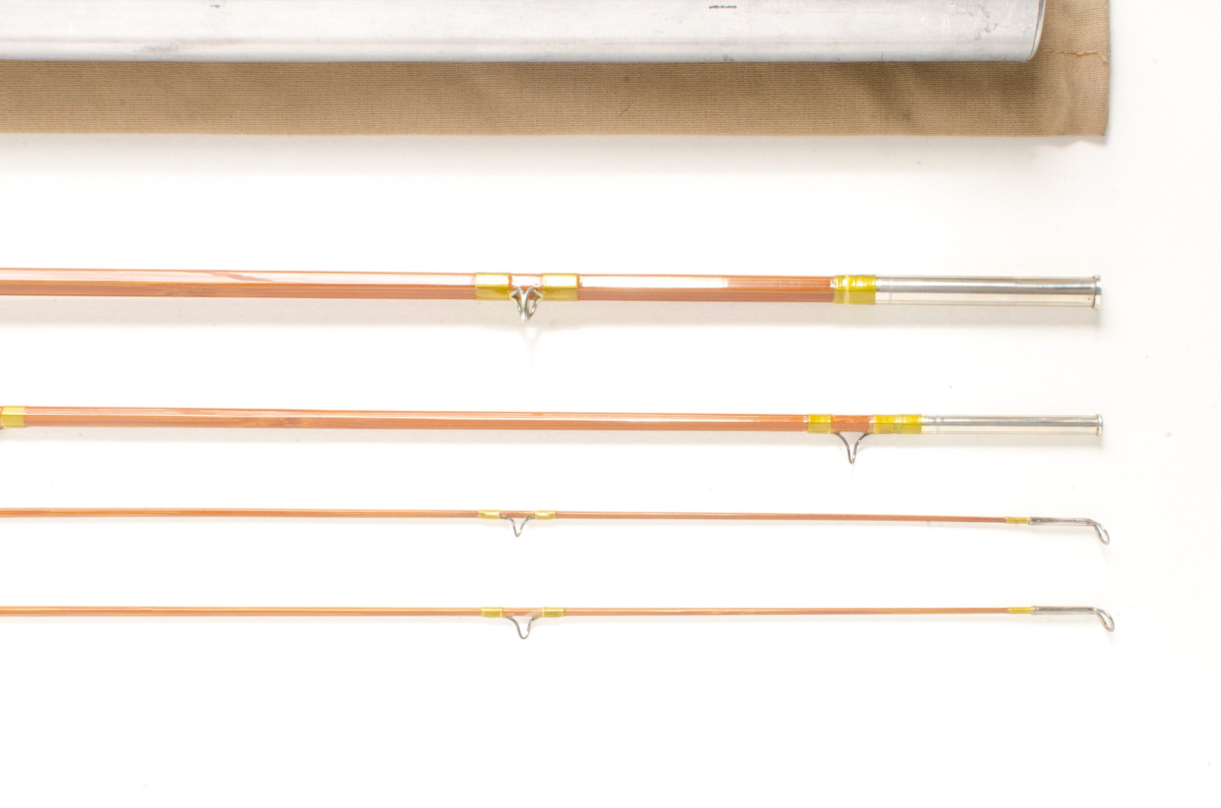 A refinished 8'6" Granger Special fly rod, 3-piece, 2-tips and built for a #5 line. Medium fast action. This rod has been refinished and would be in great fishing condition were it not for a 2" long delamination at the swell. The tips are glued with resorcinol while the butt and mid have not suggesting the tips are replacements. Nice varnish with pale olive wraps. 3 up node pattern. Ferrule fits are good and the rod is straight. 5 1/2" western-style grip. All-metal down lock slide band and soldered pocket cap reel seat. There are a few of the typical dings in the bottom of the reel seat.  The reel seat is stamped "Made by, Goodwin Granger Co, Denver". The price reflects the fact that this rod needs some home handyman attention. The rod comes in a replaced tan bag and an aluminum tube.