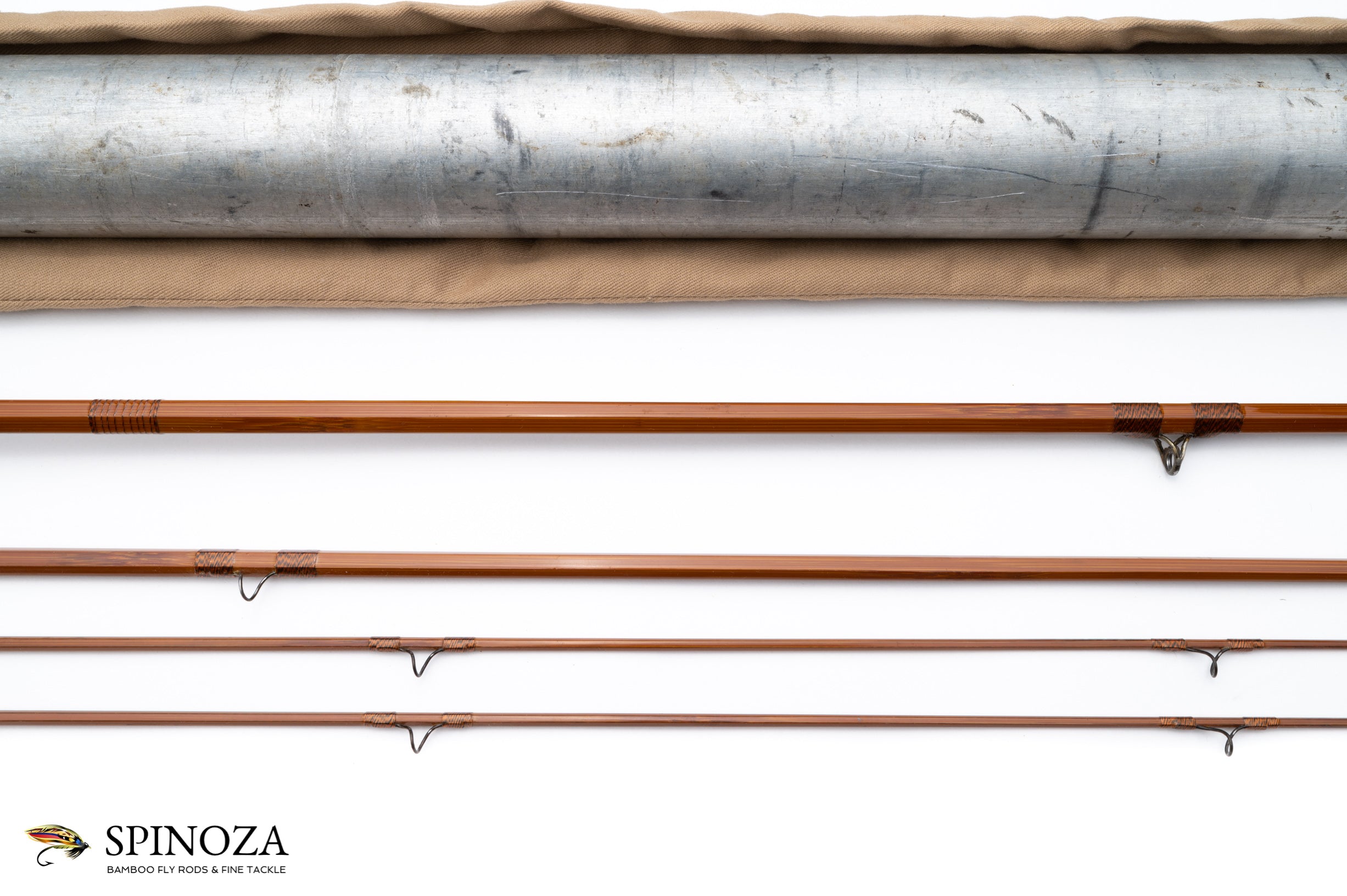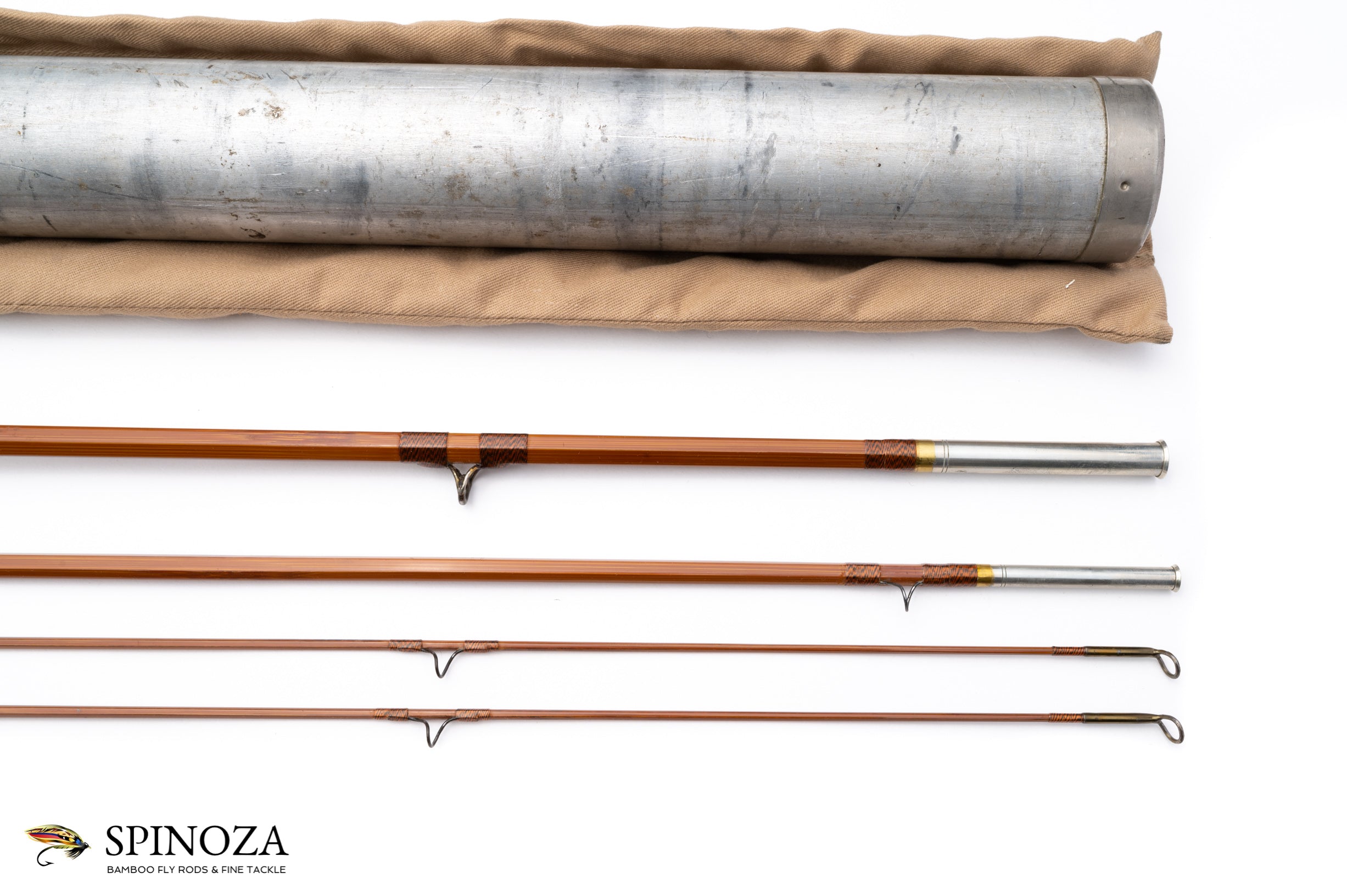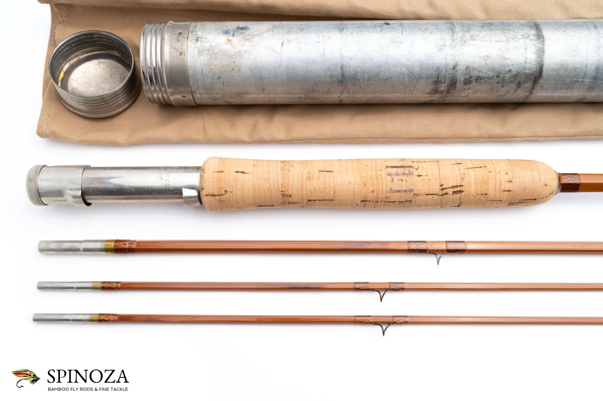 A nice Granger Victory fly rod, 8'6", 3-piece, 2-tips, built for a #5 or #6 line. 5 ounces. One the fast side. I can't make up my mind whether this is original or refinished. The grip has been cleaned and has some mild damage as a result. However, the orange  and black jasper wraps and the varnish is in perfect mint condition. A superb restoration if it is a refinish. The nodes are three up pattern and the temper is steam and ammonia. The tips are glued with resorcinol, with the attendant black edges. The grip is 6 1/2" long and shaped to a western style profile. The seat is the all nickel silver uplocking screwlock employing a double pocket cap. The seat is stamped with a makers mark and patent date. The stripping guide is a small #8 perfection and the dark HSS snake guides show a small amount of brassing. A tan cloth bag and the original tube come with the rod.