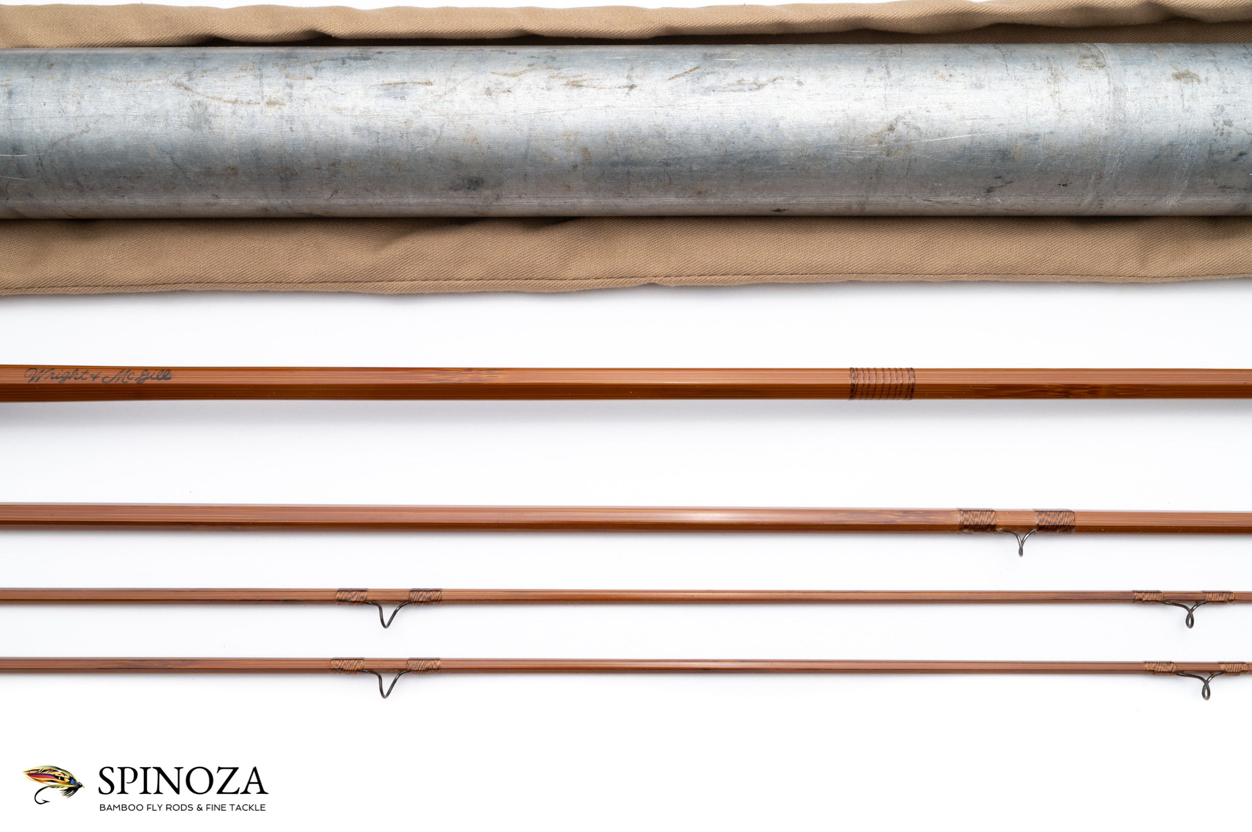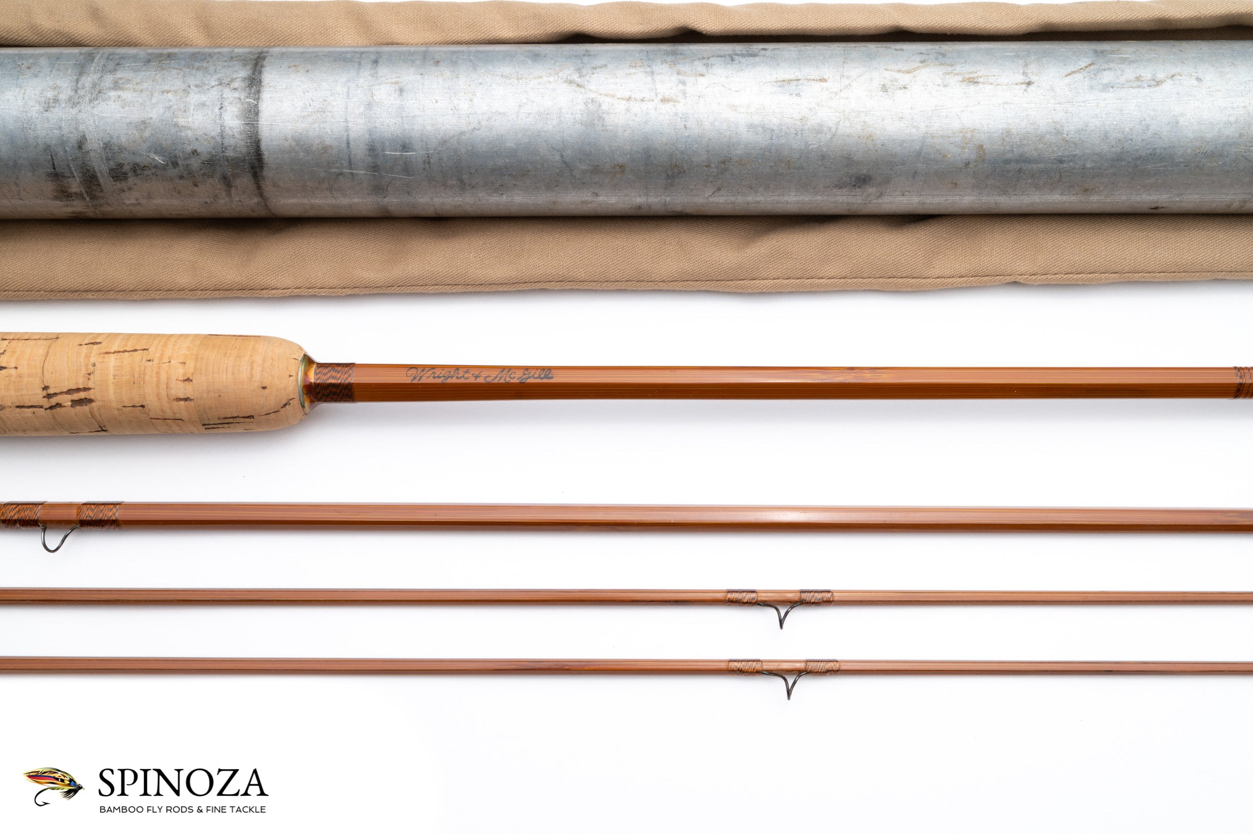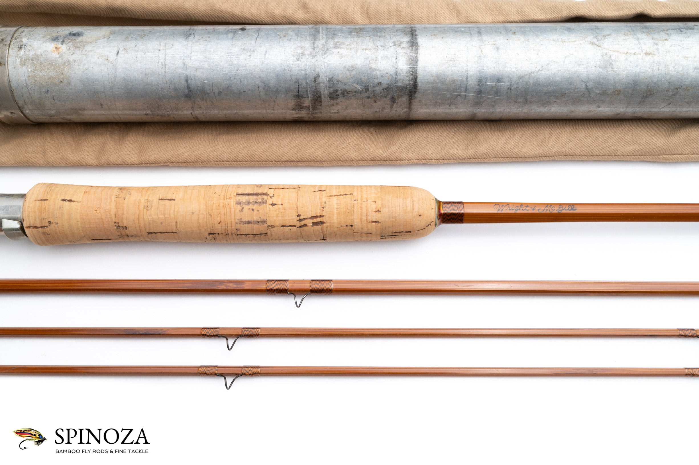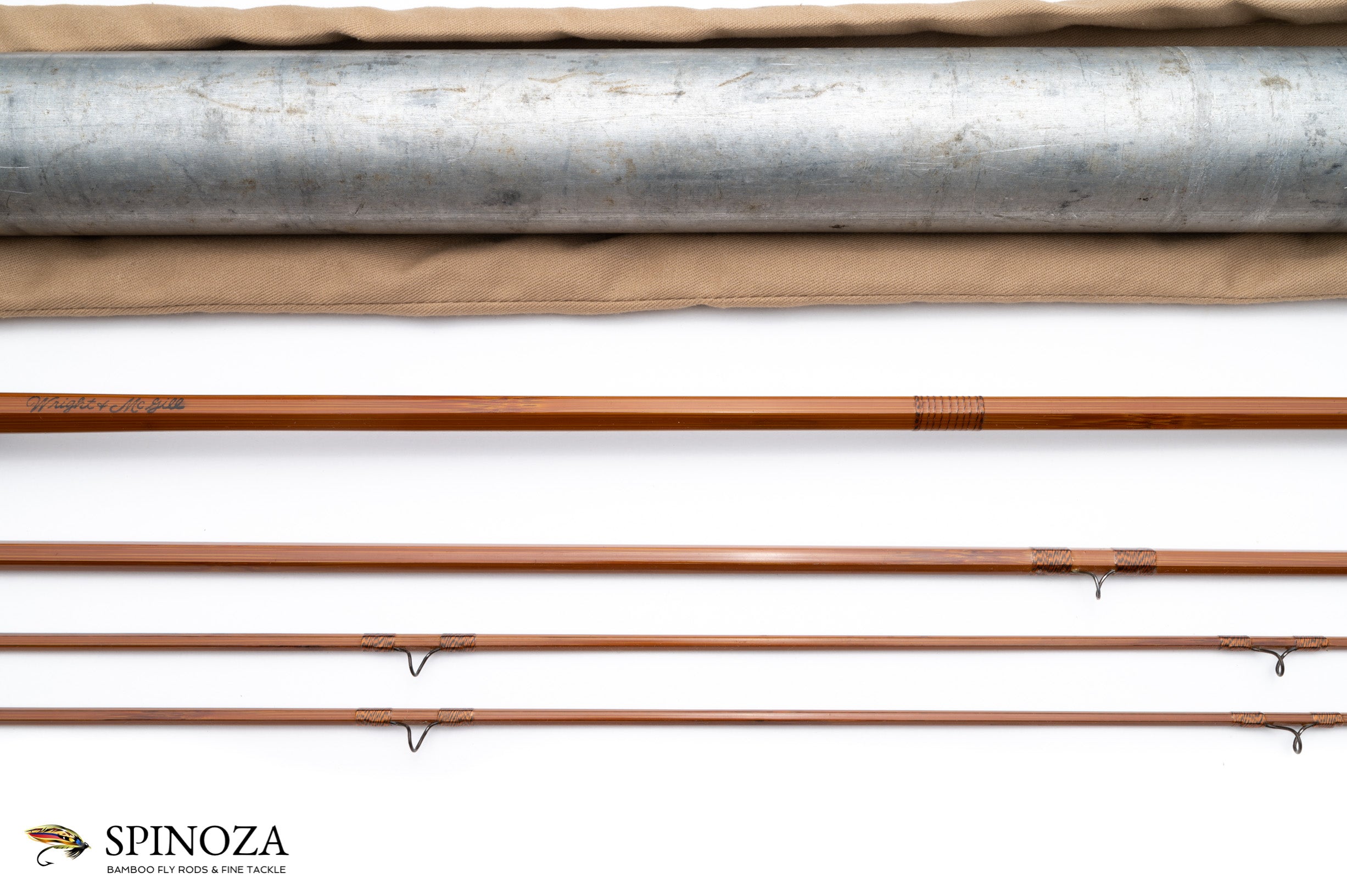 A nice Granger Victory fly rod, 8'6", 3-piece, 2-tips, built for a #5 or #6 line. 5 ounces. One the fast side. I can't make up my mind whether this is original or refinished. The grip has been cleaned and has some mild damage as a result. However, the orange  and black jasper wraps and the varnish is in perfect mint condition. A superb restoration if it is a refinish. The nodes are three up pattern and the temper is steam and ammonia. The tips are glued with resorcinol, with the attendant black edges. The grip is 6 1/2" long and shaped to a western style profile. The seat is the all nickel silver uplocking screwlock employing a double pocket cap. The seat is stamped with a makers mark and patent date. The stripping guide is a small #8 perfection and the dark HSS snake guides show a small amount of brassing. A tan cloth bag and the original tube come with the rod.
