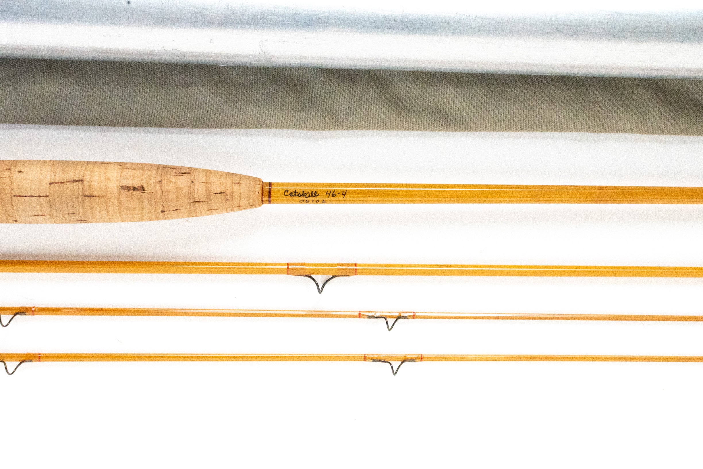 A nice Hal Bacon (Kosmic Rod Co) fly rod, a 46-4 "Catskill" model, 6', 3-piece, 2-tips, built for a #4 line. Serial #06106. 2.7 oz. Excellent used condition. A crisp, fast action. The rod has very light hand soiling to the grip, some reel foot impressions to the slide band seat, and a small hook graze scratch about 3" up from the keeper wrap but it does not go through to the bamboo. The bamboo itself is wheat straw color and the rod has a three up node pattern construction. The wraps are a light-colored tan main with red edges and a black band at the male ferrules which are wrapped in light olive. The ferrules are Leonard style step down and all the hardware is polished bright. The reel seat is varnished tiger maple wood with a cap and ring slide band. The cap has a roll die stamp "Kosmic" in a cartouche and underneath "Kosmic rod co L.L.C." The grip is a finely pointed cigar about 5" long. The rod packs into a tan cloth bag and an aluminum tube with a brass top and bottom.