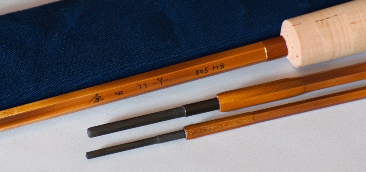 For sale here is a hollow-built bamboo rod handcrafted in Japan by Katsumi Harada - 8 feet, 3/1 for a 5 weight line. The rod is constructed from madake cane, creating a light and medium progressive action, aided by his use of a carbon spigot ferrule system, allowing the rod taper to flex consistently through the ferrule sections. Harada-san points out that madake cane has very fine fibers, resulting in a slower action, yet not weak. The fine fibers also result in blanks with a very smooth and beautiful surface. The rod also features a nicely-tapered wood reel seat spacer which the Japanese call "Karin" (a type of rosewood). Light brown silk wraps with gold edges. The rod weighs 3 7/8 oz and is built using a 3x3 side-by-side node pattern. The spar urethane varnish is very exquisite. Comes with very nice custom rod bag and no tube. Simply a wonderful rod -- you will not be disappointed!
