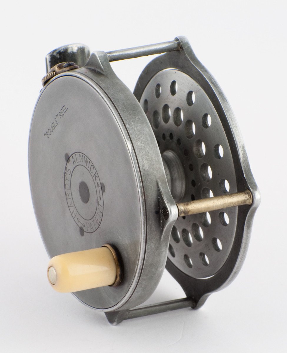 For sale here is an extremely scarce, original Hardy Bougle fly reel in excellent+ condition. 3" diameter. The full-length smooth foot is made from the same alloy as the reel and is attached with 4 screws. It has an ivorine handle, nickel silver rim tension regulator screw with brass bridge. The check dates the reel between 1903 and 1905. The drum locks by means of a left-hand threaded screw. Stamped inside on the frame, spool and winding plate is “1". The bottom pillar is a roller pillar. The length of the reel foot is 2 7/16".