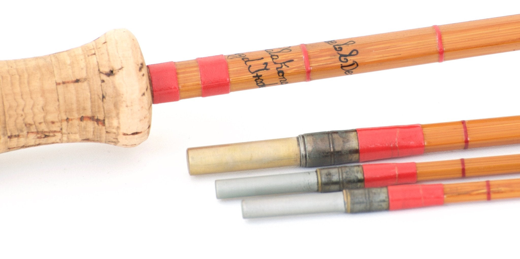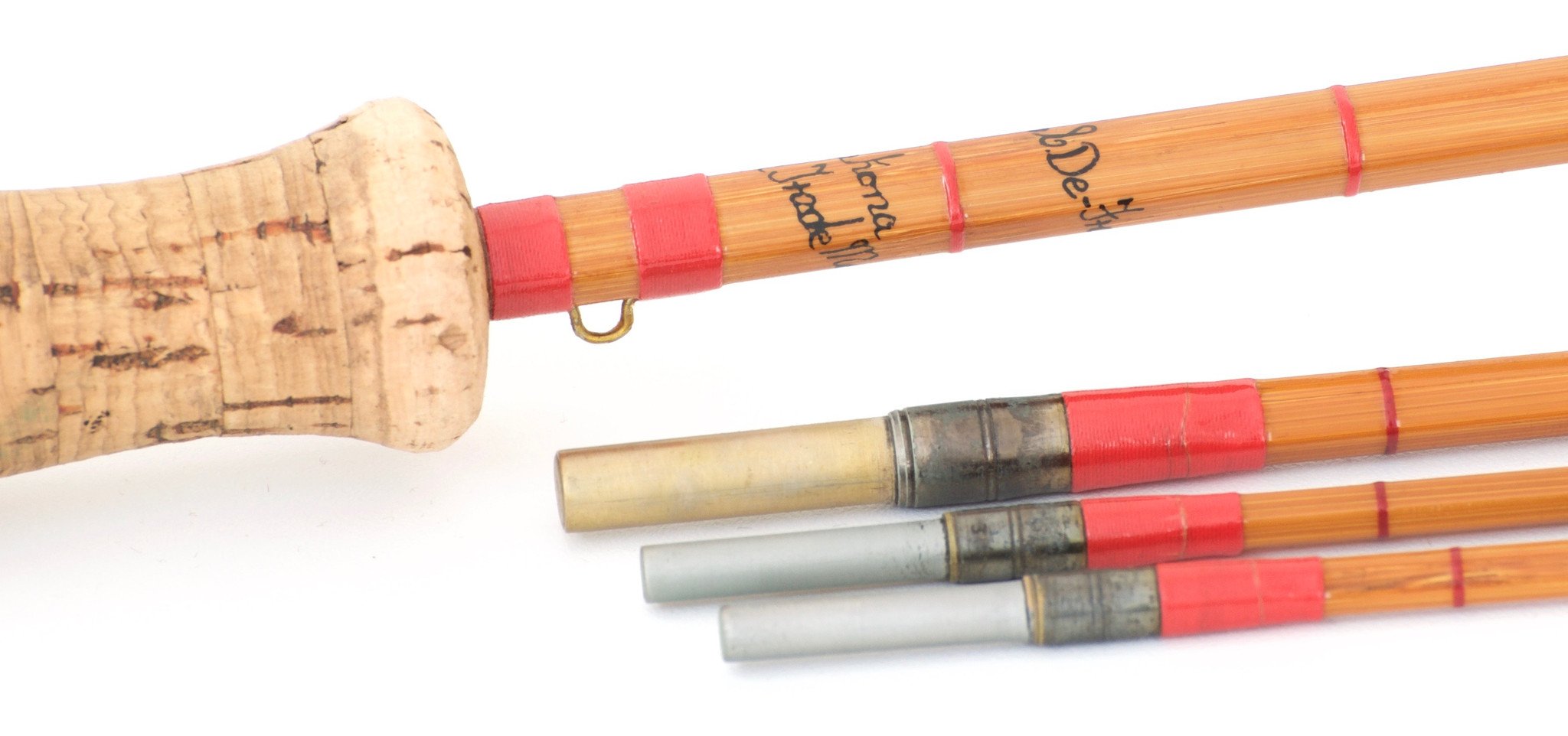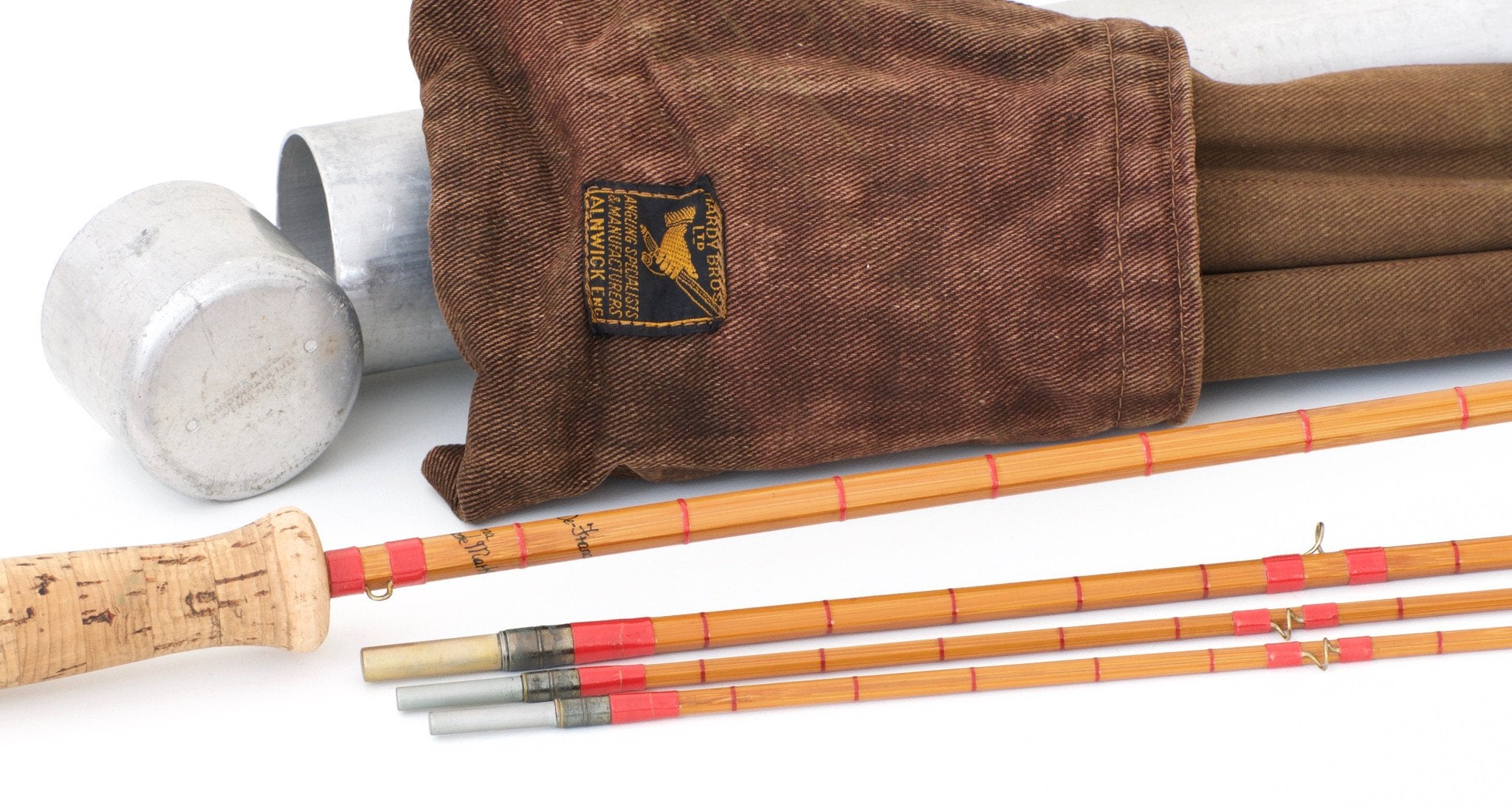 For sale here is a Hardy Palakona "CC de France" 8' 5wt 3/2 bamboo fly rod made in 1927. Serial no. E60312. The rod is in excellent refinished condition. All sections are full length and straight. The rod was re-wrapped and re-varnished by Hardy Bros. The original intermediates remain on the mid and both tips. Medium blonde cane, handsome brick colored agate stripper, oxidized brass ferrules. U-shaped hook keeper. Half wells grip only lightly soiled (thanks Lars!). Bright aluminum cap and ring reel seat with a cork spacer. Ferrule sizes 11/64 and 16/64, the fit is very nice. Bright aluminum sculpted ferrule plug for the mid section, the butt section ferrule plug is not present. The rod weighs 4.30 oz. The action is more on the medium side of medium-fast, perfect all-around balanced rod action. Includes presumably the original rod bag with very interesting camouflage print and pocket for ferrule plug when not in use, and original tube.