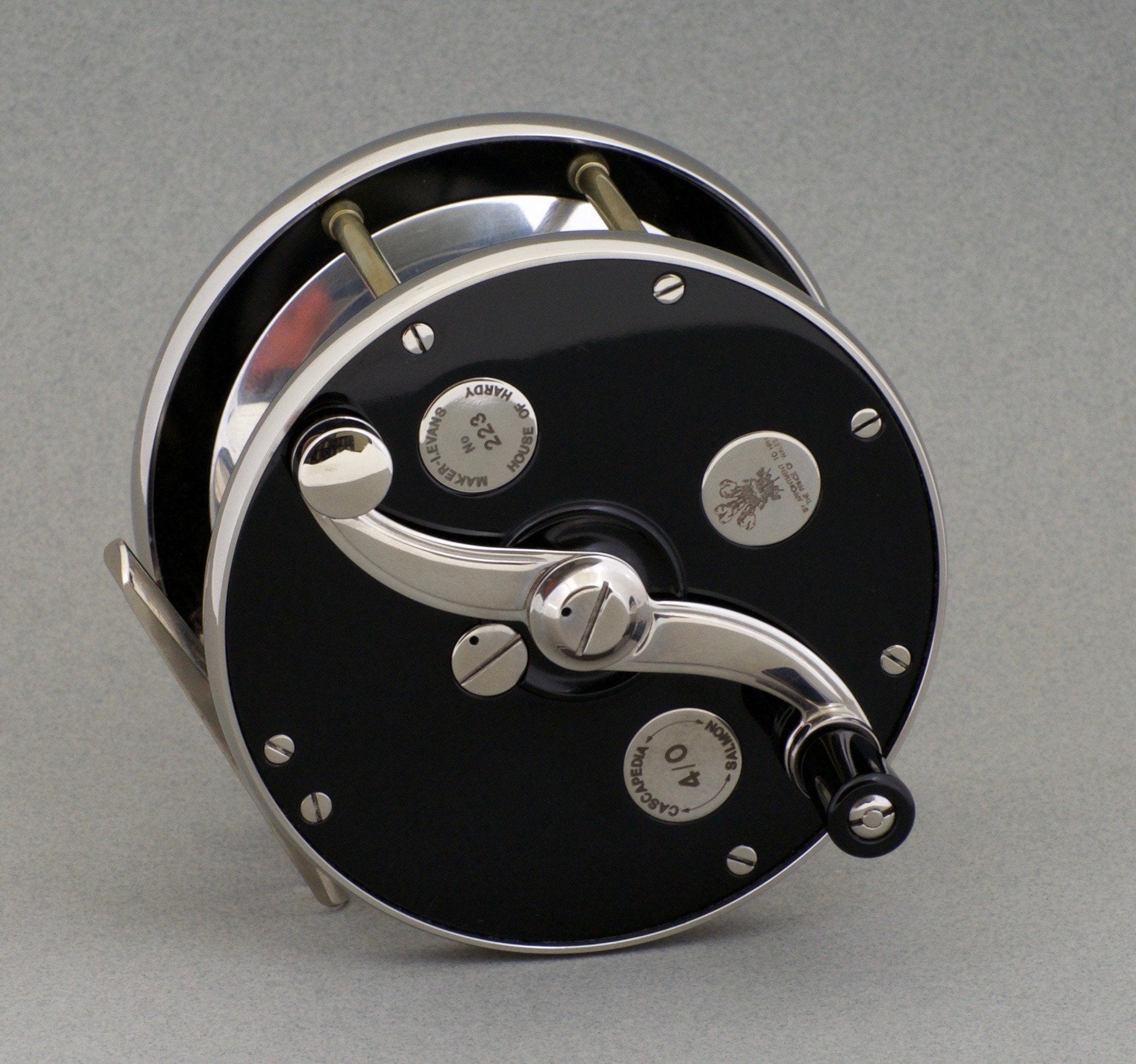 For sale here is a Hardy Cascapedia 4/0 Ltd. Edition Fly Reel. Booklet signed by reel-maker Ian W Evans. All original with box, sleeve, block leather case and booklet. Right-hand retrieve. The reel has a few very minor handling marks, so while not in absolutely mint condition, it's really close.