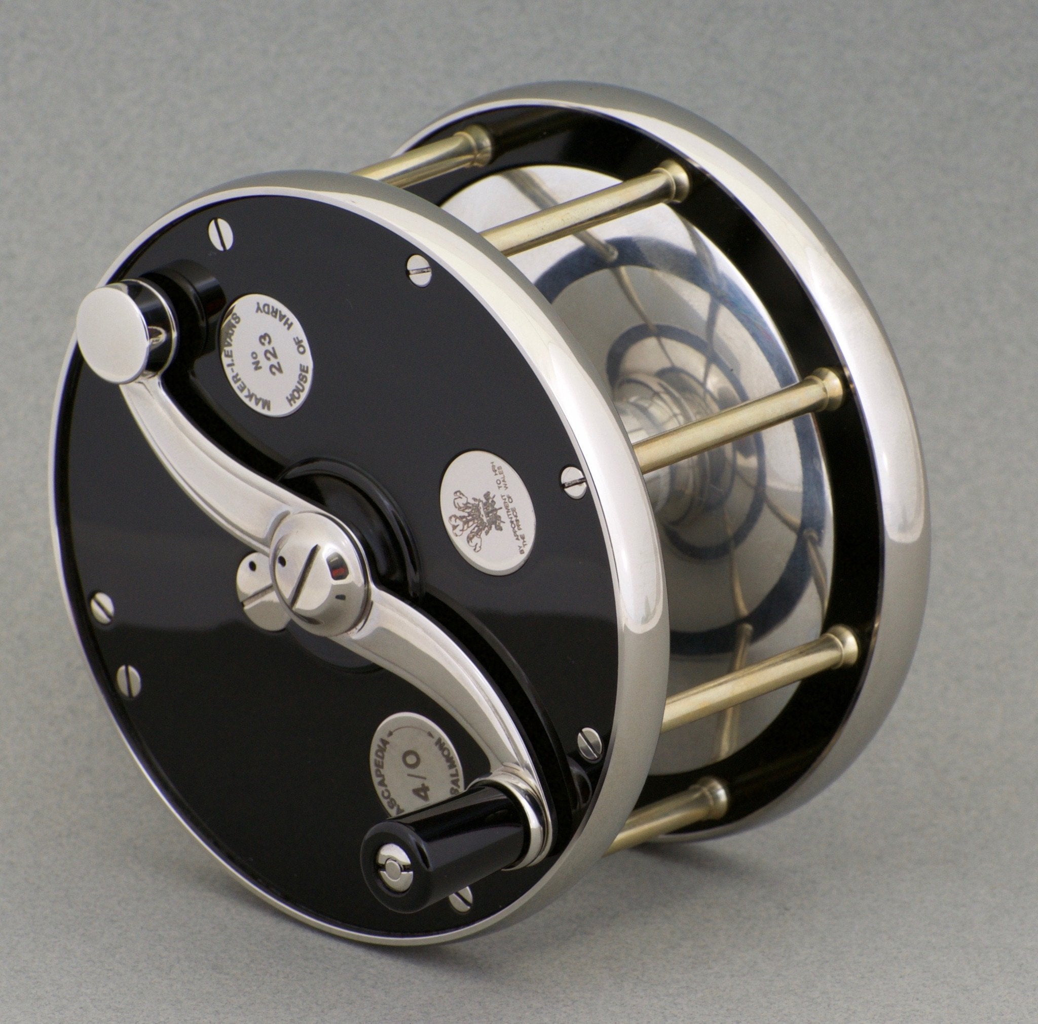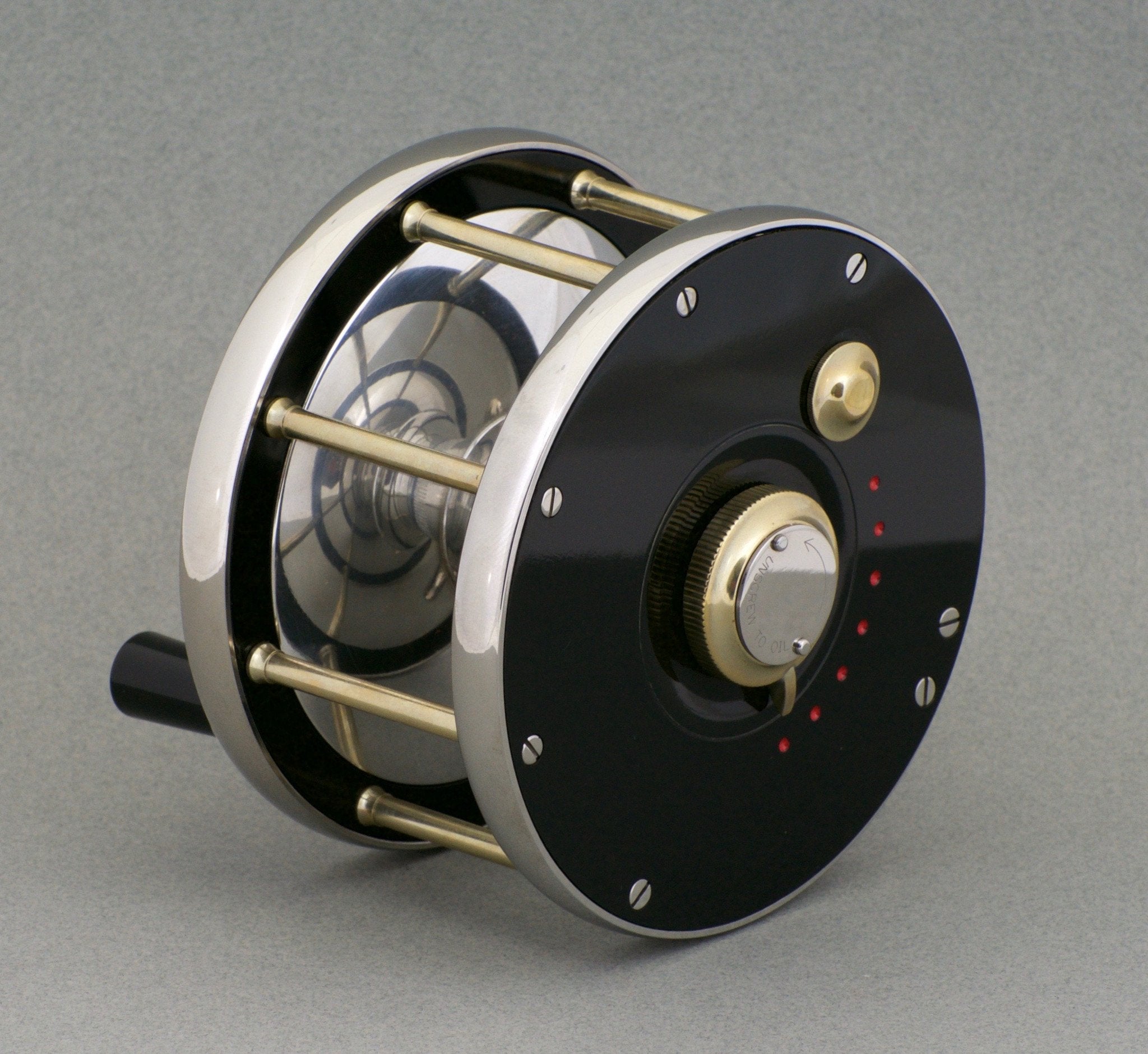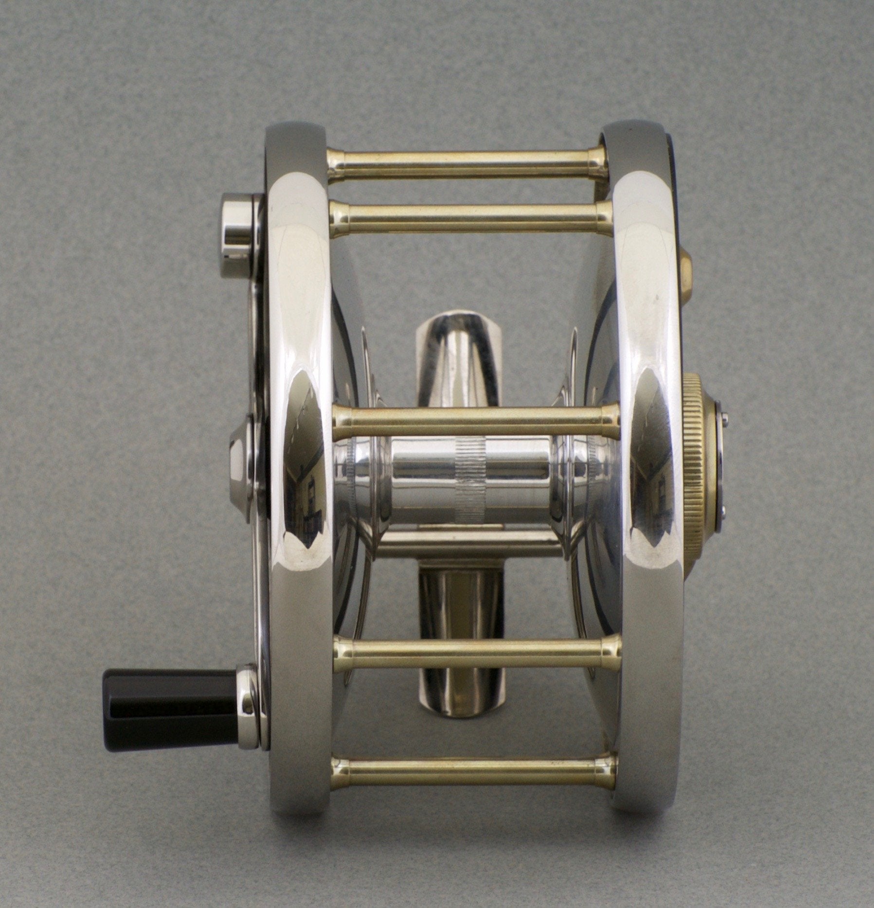 The drum is made from highly polished bar-stock aluminium. The side-plates are polished ebonite, the rims are stainless steel, the reel seat is brass nickel, and the pillars, drag selector, and check button are finished in nickel silver. The S-shaped handle has been carefully counter-balanced to prevent the slightest shudder in a reel running at high speed. When a hooked fish finally turns at the end of a long run, the 1.7/1 ratio of the multiplier allows fast take-up of any slack in the line. The drag selector can be adjusted to seven different levels, and the check button allows for an audible click or silent operation as preferred.