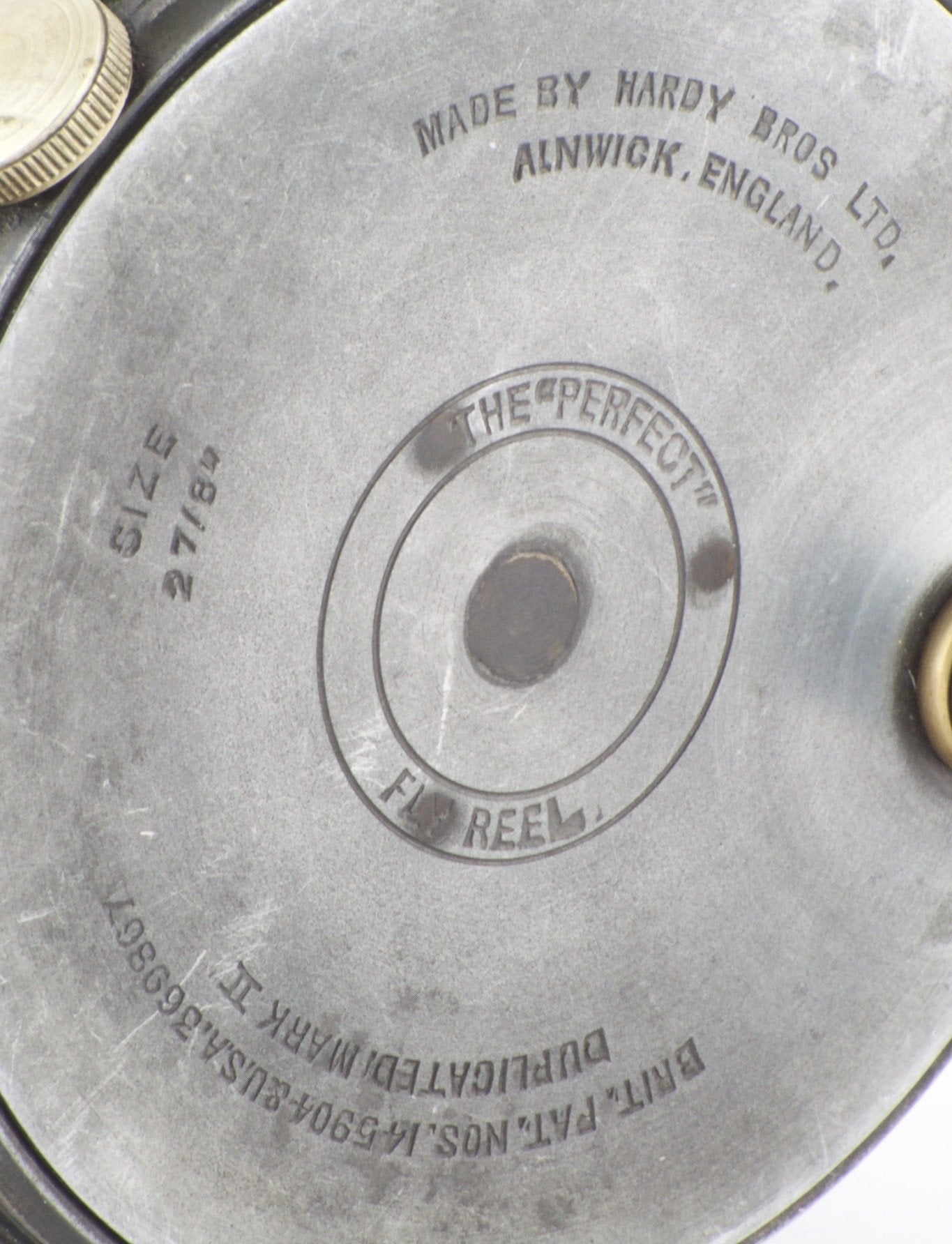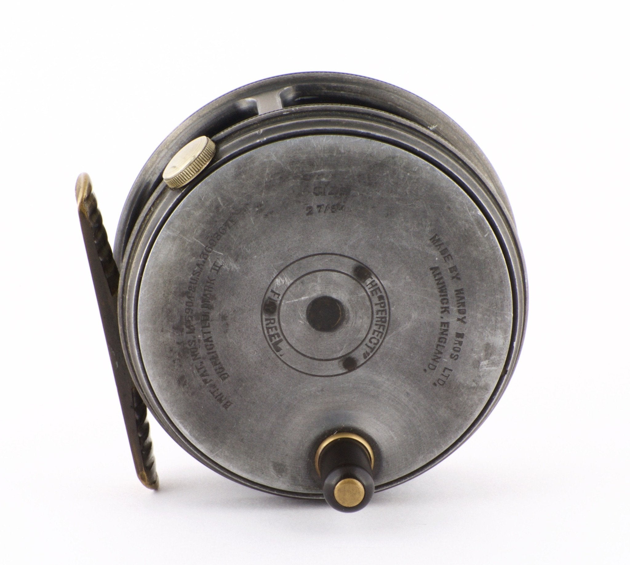 For sale here is a Hardy Perfect 2 7/8" trout fly reel from the 1930s with full-length ribbed brass foot, ebonite handle and rim tensioner. Duplicated MKII check. A very nice reel mechanically and cosmetically. No cracks, chips, or dings.