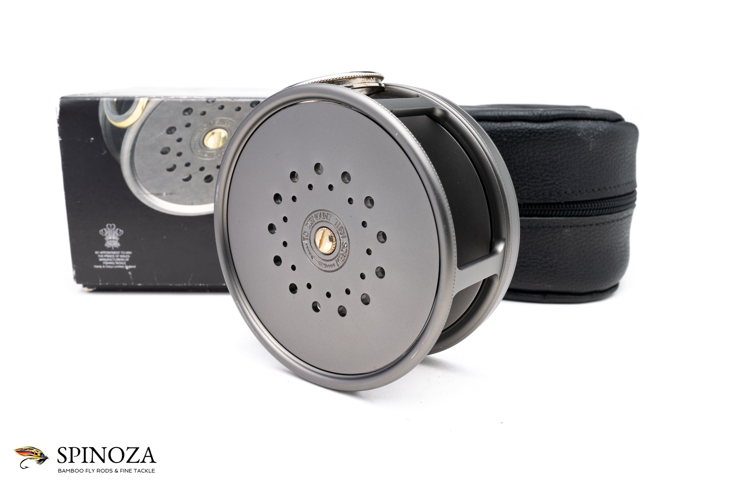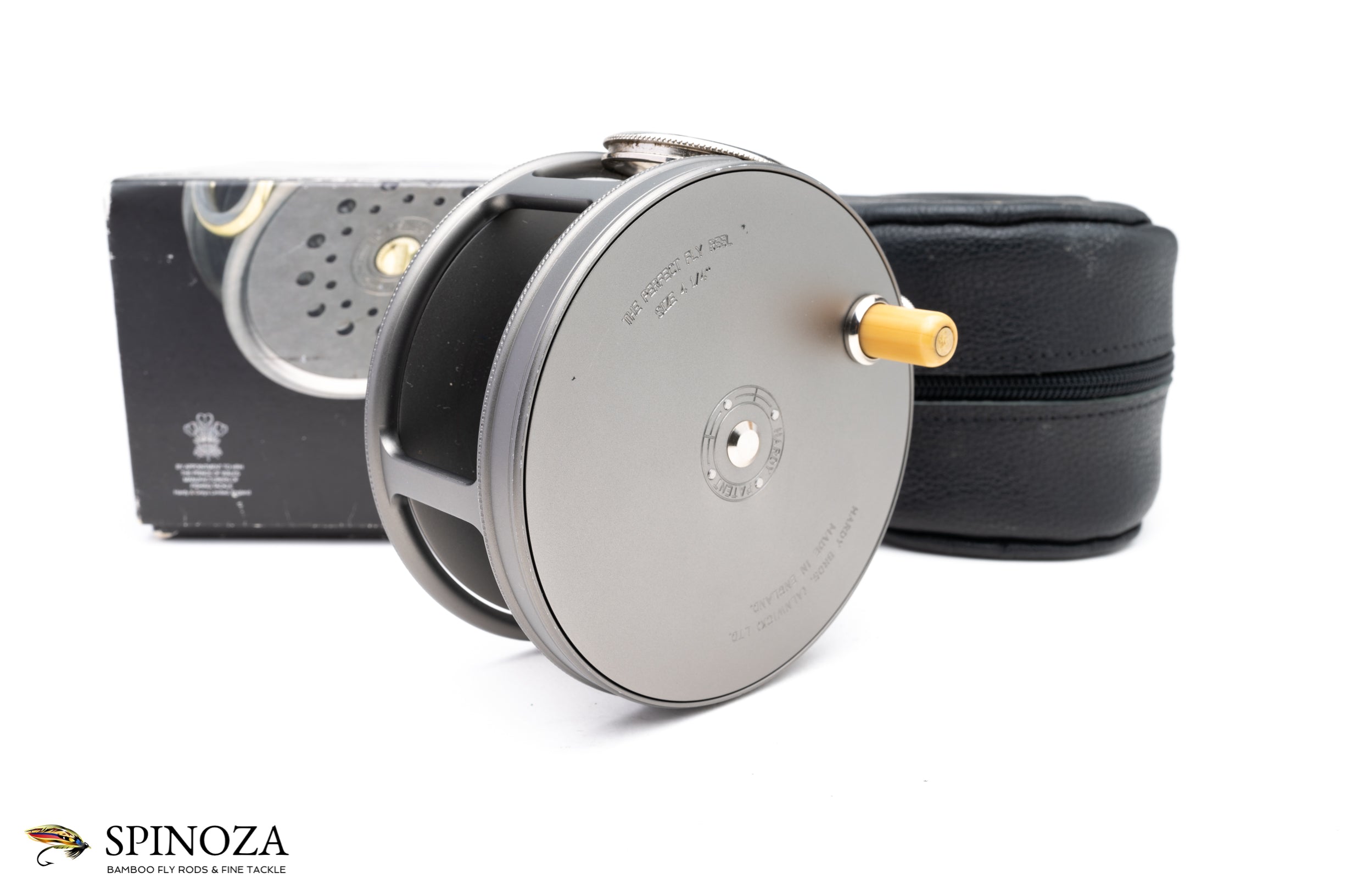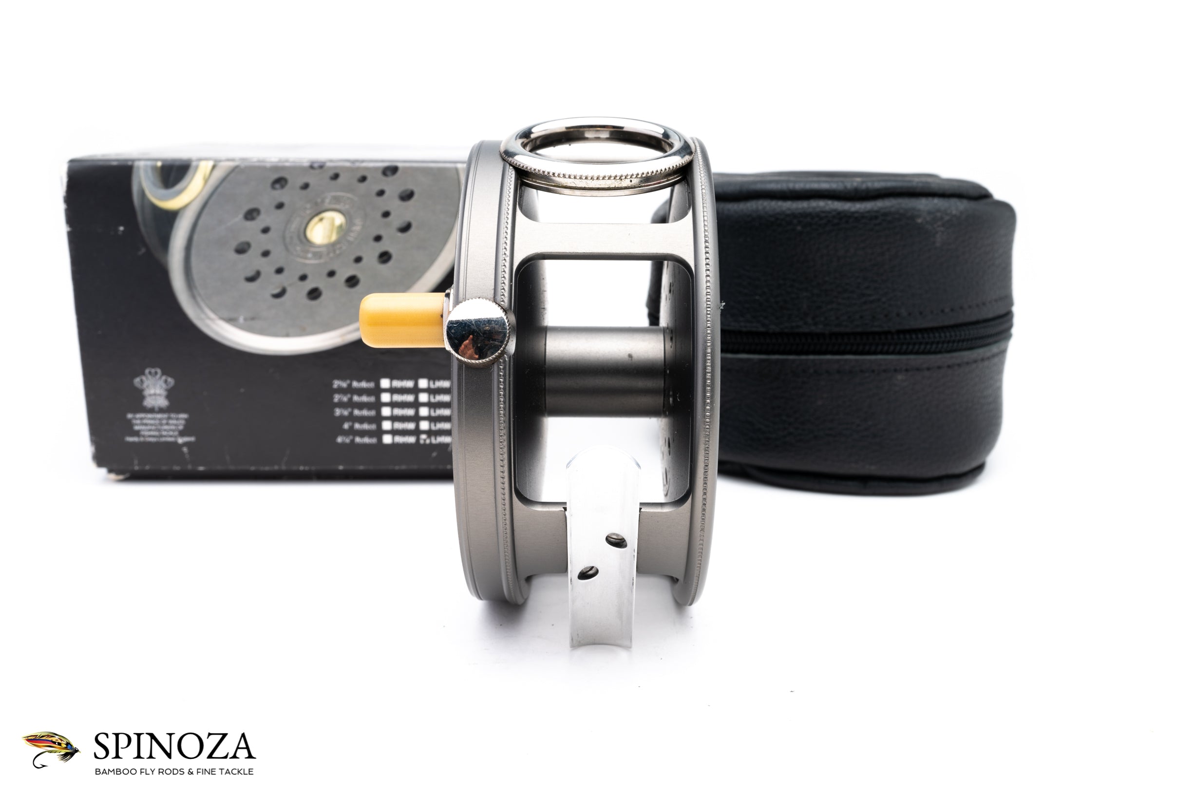 A nice Hardy Salmon Perfect fly reel, 4 1/4” diameter. LHW. This is a fine example of the reintroduced Perfect models that came out in 2008. This one, serial #A46129, has the nickel silver revolving line guide, an ivorine handle and a smooth aluminum foot. There is plenty of click/drag built into this reel and save for an almost imperceptible nick on the rim this Perfect would rate mint. It comes in the sheepskin lined zippered leather pouch and the correct Hardy box with the instruction pamphlet. In this condition, in LHW, these reels are very hard to find.