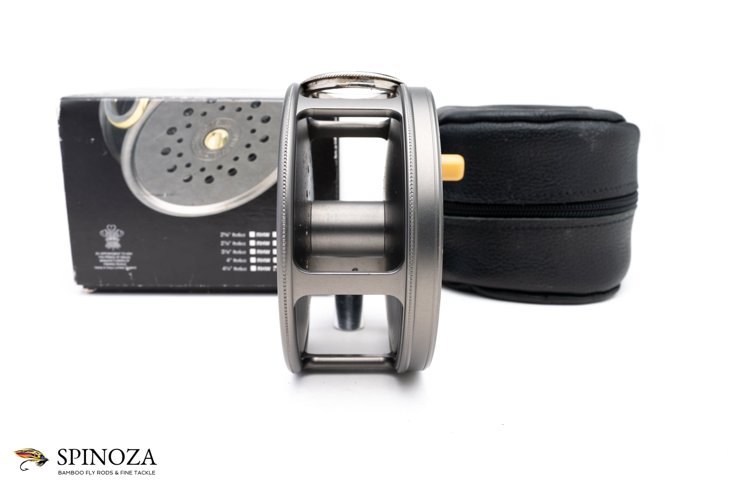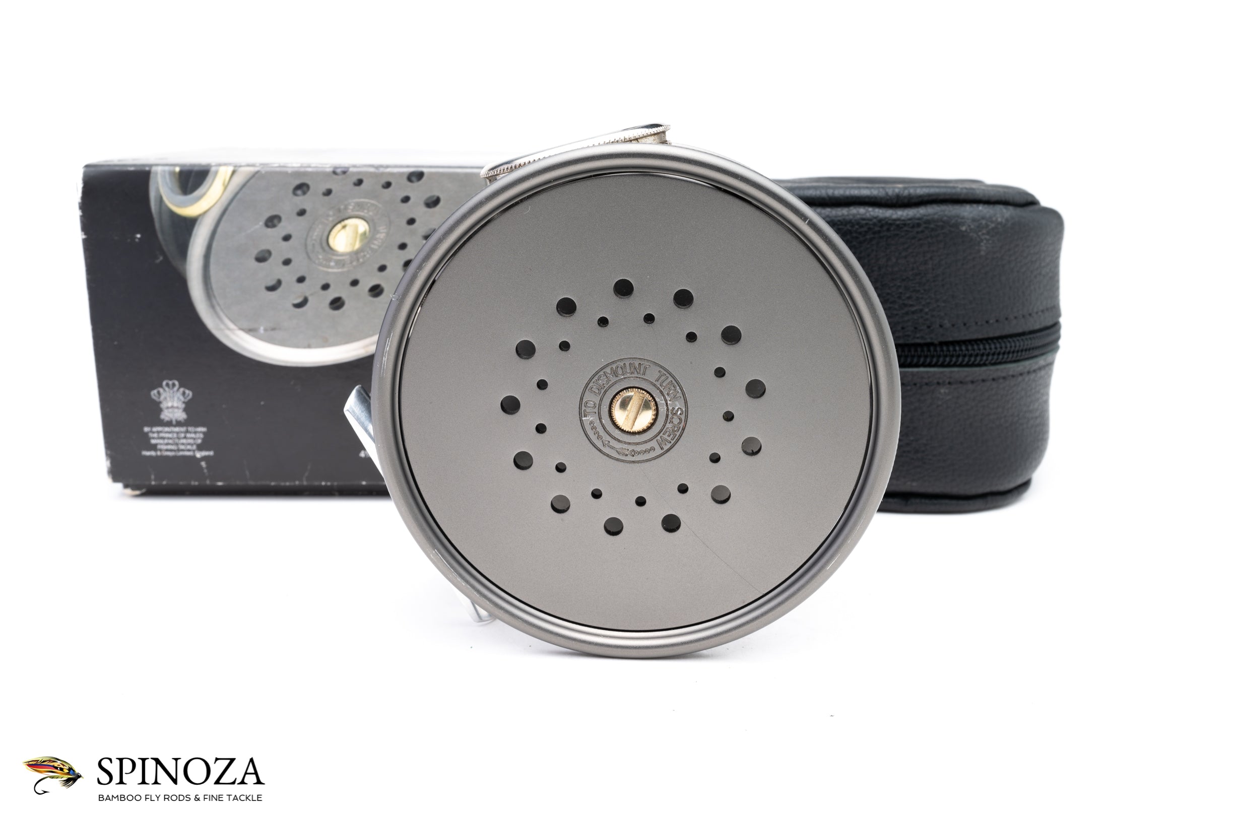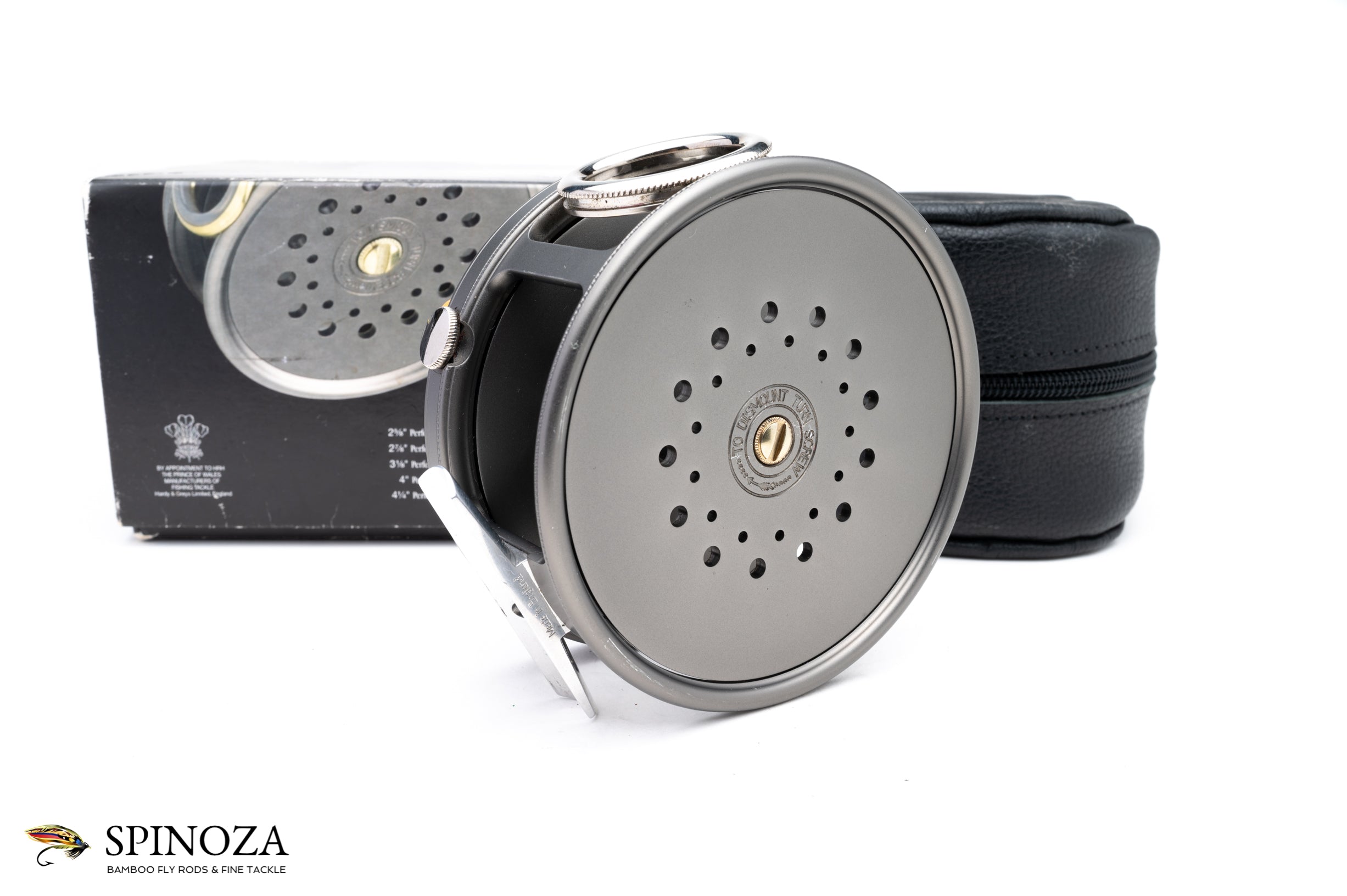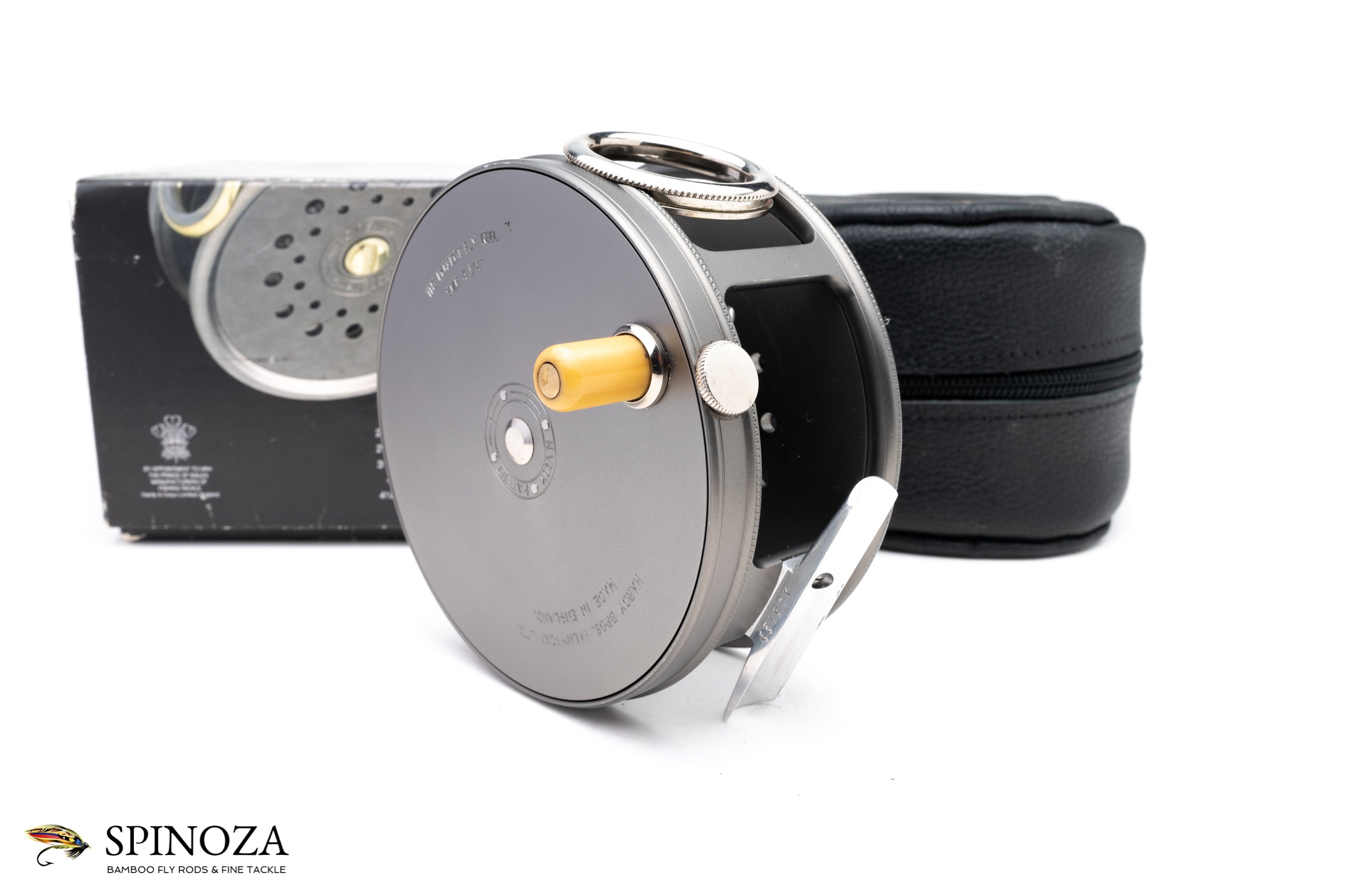 A nice Hardy Salmon Perfect fly reel, 4 1/4” diameter. LHW. This is a fine example of the reintroduced Perfect models that came out in 2008. This one, serial #A46129, has the nickel silver revolving line guide, an ivorine handle and a smooth aluminum foot. There is plenty of click/drag built into this reel and save for an almost imperceptible nick on the rim this Perfect would rate mint. It comes in the sheepskin lined zippered leather pouch and the correct Hardy box with the instruction pamphlet. In this condition, in LHW, these reels are very hard to find.