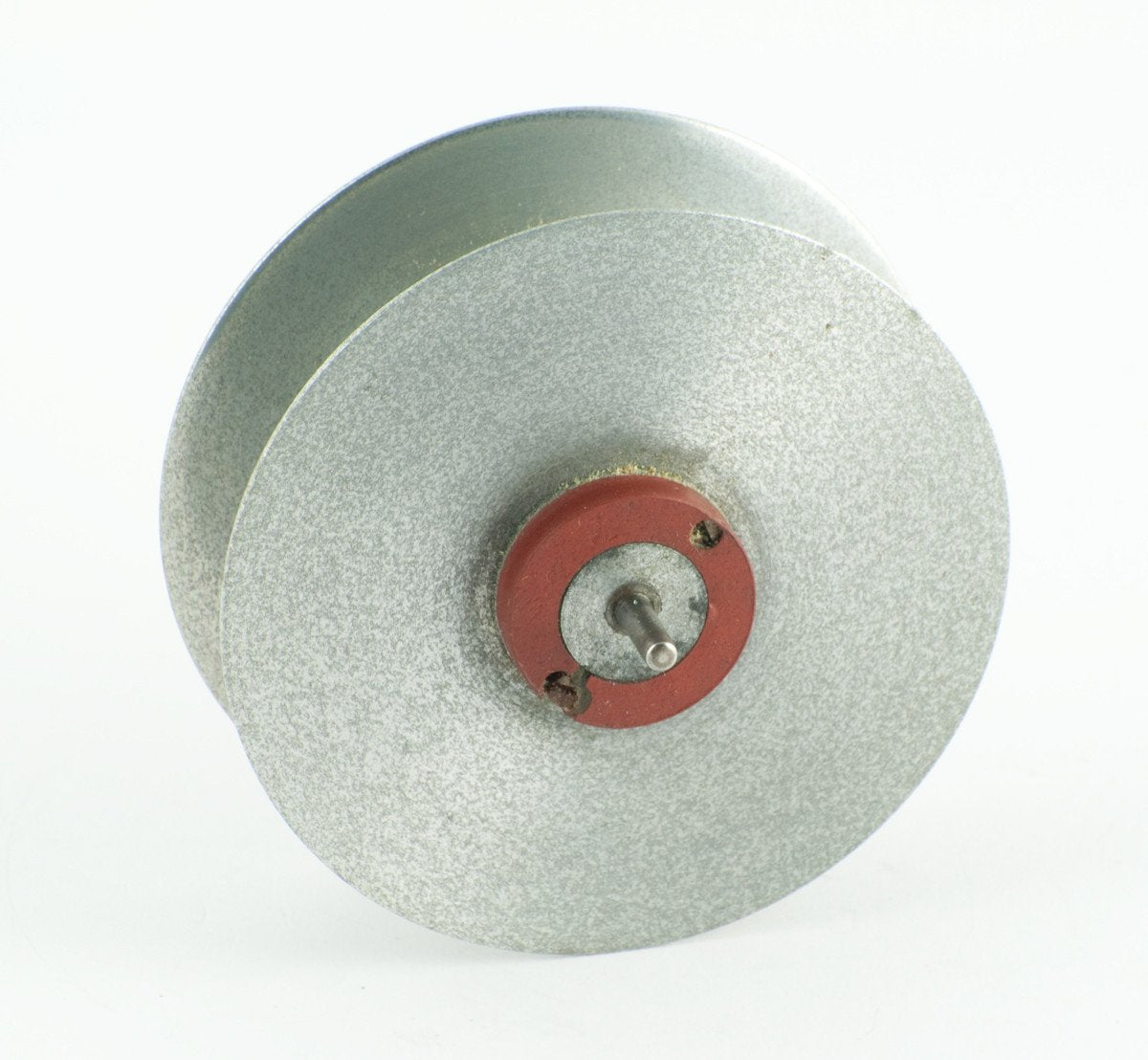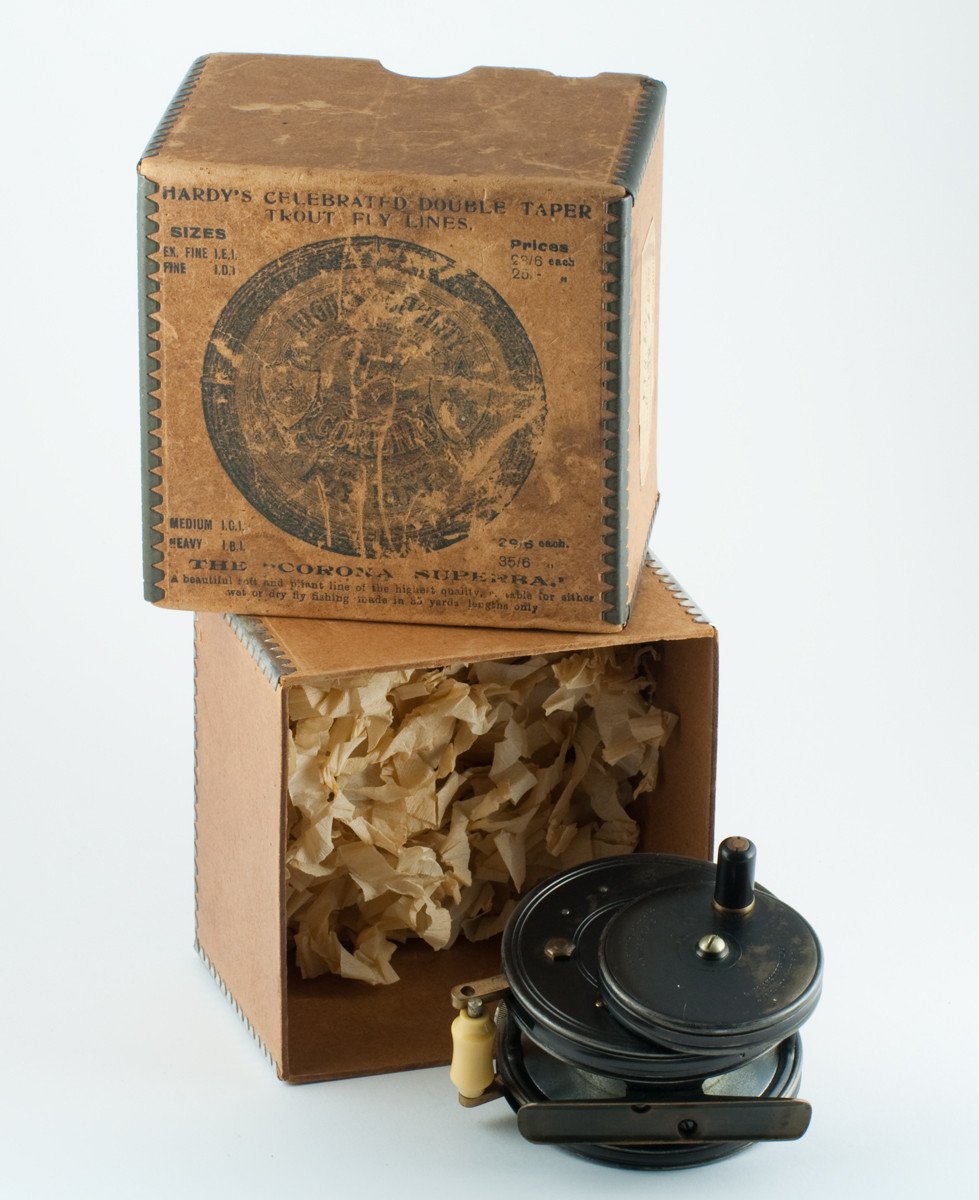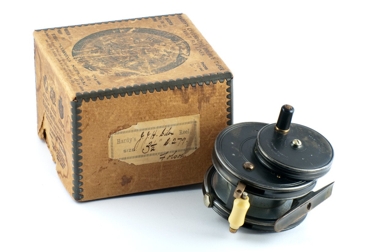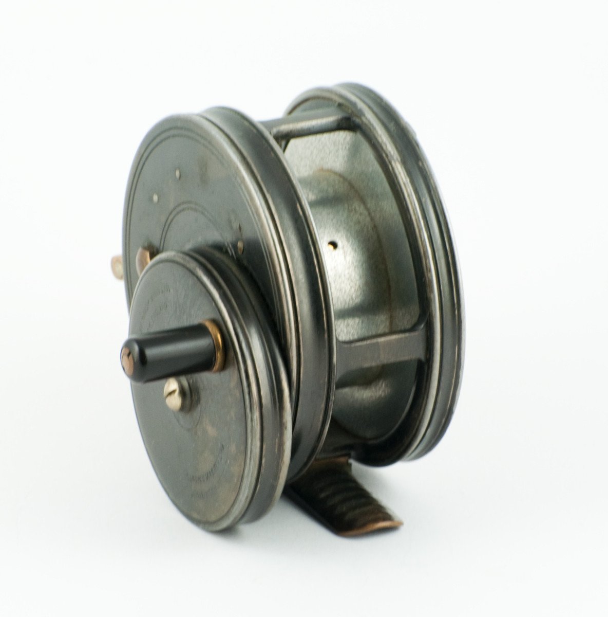 For sale here is a scarce example of the 2 3/4" diameter Hardy Silex Multiplier, catalogued between 1924 and 1937. Designed, said Hardys, as being "suitable for fine fishing in low water". Between John Drewett's Hardy book and other sources, there are believed to have been between approximately 400-550 of these reels ever made and of this amount, 51 were first model reels with the external oil pipe. This one is in excellent plus, smooth free-turning condition. Original unmolested ribbed foot on offset circular drive plate, round waisted ivorine release lever, button-type regulator marked "brake indicator", centrifugal governor, and an external oil pipe from bearing to rim, as well as two interior oil pipes through each the main rim and the drive plate rim. This very well could be a unique transitional reel with a combination of features seen pre- and post-1928. Joe Johnson's initials appear on the inside of the reel. No cracks, chips, or dings. The reel comes with an original box for a 3 1/2" version of the JJ Hardy Silex.