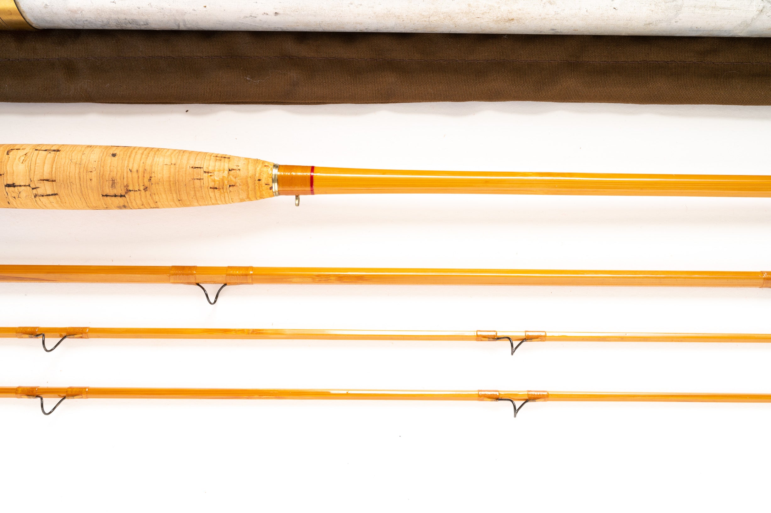 A nice H.L. Leonard fly rod, 8', 3-piece, 2-tip, built for a #4 or #5 line. Pre-fire manufacture. Medium to medium-slow action. Unused since this rod was refinished. The rod has new guides and stripper. 3 up node pattern and oven tempered cane. The main wraps are light tan with red edges at the keeper and male ferrules. The ferrule fit is very tight and the butt female has the patent date. The butt has a large farmers mark discoloration and the refinisher marked the wrap flat and forgot to erase it when the varnish was applied. The cigar grip is a short 4 1/2" long and is ridged from cleaning. The reel seat is varnished butternut with a cap and ring. The butt cap is stamped " H.L.L., H.L. Leonard Rod Co, Makers" in a cartouche. The rod is straight and with the fresh finish it should give many years of fishing service. I suspect the bag is not original as there is no sign of a hangtag ever having been attached. The tube appears to be original.