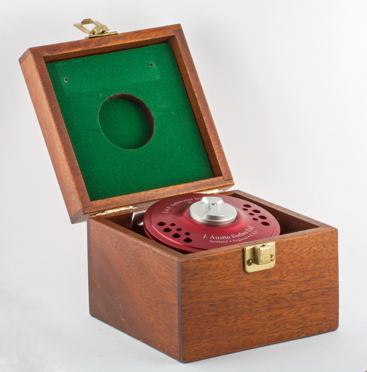 For sale here is a J. Austin Forbes Saltwater Disc Drag II Model 6840 fly reel. Tarpon/Albacore model. 4" diameter made for a 10wt line plus 350 yds of 20' micron. The reel weighs 8.6 oz. Left hand retrieve. Amazing drag strength. Palmable spool flange. Near mint condition with a couple of very minor handling marks. The reel has never been fished. Comes with a felt-lined presentation wooden box.