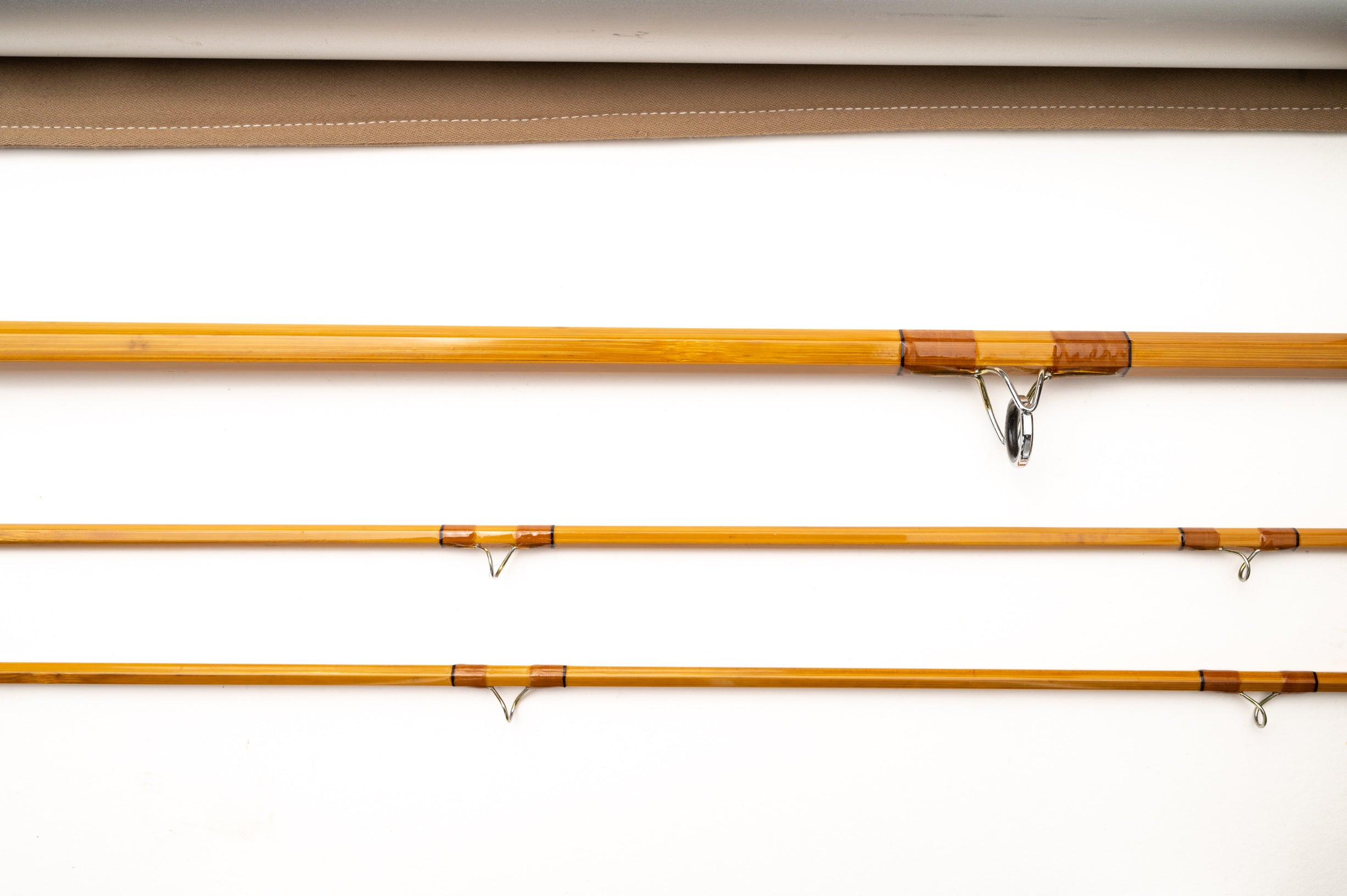 Here we have a Jerry Drake two-handed rod, 10'6", 2-piece, 2-tip, built for a #8 line. Serial number 38, and marked "G243H". 8.1 ounces. Marked 8-1-2008. Full flexing action. Lightly used as the grip is about 95% clean. A varnish chip from a glancing hook blow just below the top stripping guide is the only real sign of use. The cane is a wheat straw color and the nodes seem to be clustered close together (within 2") in a somewhat random pattern. Light tan wraps with black edges. Ceramic stripping guide on the butt with chrome snake guides for the remainder. Very light coat of varnish. A number of the node areas have some filled seams showing and the butt has a 4 1/2" long seam that has been filled in and colored to match the cane. The swiss-style ferrules are bright and the female has a deep trim mark. The tips have the same random node distribution and the nodes themselves are also about 1/4" larger than the butt section. The upper grip is a 9 3/4" half wells with a downlocking screwlock and a hidden pocket cap. Nicely varnished maple insert. The lower grip is 4 1/2" with a large black rubber button. The rod packs into a tan cloth bag and an aluminum tube.