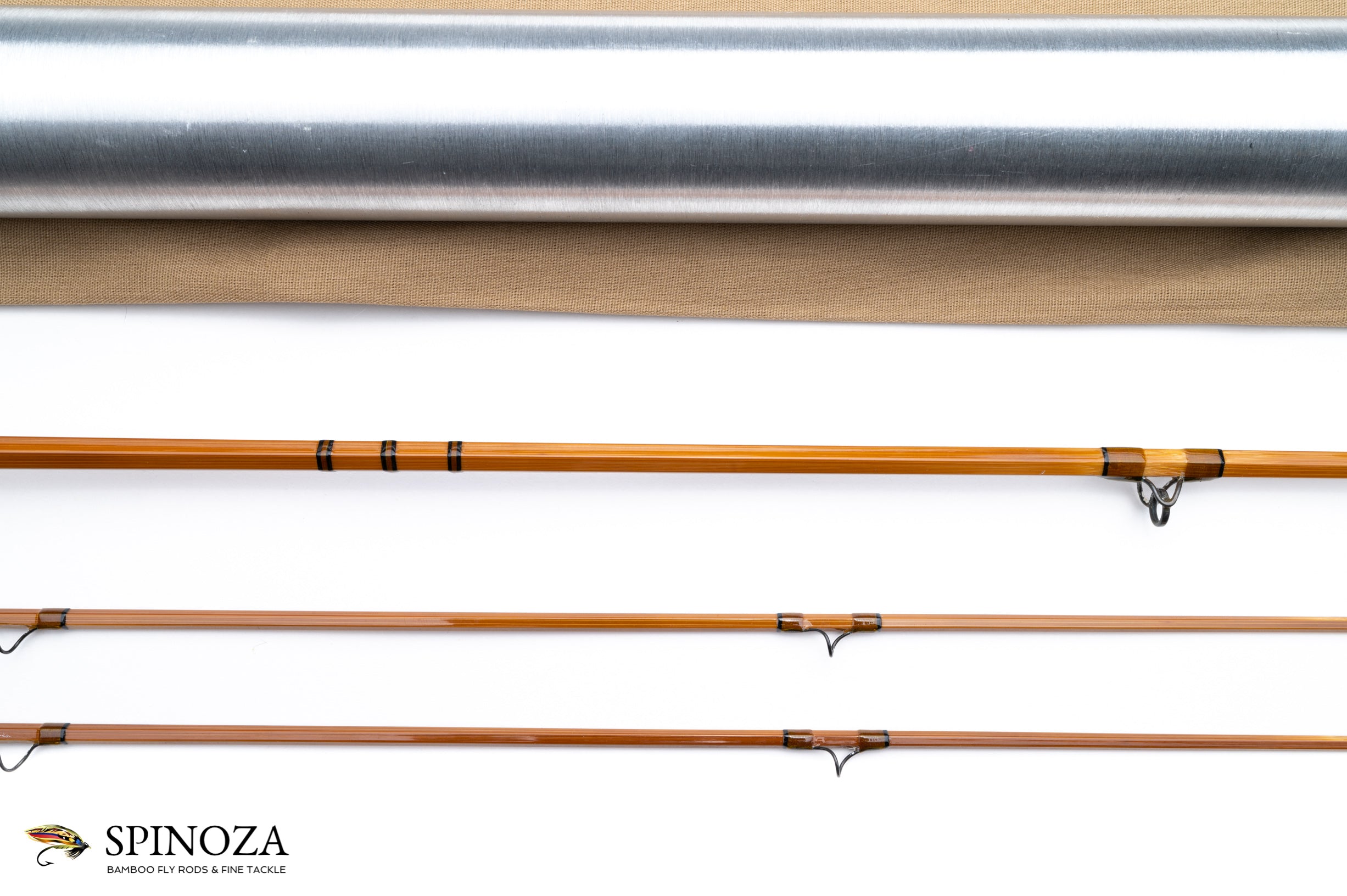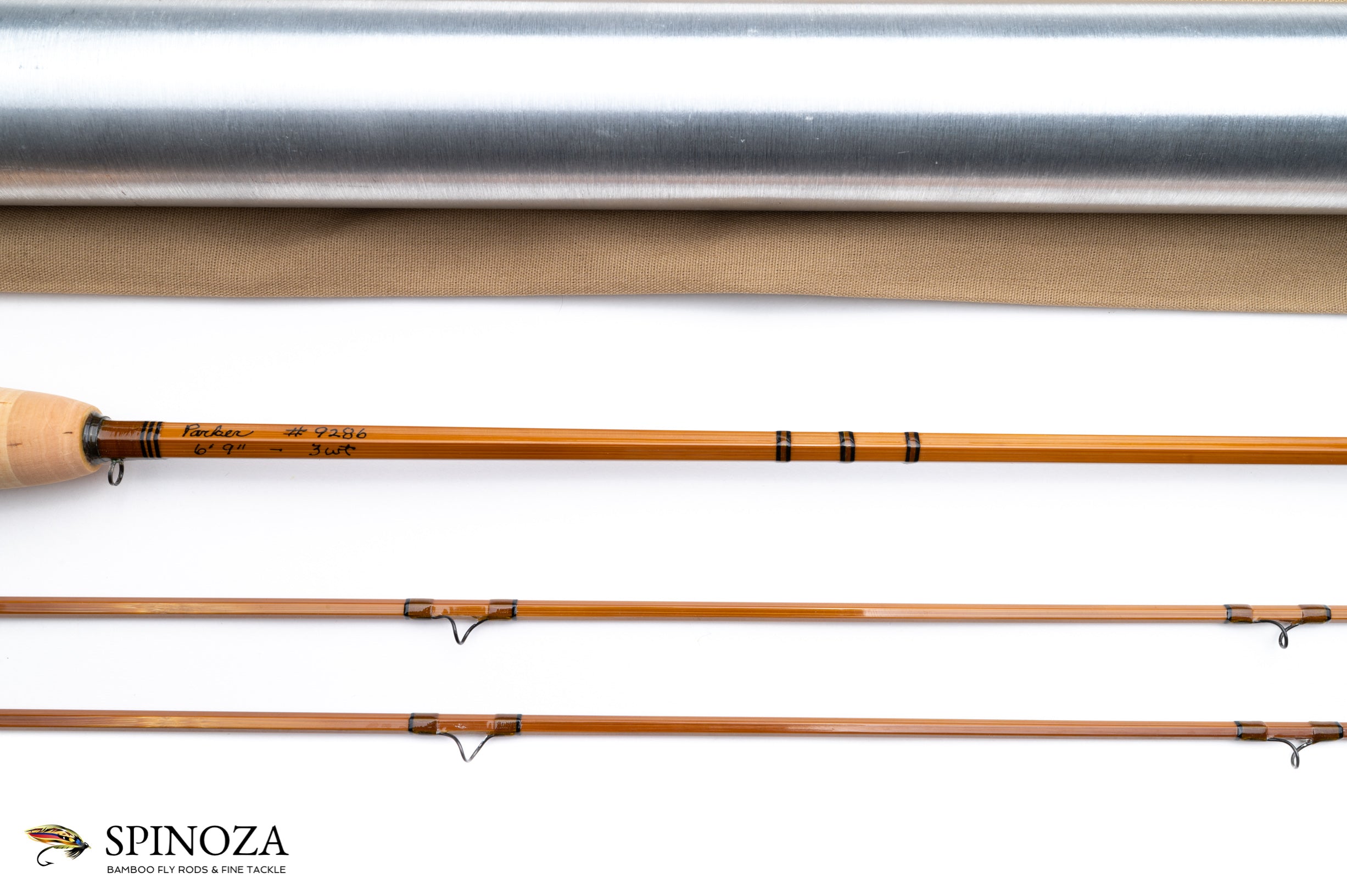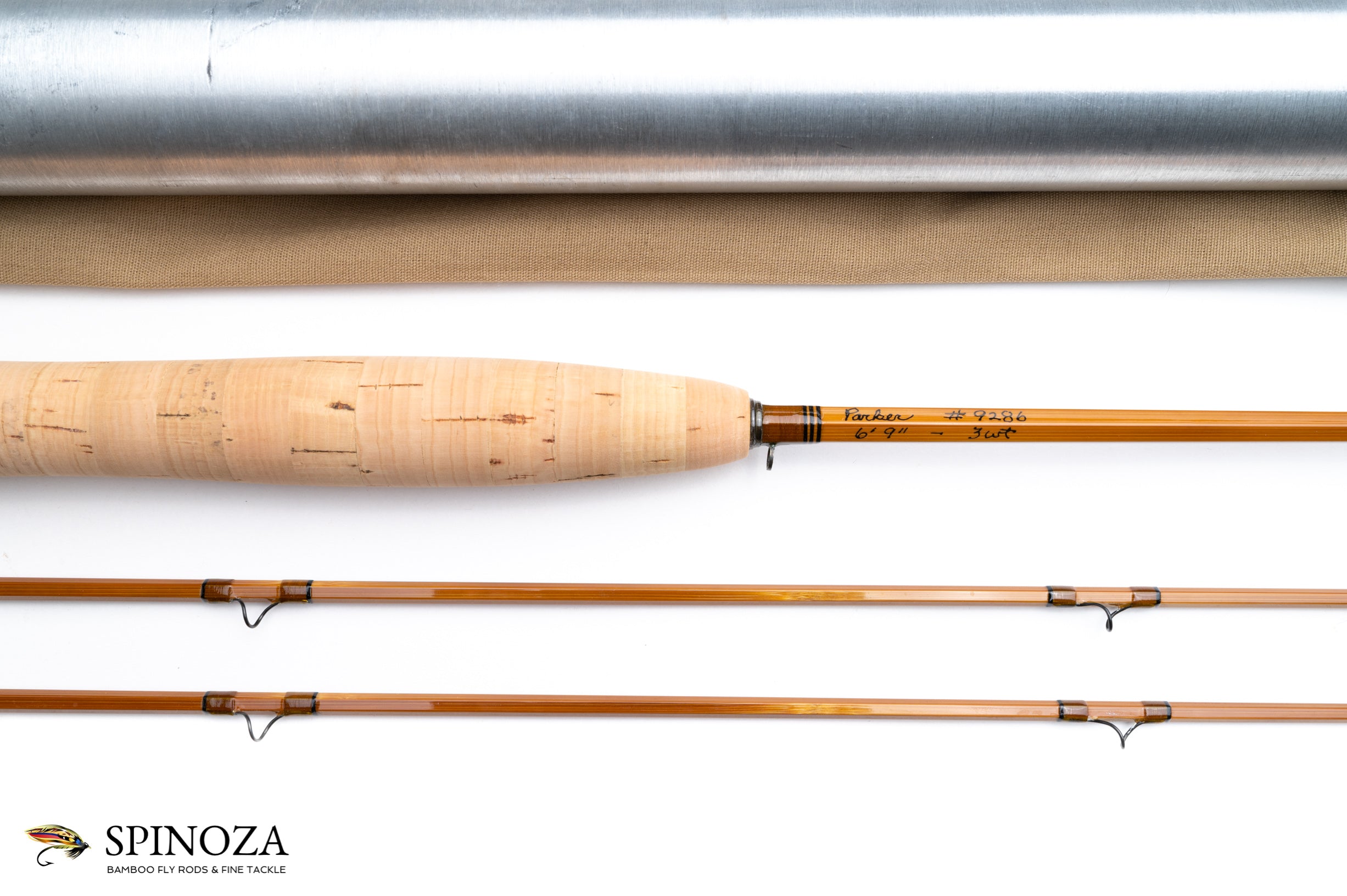 A nice John Parker fly rod, 6'9", 2-piece, 2-tip, built for a #3 line. Fast action. Mint or lawn cast only. Spiral node pattern in a lightly flamed cane. Mirrored tips. The wraps are a light transparent tan with black edges on all wraps. An extra band of red differentiates the two tips. Carbide stripper and HSS snake guides. The varnish is excellent, however it has been rubbed out and the rubbing compound was not cleaned away from the guide feet. All hardware, including the swiss ferrules, have been oxidized. The grip is rather large for a 7' rod, coming in at 7" and generously proportioned in a western profile. The reel seat wood is a highly figured mortised walnut and has an uplocking seat. The seat is properly proportioned as it fits and locks down a Hardy foot. Some sculpted walnut caps the seat and keeps the narrow payne style band in place. The rod comes in a light brown bag with a stiffener and a brushed aluminum tube with brass fittings.