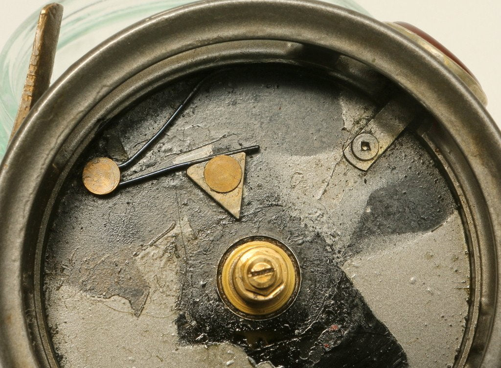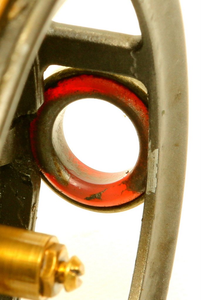 An interesting reel – someone has painted / sprayed / enamelled the reel (personally I’d give her a dip in paint stripper and fish happy with the result). Brass foot is 2 ¾” long and original, slightly battered but should fit most reel seats, diminutive erinoid handle, minimal spindle play. Thick dark red agate with no cracks or chips.