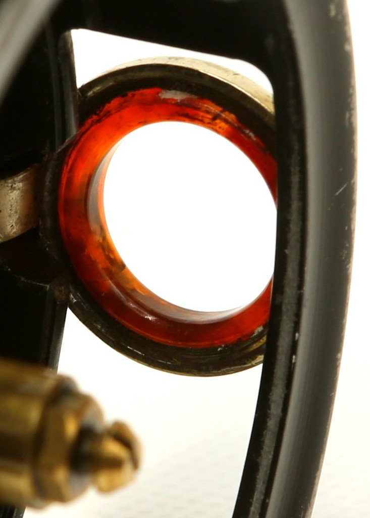 Smooth brass foot with original lacquer is 2 ¾” long and doesn’t have any signs of ever being on a reel seat. Neat black ebonite handle, rim mounted tension adjuster, no transverse or lateral spindle play. Pale red agate with no visible cracks or chips.