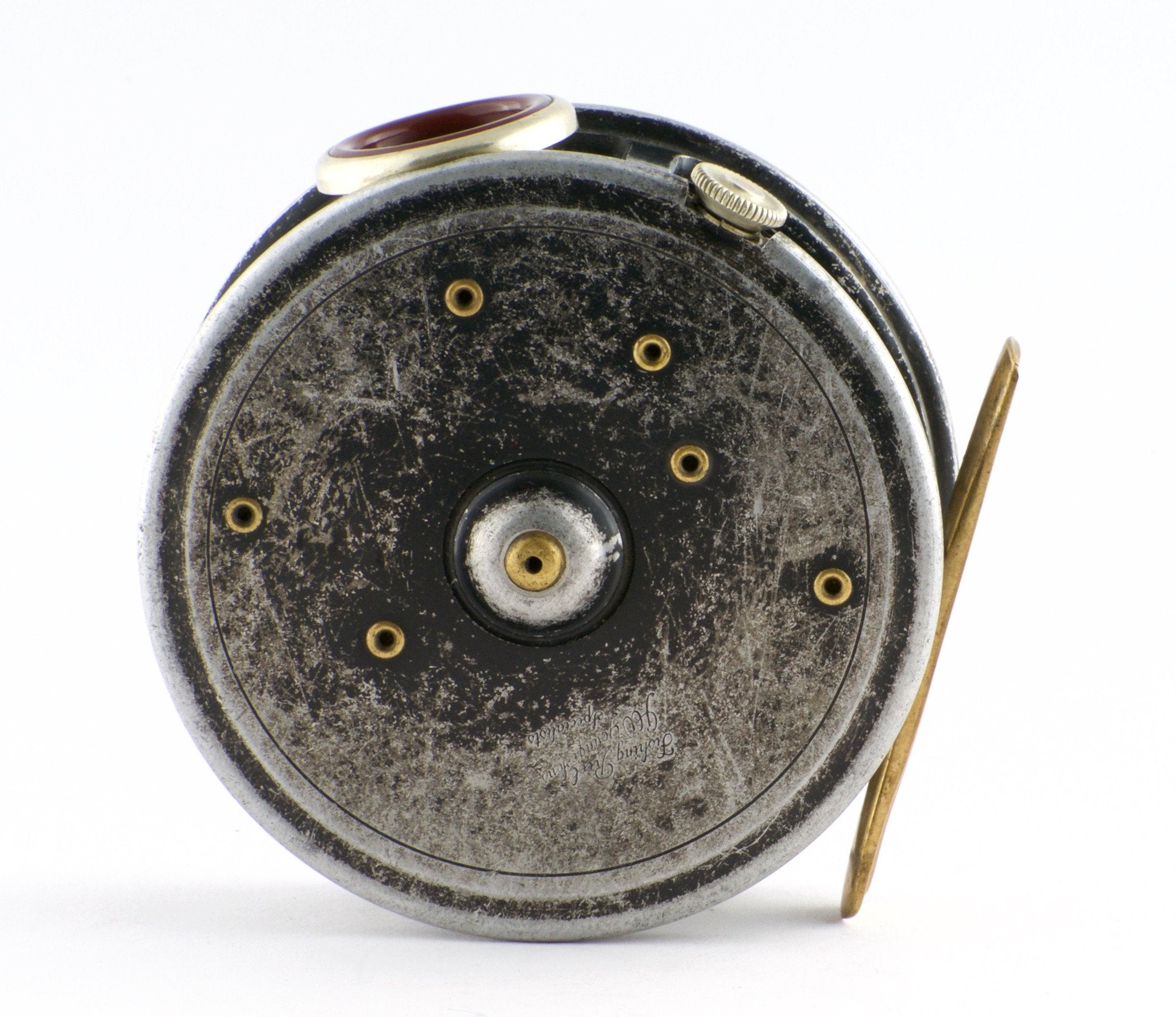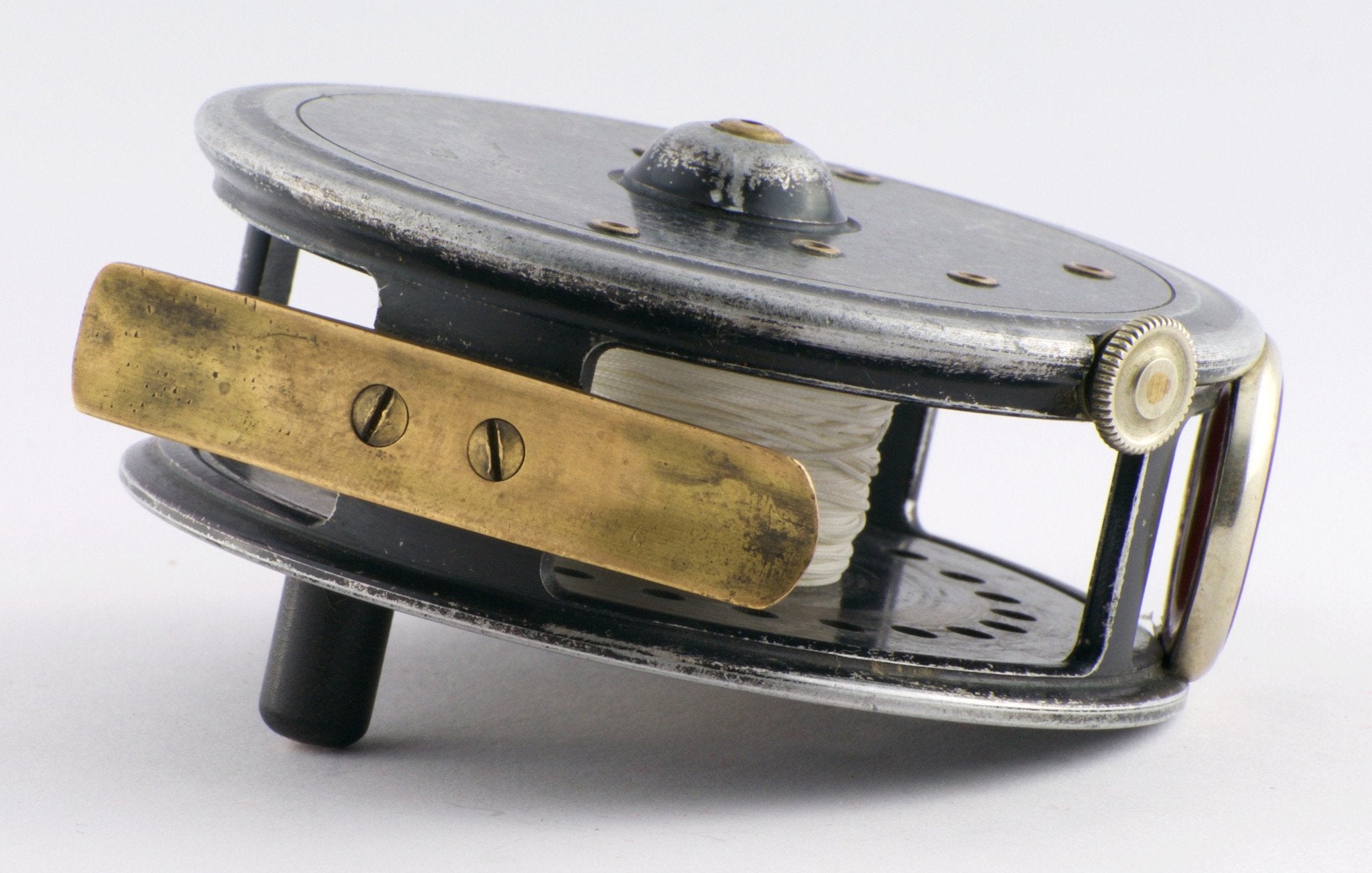 For sale here is a 3 3/8” Young’s made Pattern 15A reel with their own stamped logo on the frame. Two screw latch, black enameled finish with normal wear. Foot is original and unmolested, ebonite handle, no undue spindle play. Dark red agate in perfect order. A 3-3/8" pattern 15A will hold a modern DT6 with 75 yds backing.