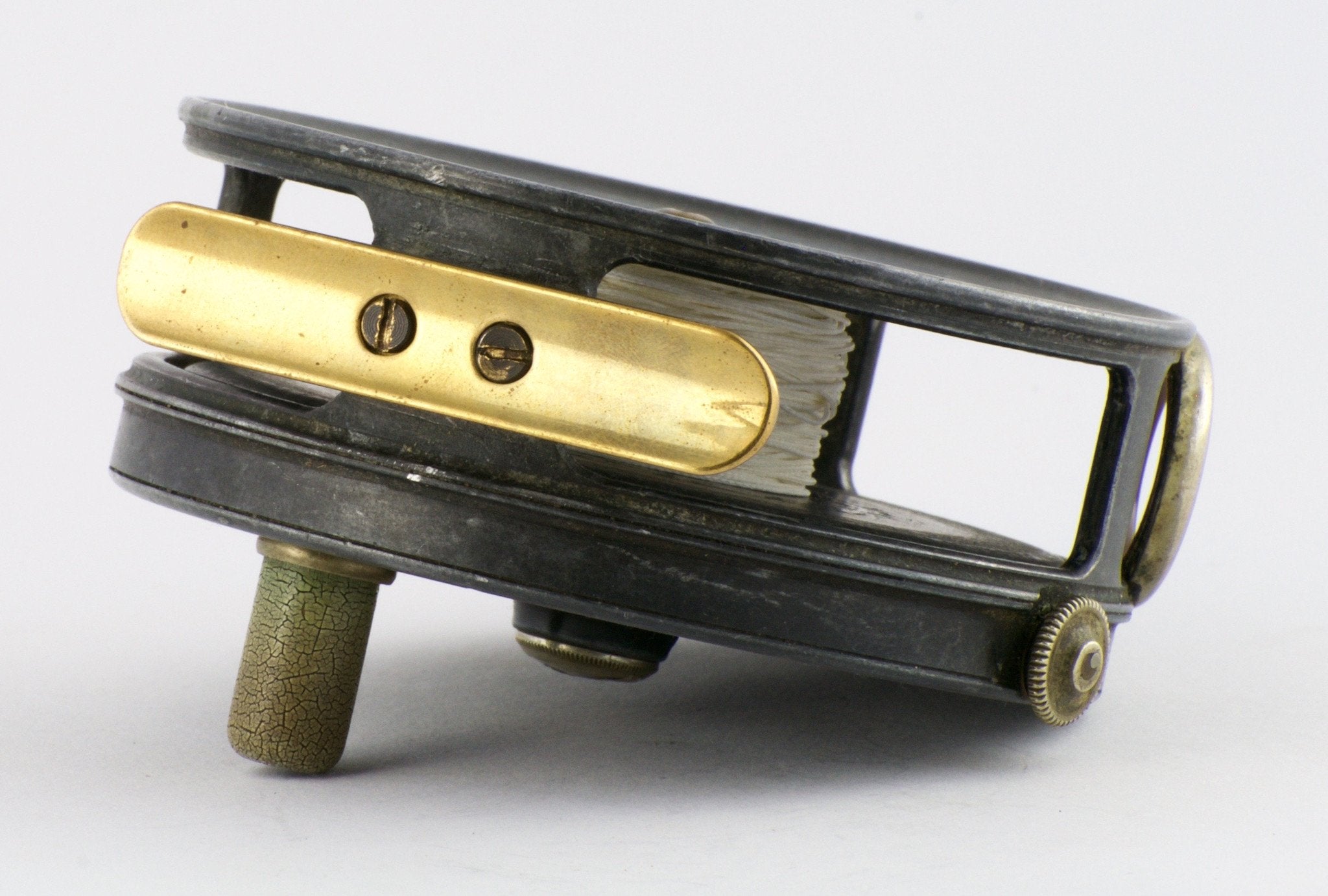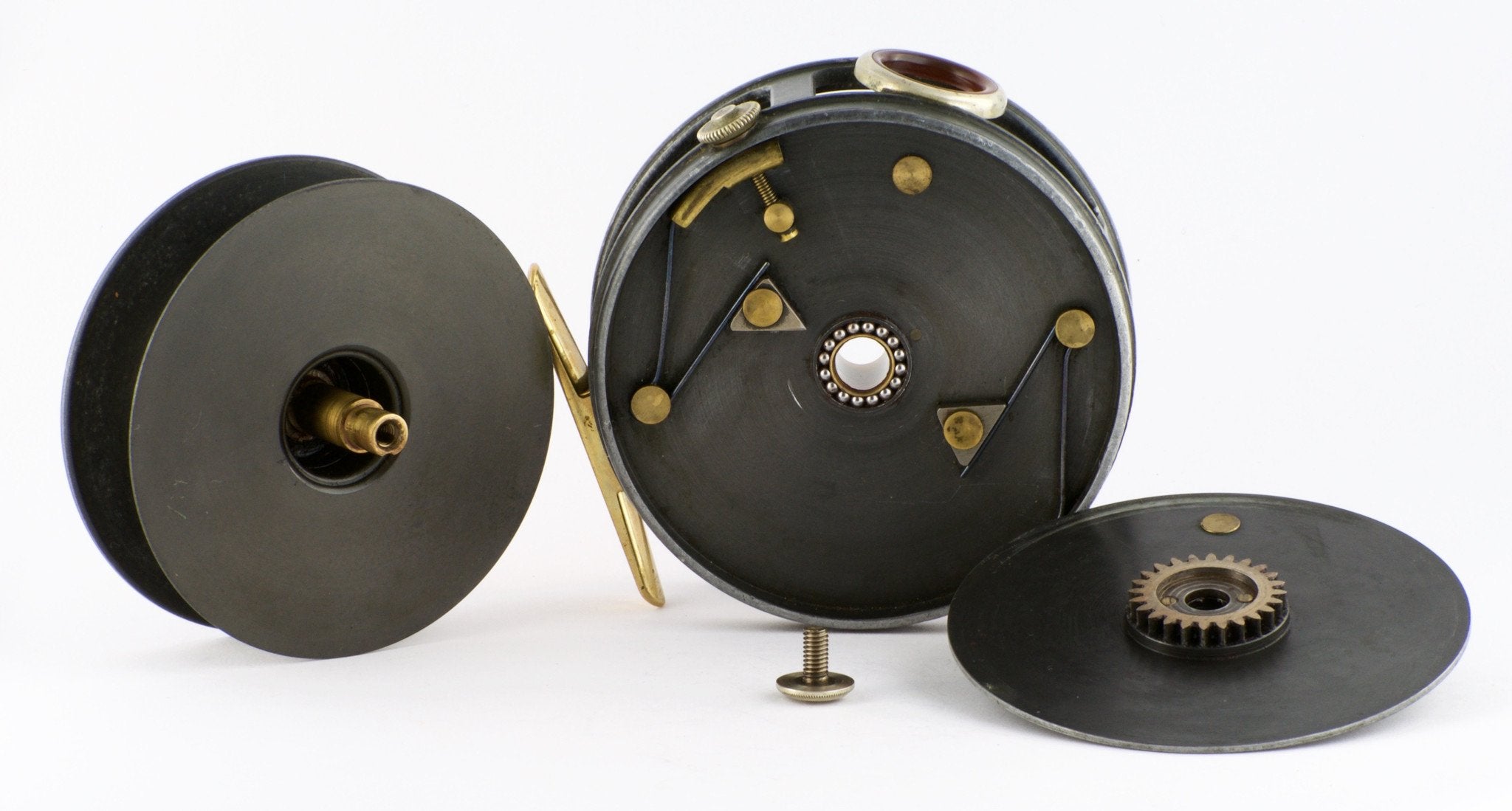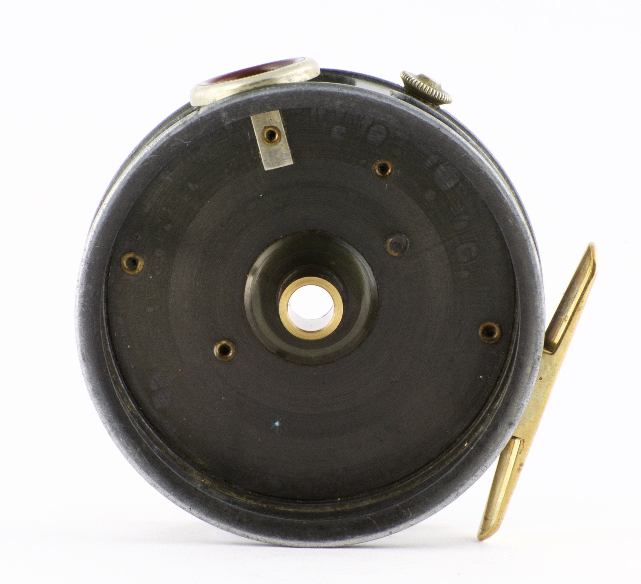 For sale here is a nice Young Pattern 16A fly reel with a beautiful red agate line guide. Made for A. Carter & Co. England. Diameter is 3 1/2". The brass reel foot is a nice replacement. Most of the leaded finish remains, which is very rare for these reels. Coin-edge tensioner works perfectly. Dual pawls. Negligible spool wobble/end play. Agate is uncracked.