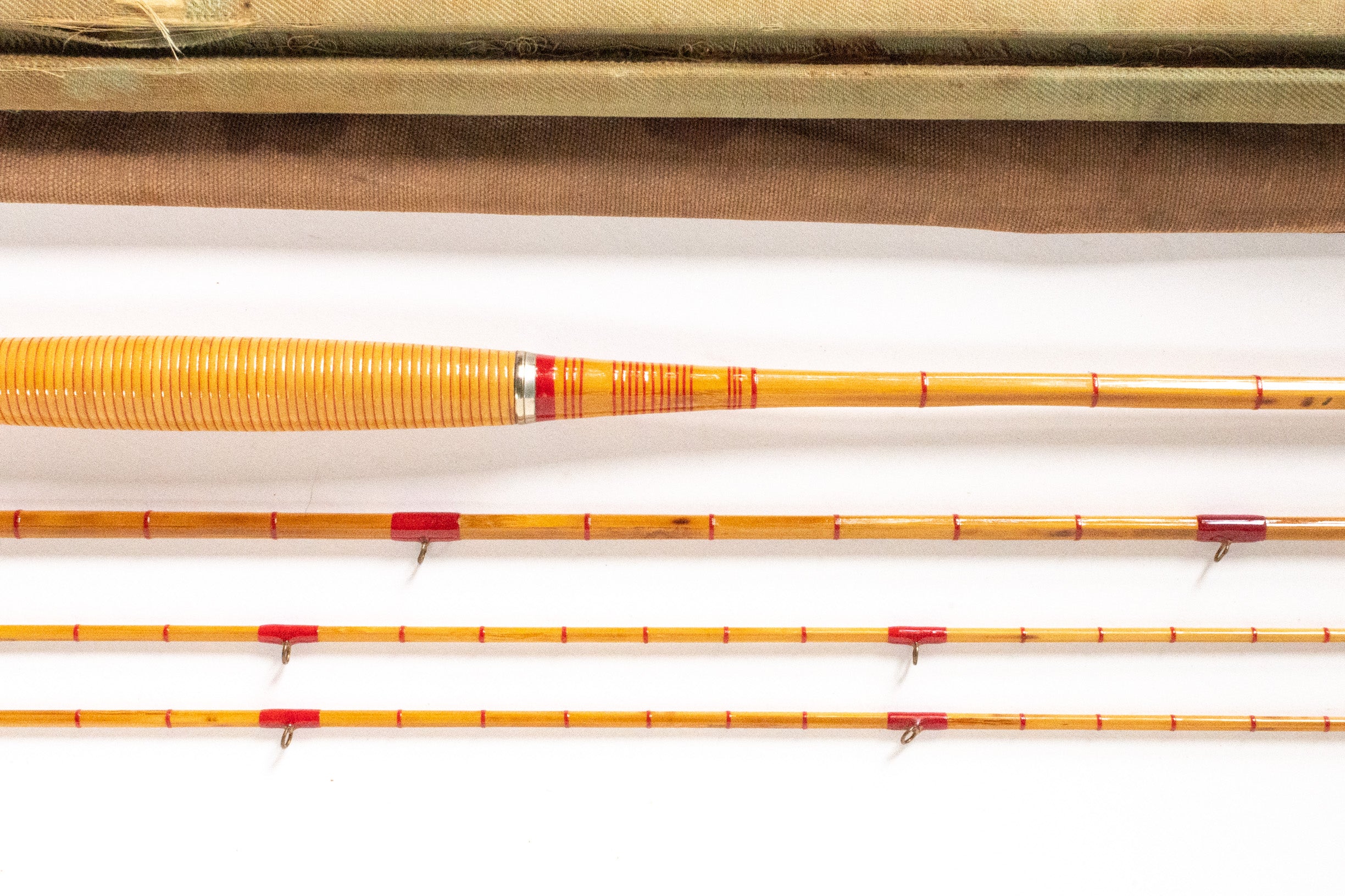 An antique HL Leonard fly rod, 9', 3-piece, 2-tip, built for what feels to me like a #4 and possibly even a #3. Refinished condition. Calcutta cane. Very full flexing. 5.8 ounces. One tip is 3/4" short. The rod has been re-wrapped in Chinese red and re-varnished. Flip ring guides and stirrup tip tops. The ferrules are the pot belly style and the female has the patent date. The handle is rattan with Chinese red silk. The nickel silver all metal seat is a slide band and soldered hood constructed of rolled and soldered sheet stock. The seat is engraved with a prior owner's name "C.H. Hayes" and has the rarely seen die stamp "HL Leonard Makers, W. Mills + Son, New York, Sole Agents" in an oval cartouche. As always, this handmade hardware is a treat to examine. The rod packs into a form case without the tie strings. The owner has added a non-original bag which all packs into a canvas and leather carry case (though it is in somewhat poor condition).