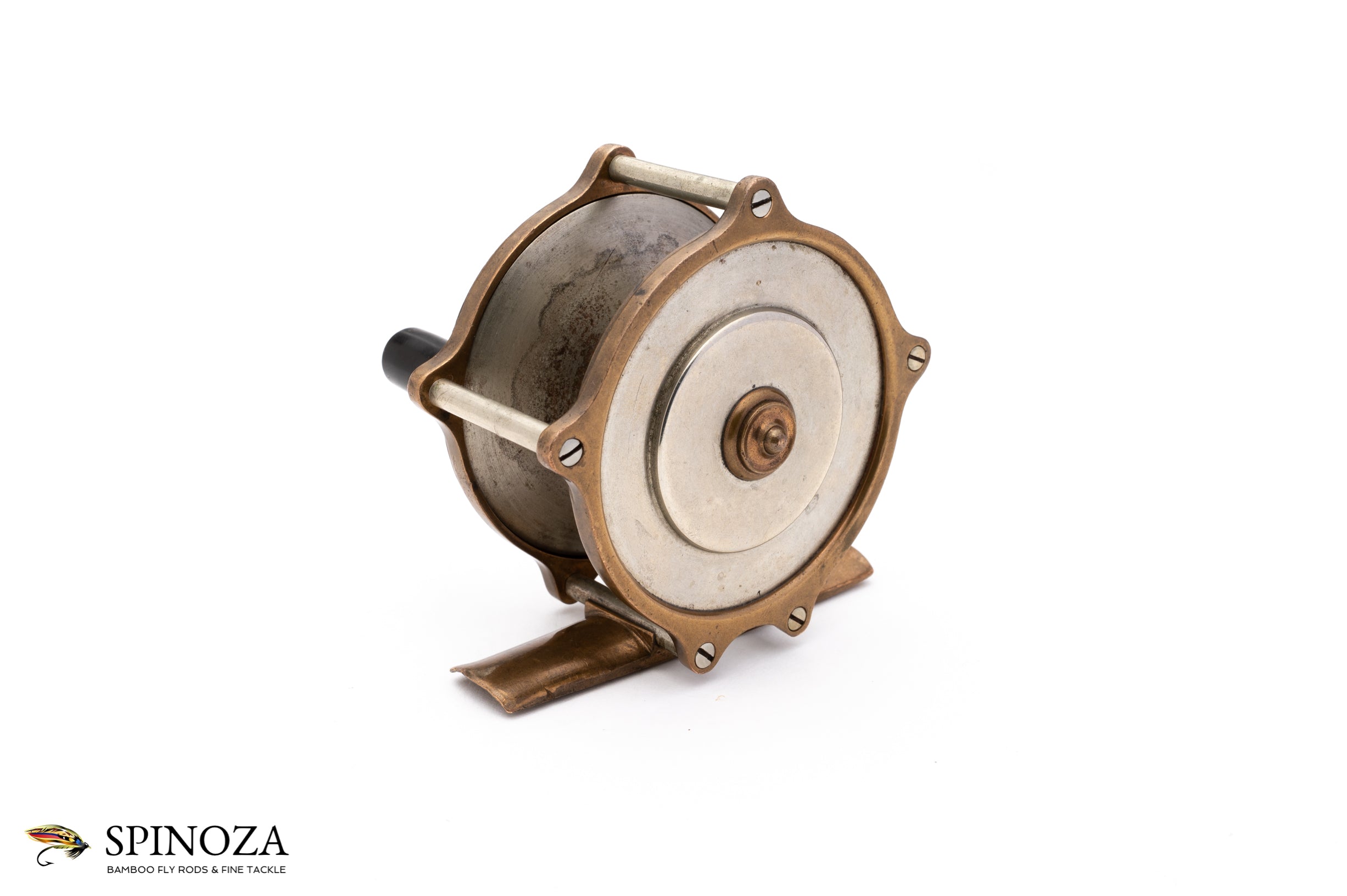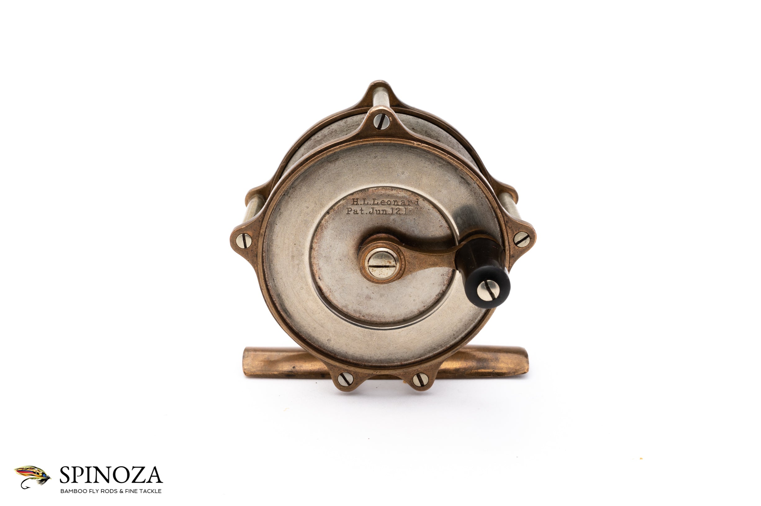 A beautiful little H.L. Leonard, Pat. 1877 bi-metal fly reel. Here is what many consider to be the classic American fly reel as made by Francis Philbrook and Edward Payne. 2 1/2" diameter with a 1" spool width. This one, with the name and patent date, is considered by most to be the first of these raised pillar reels, although several reels have surfaced that have the Leonard name in a cartouche, possibly stamped as such before the patent date was assigned. This example does not have any missing or replaced parts, and the click is strong and favors RHW. A superb example of this early Leonard model!