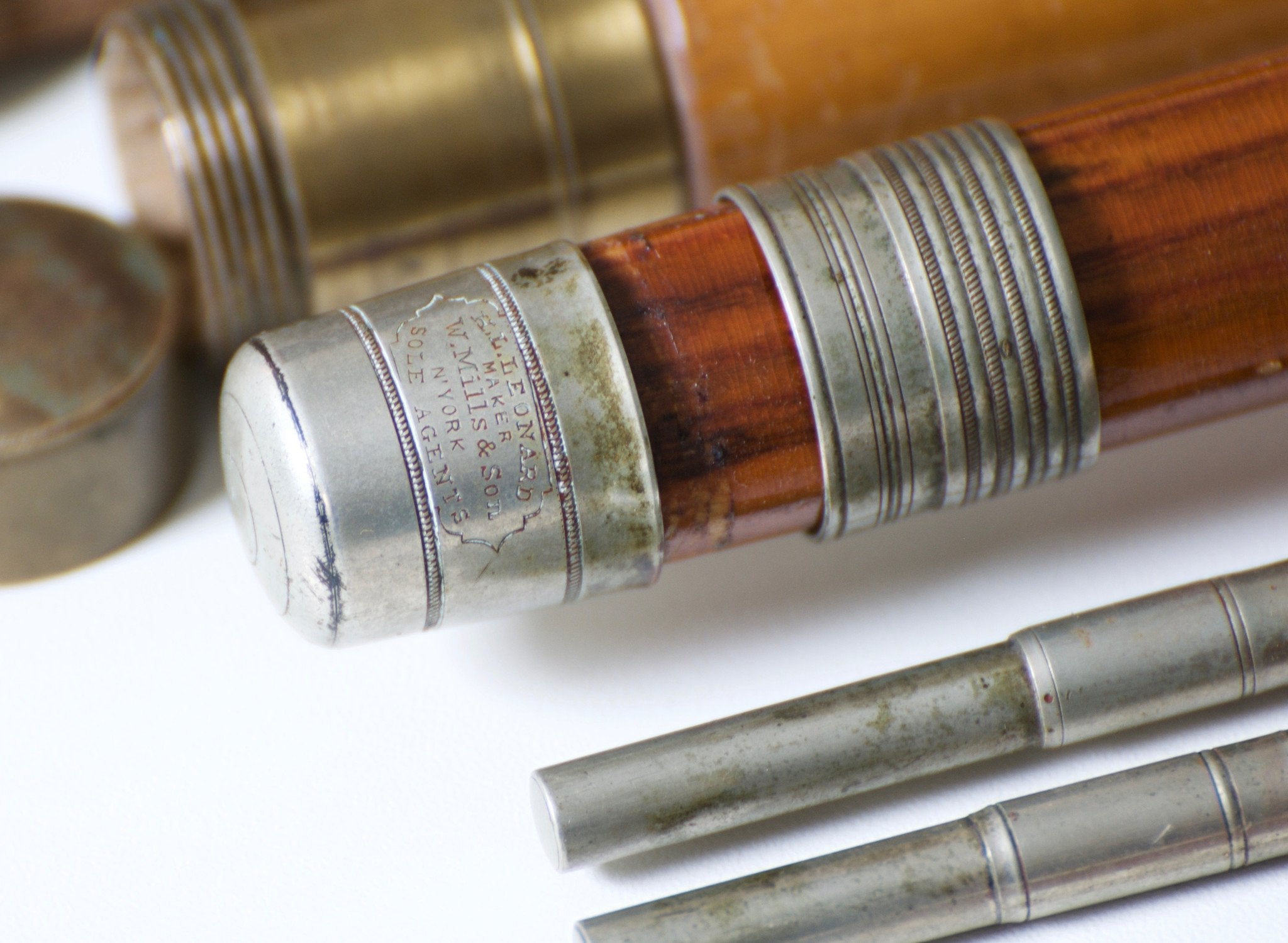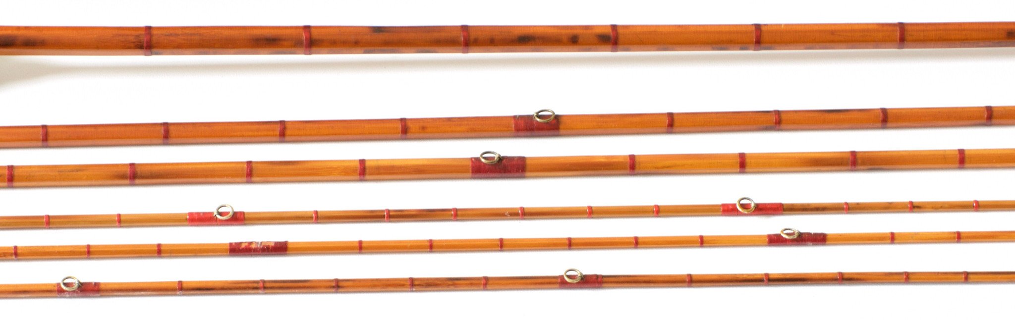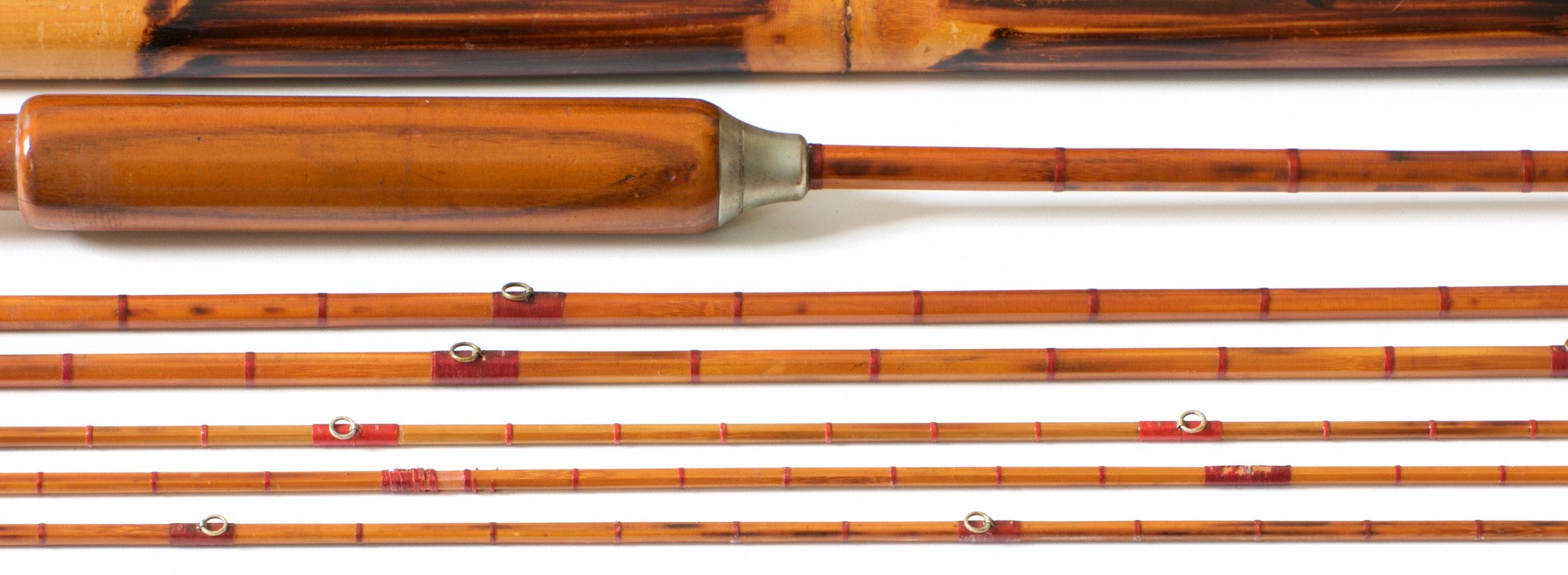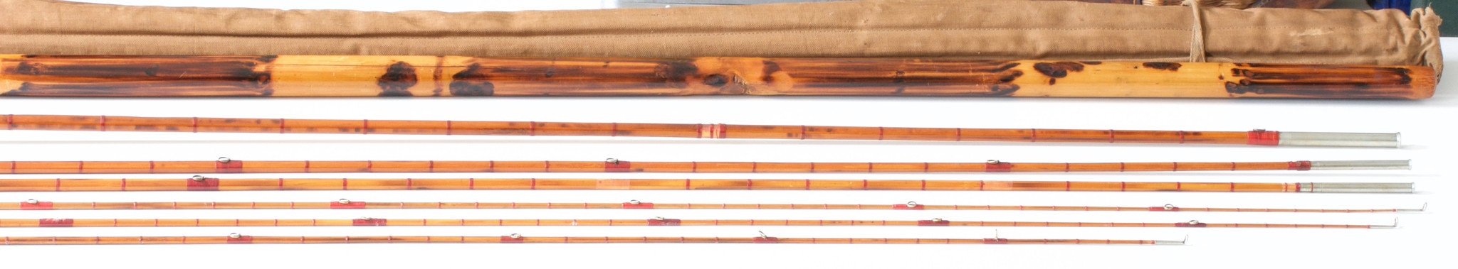 For sale here is an early 9 foot H.L. Leonard bamboo rod. Circa 1890-1900 -- the "Sole Agent" era. All Cap and ring reel seat. Mortised grip with large German silver winding check reminiscent of the Kosmic. Full intermediate wraps. Two mids and three tips. The rod overall is in good condition, partially refinished and missing a few flip guides. The rod weighs ___ oz. Size __/64 and __/64 ferrules with a good fit. Complete with original bag and tube.