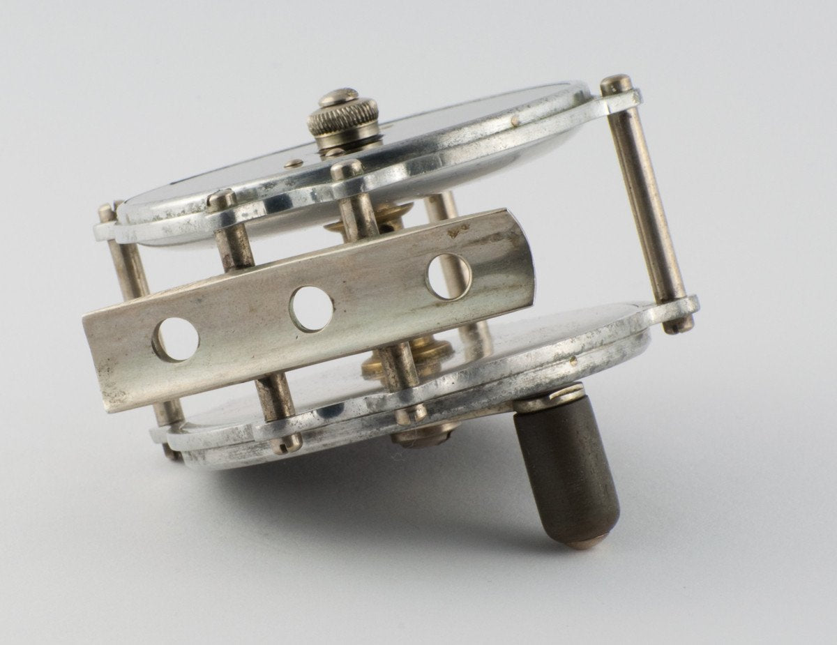 For sale is a late era Leonard Mills Model 50A raised pillar fly reel. Excellent condition. 3 inch diameter including pillars. 7/8" wide spool. The nickel silver foot is unmolested. Probably made in the 1950s. The reel winds properly and has a right-hand retrieve bias. This is a very popular classic reel and holds a DT5 plus an ample amount of backing. The reel weighs 4 1/2 oz.