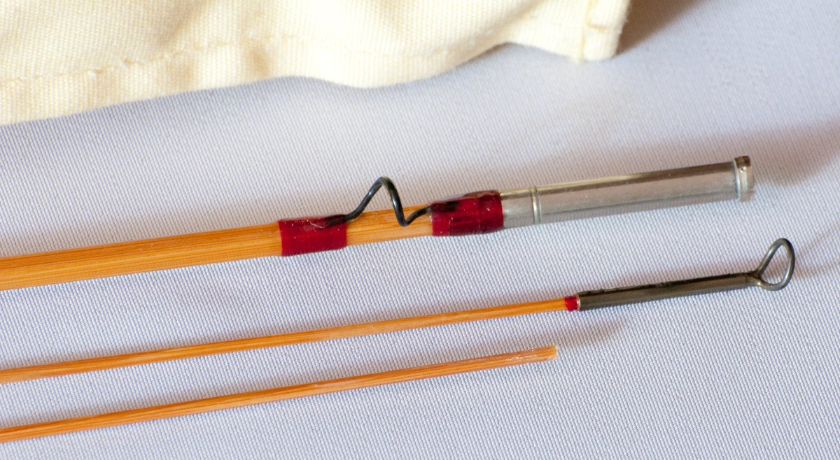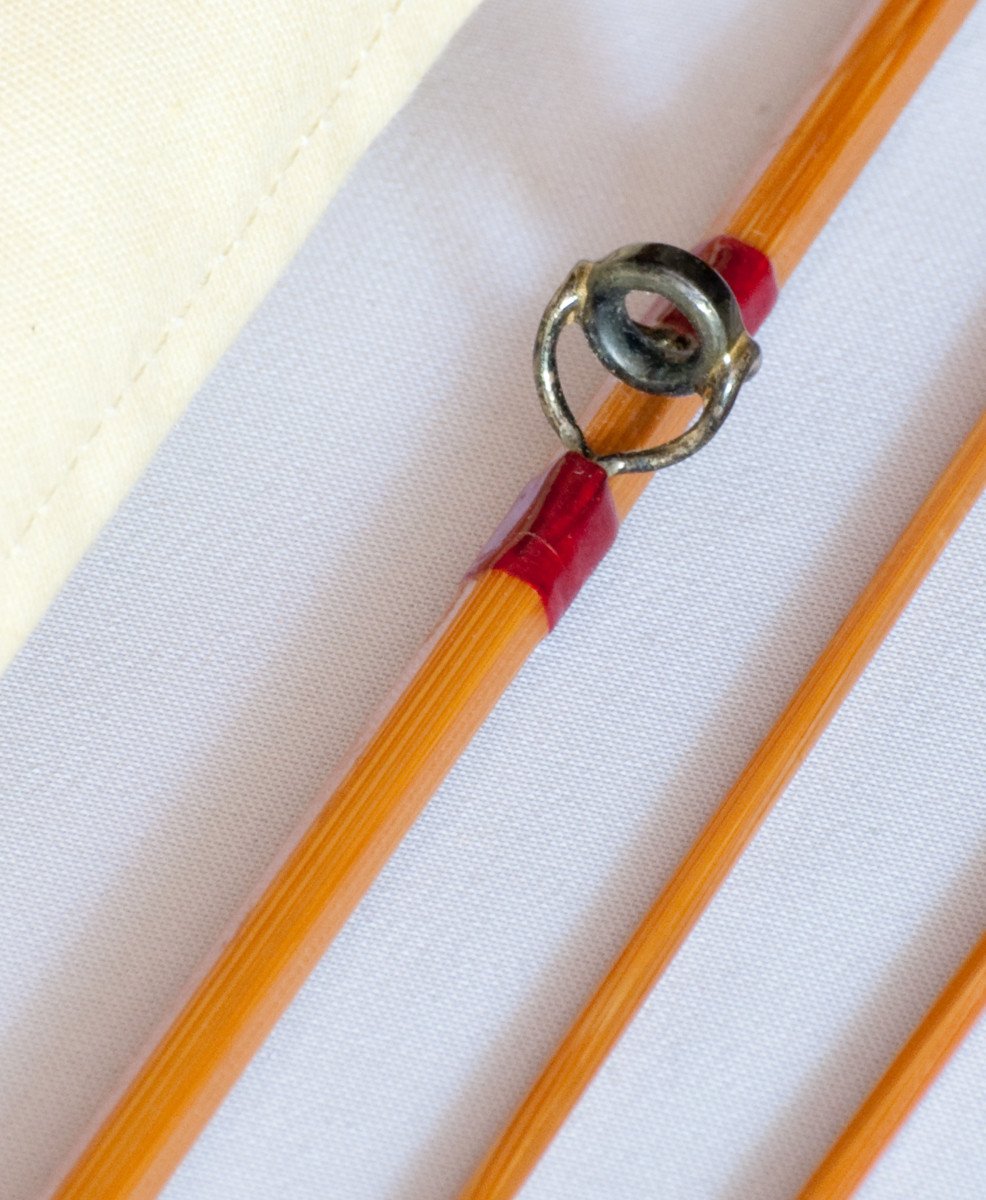For sale here is a Leonard Model 37 Baby Catskill bamboo rod. Post-fire rod with serial number 1283. Cap and ring (the “wedding band” style) reel seatover butternut spacer. The cigar grip has some slight soiling.Excellent original condition with the exception of one tip being broken right at the tip top. That same tip has a set in it as well. The rod weighs 1 1/4 oz. Size 7/64 ferrules. Red silk wraps. Complete with original bag (with stiffener) and tube before they instituted the red labels.