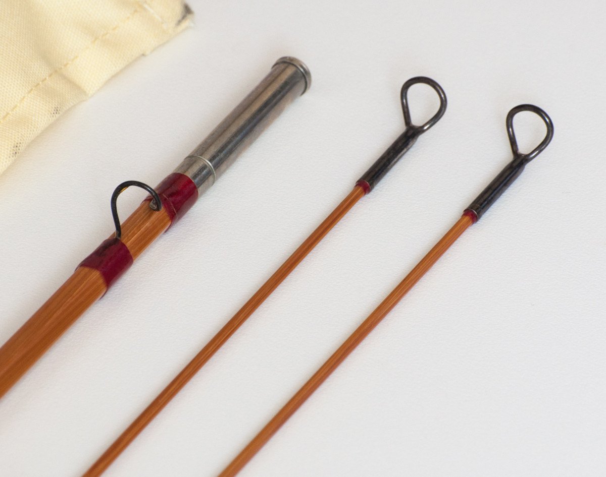 For sale here is a HL Leonard Model 39 bamboo rod. 7'6 2/2 for a 5 weight line. The rod weighs 3.45 oz. and appears to be in unused condition with original bag and labeled tube. All sections are full-length and straight. Down-locking aluminum reel seat. Red wraps with green edges at winding check and male ferrules. The ferrules are 12/64 and the ferrule fit is excellent. It doesn't get much better than this!