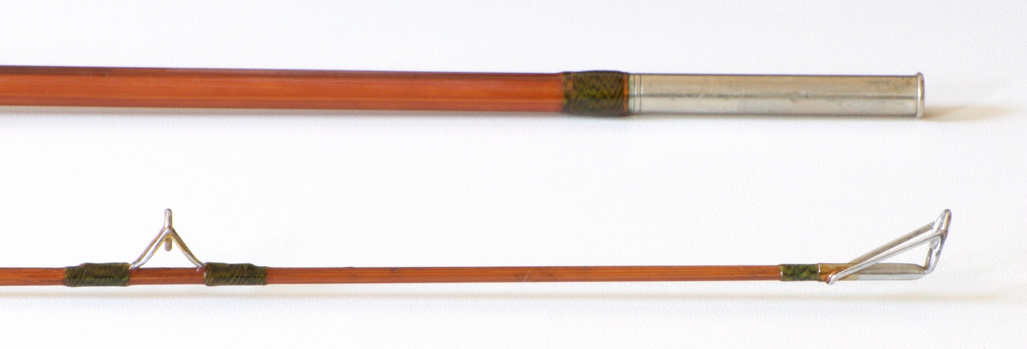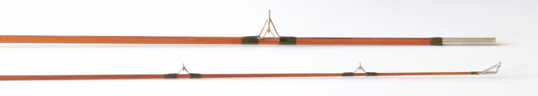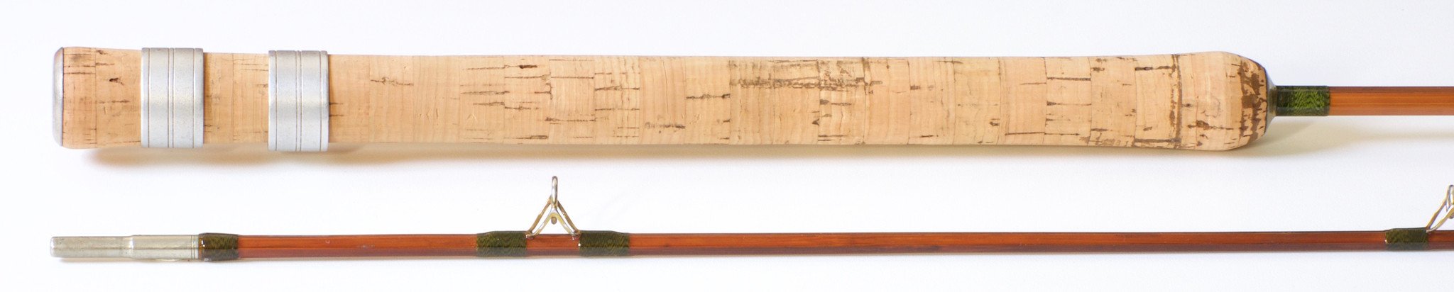 For sale here is a "Linecaster" 7' spinning rod. Two piece configuration. The rod is in excellent condition. The guides have been rewrapped and match the old wraps quite nicely. Green and black jasper wraps with a black band signature wrap. The ferrules fit snugly.. The cork grip is in excellent condition as are the aluminum sliding bands. Ferrule size 14/64. Rod weighs 4.75 oz. No bag or tube. Maker unknown.