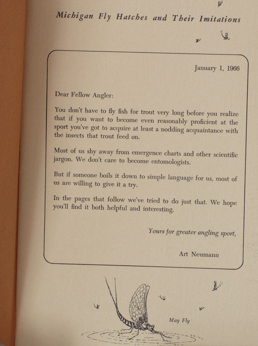 For sale here is a fine example of Art Neumann's "Michigan Fly Hatches and Their Imitations". 16 pages. 1965. This is a stellar example of a very wonderful guide to Michigan hatches, published by the Wanigas Rod Company.