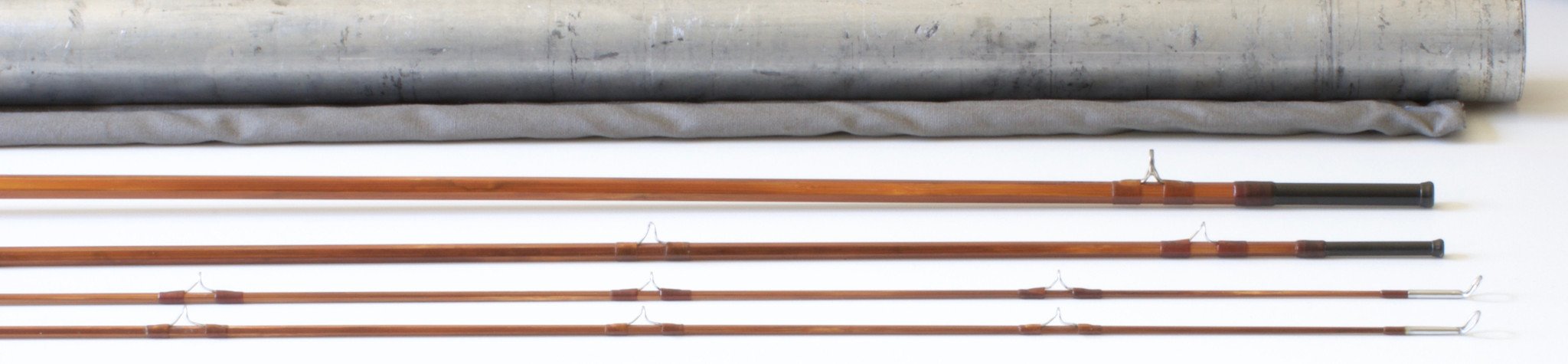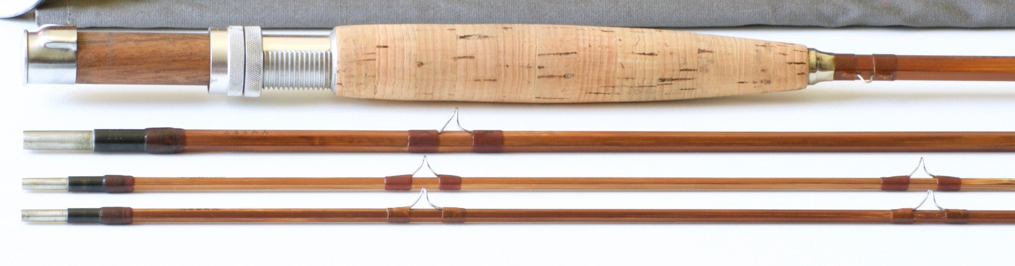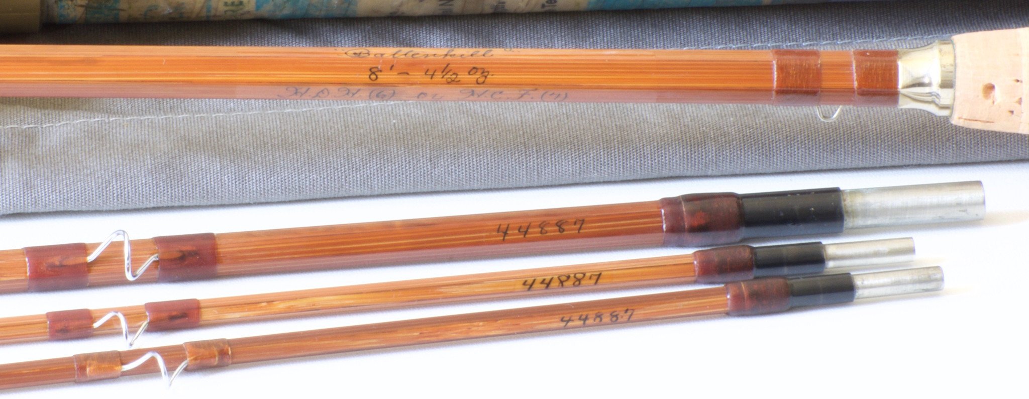 For sale here is an 8' 3/2 4 1/2 oz. Orvis Battenkill impregnated bamboo rod. Best with a 6wt line in my opinion. Serial #44887 made in 1966. The consignor purchased the rod as a one-tip rod from Len Codella in 2001. Orvis then made a 2nd tip for the rod. The rod is in excellent plus condition. All sections are full length and straight. Original bag and labeled tube. Ferrules are size 16/64 and 10/64 with an excellent fit. Aluminum down-locking reel seat. Medium action.